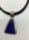 H233 Halskæden har en blåt vedhæng som lapis i en trekantet form, hængende på sorte snore. Metalfinish.