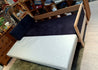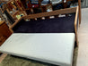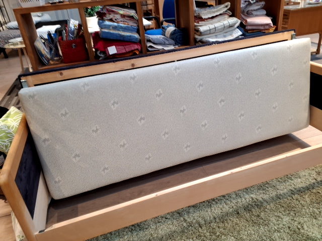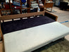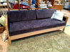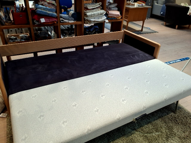 Sofaen har en træramme i bøgetræ - sofa delen med en blød, polstret springmadras betrukket med blåsort alcantare stof. Sofadelens længde 200 cm bredde 80 cm. Under den polstrede madras gemmer sig en upolstret springmadras. Sovesofaen er således opdelt i to sektioner med forskellige teksturer. Måler udslået 140 x 200 cm. Velegnet både til stue eller ungdoms/børneværelse.