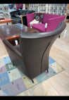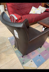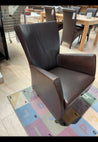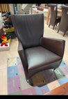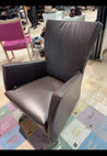 Stolen har en moderne design med højt rygstøtte og brede armlæn. Den er polstret med mørkt læder, som giver en elegant og stilfuld finish. Benene er stabile og lavet af metal.