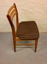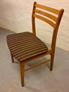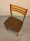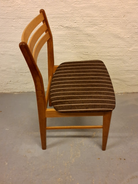 Stolen har en simpel, elegant design med et træstel og en polstret sæde i stribet stof.