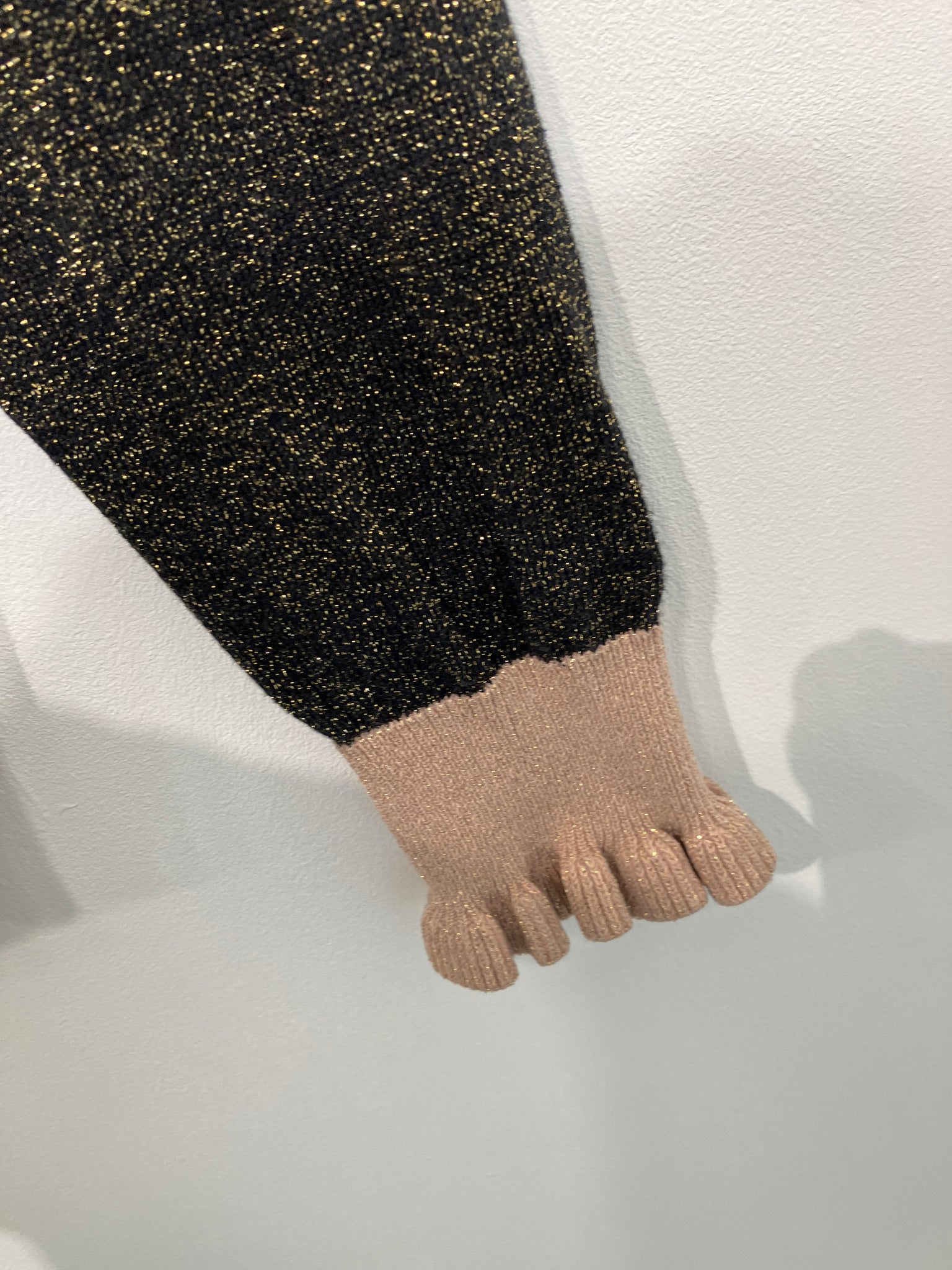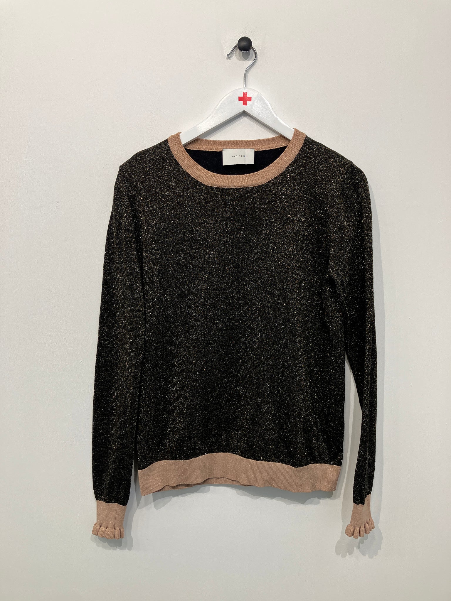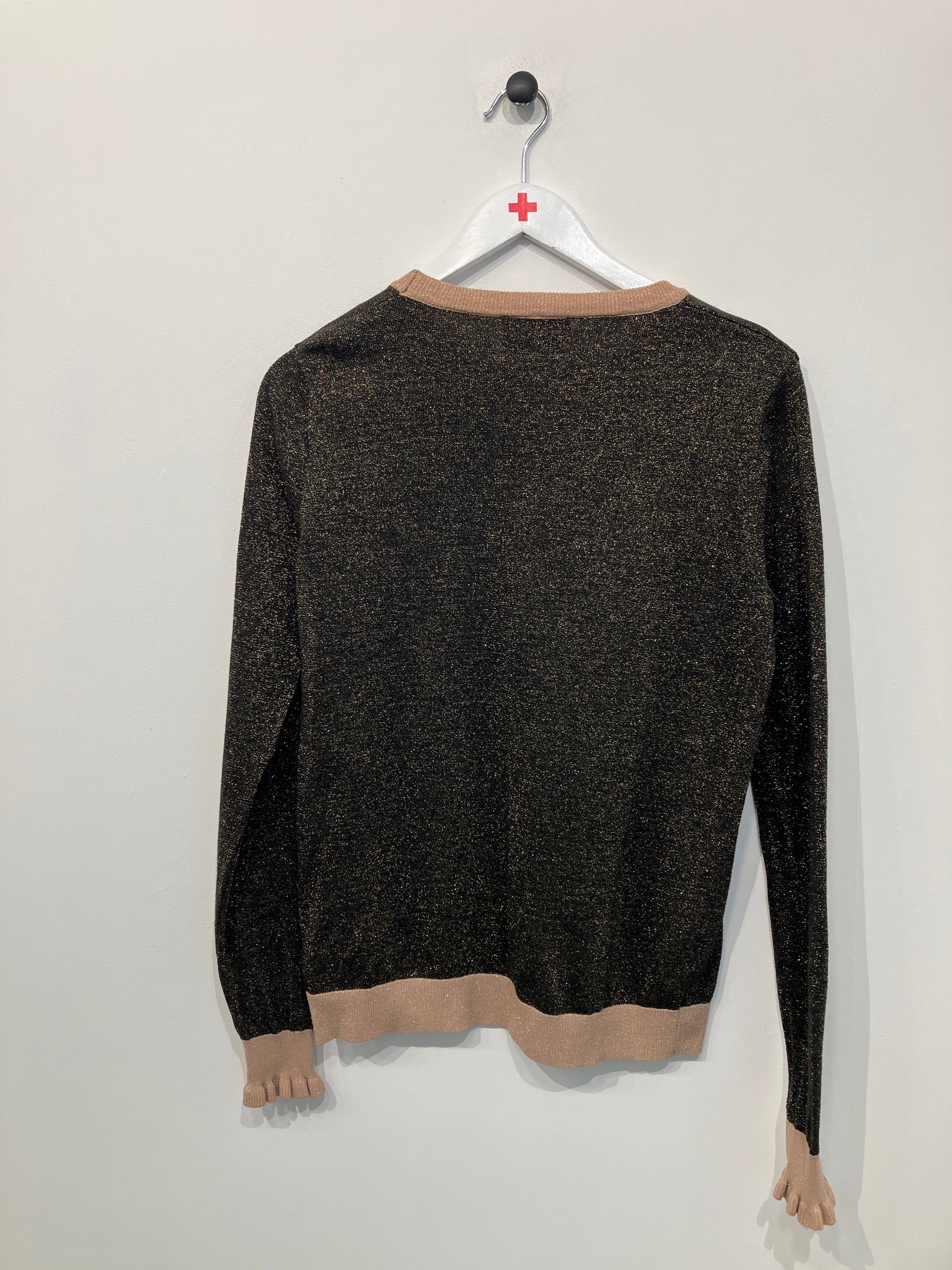Lækker strik bluse med lyse kanter hvor vaske mærket er klippet af.