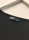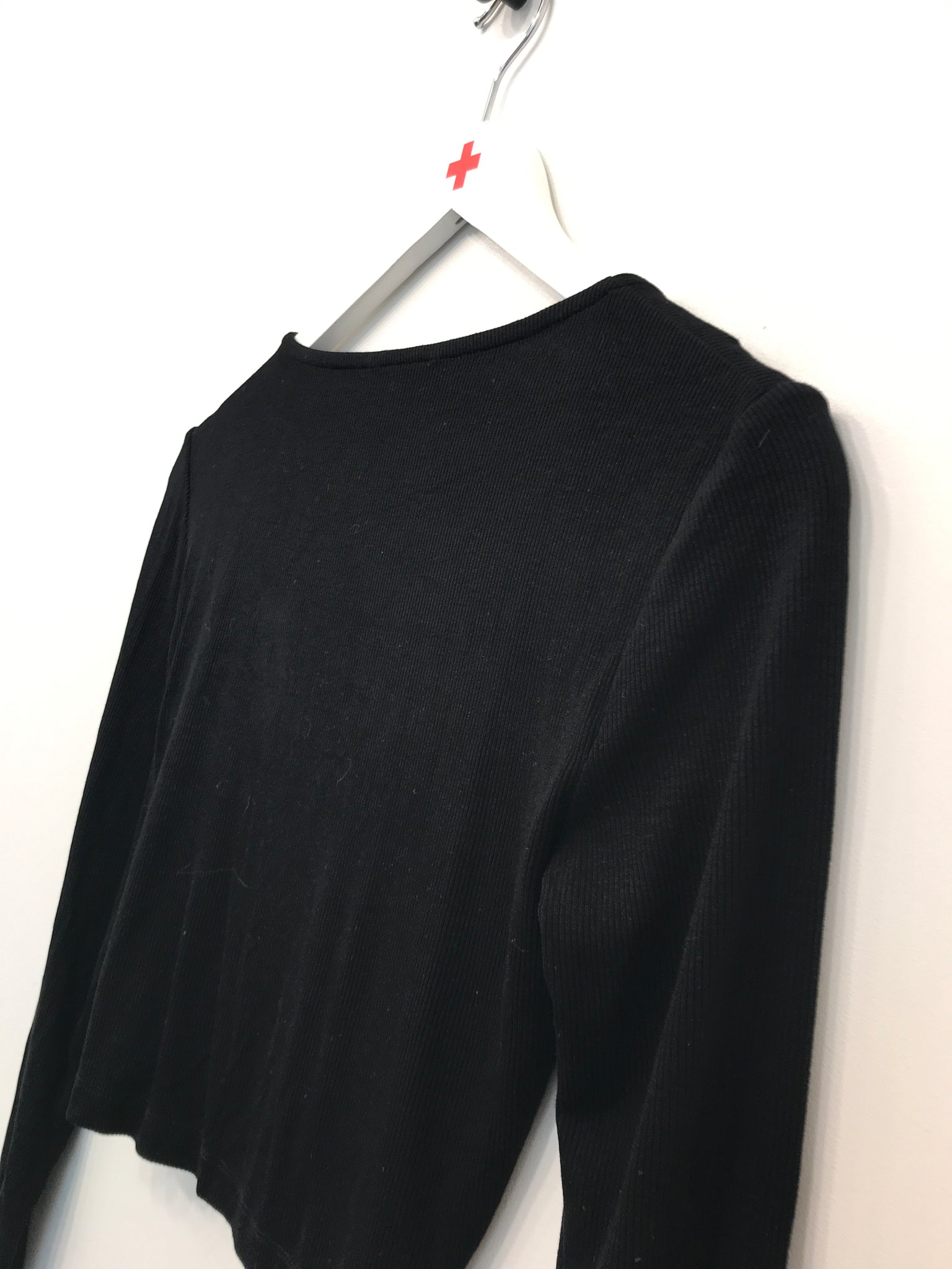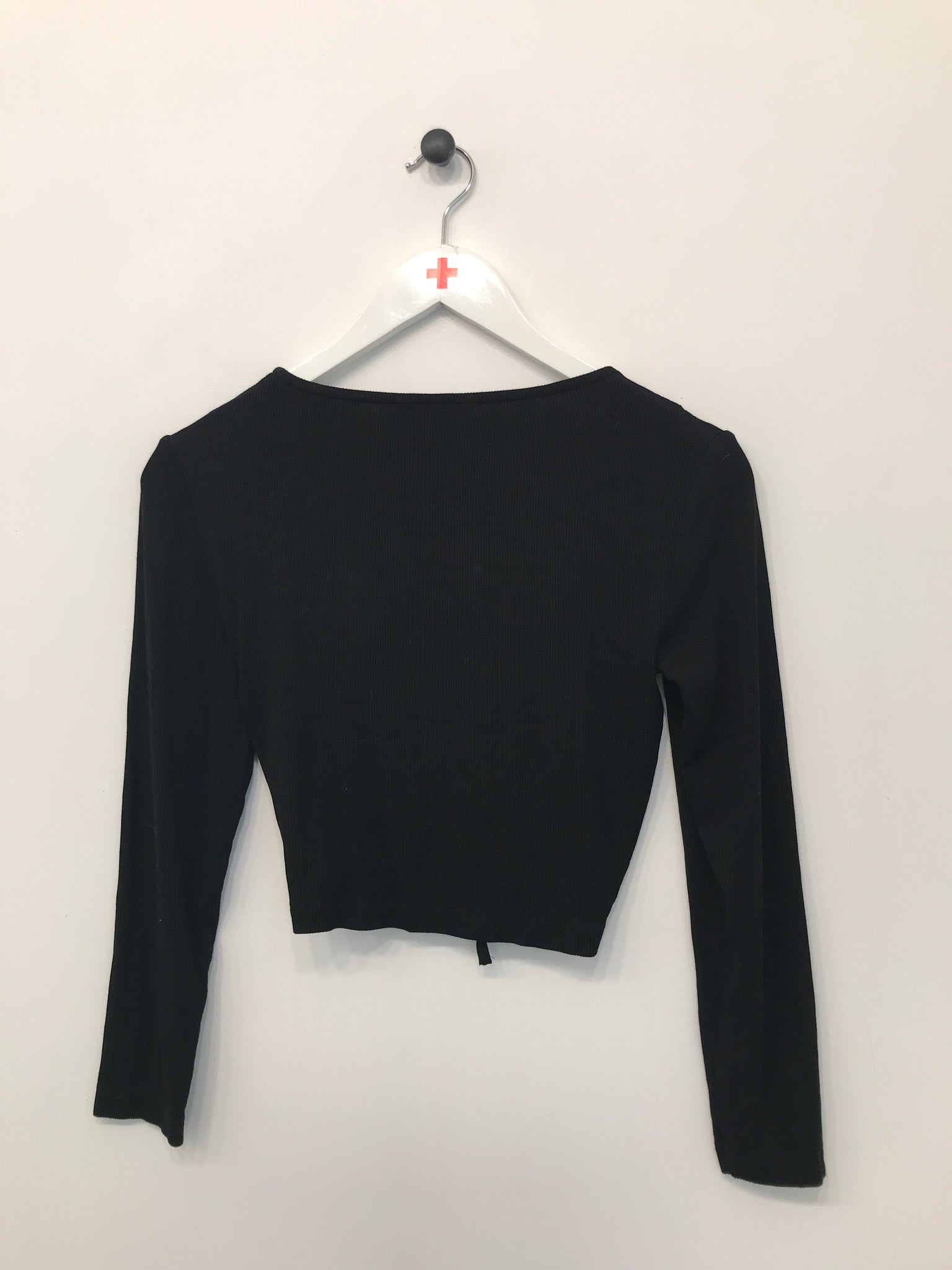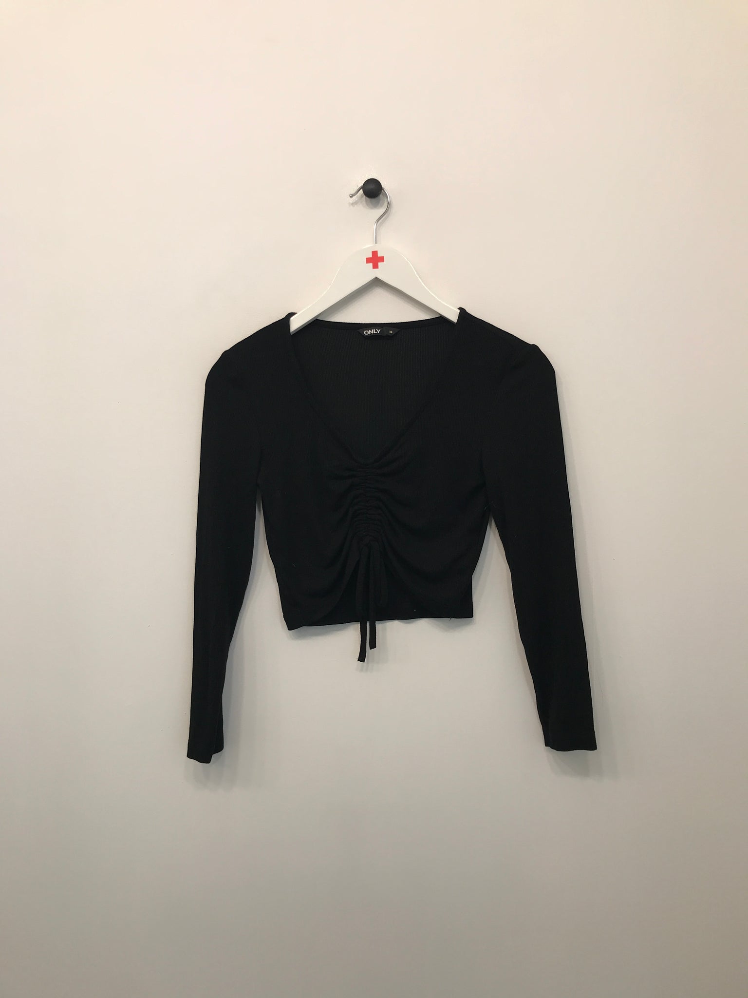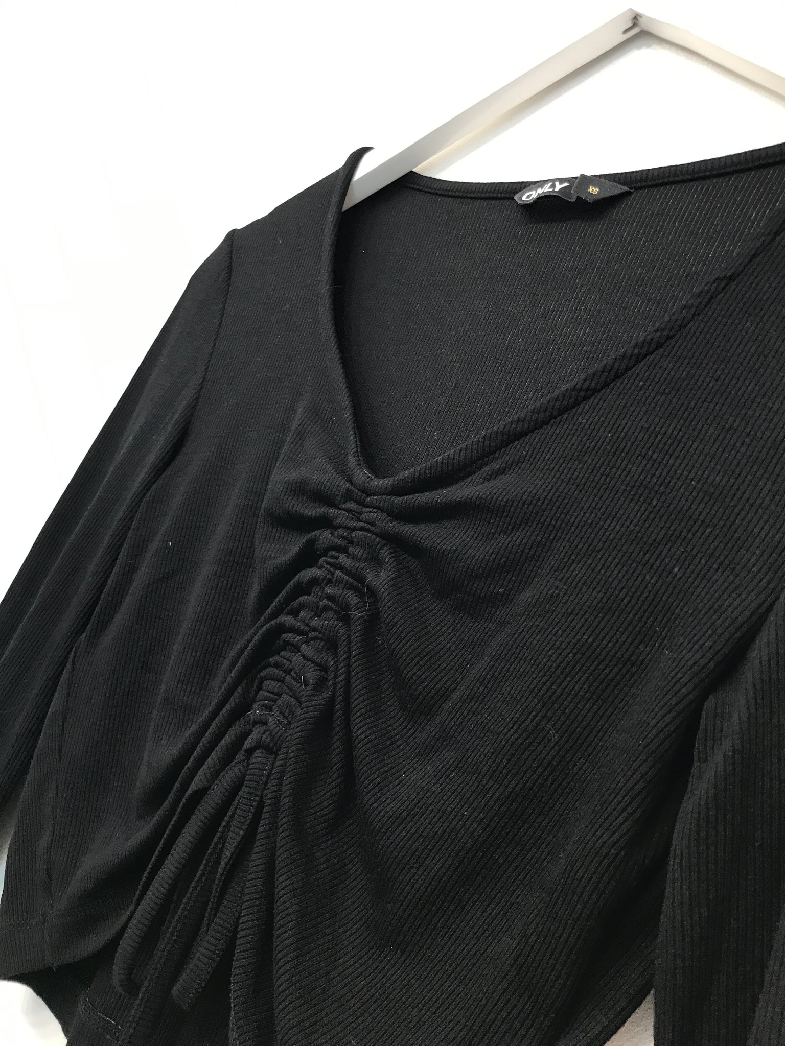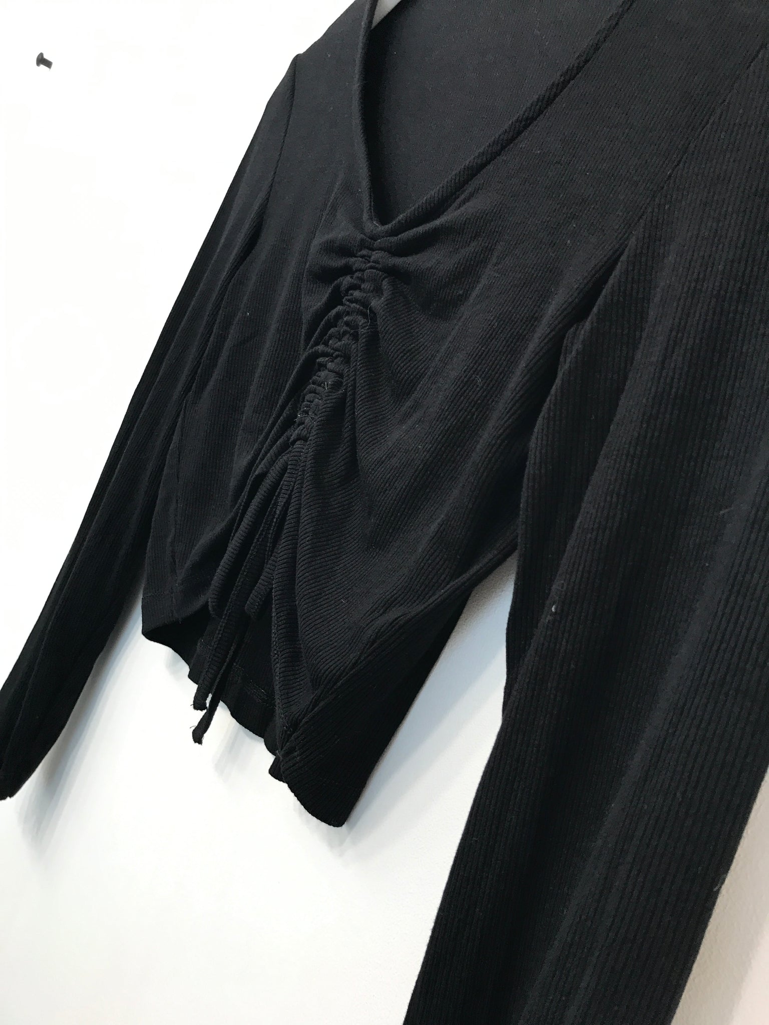 Kort strik bluse med lange ærmer, V udskæring med drapering og bindebånd.