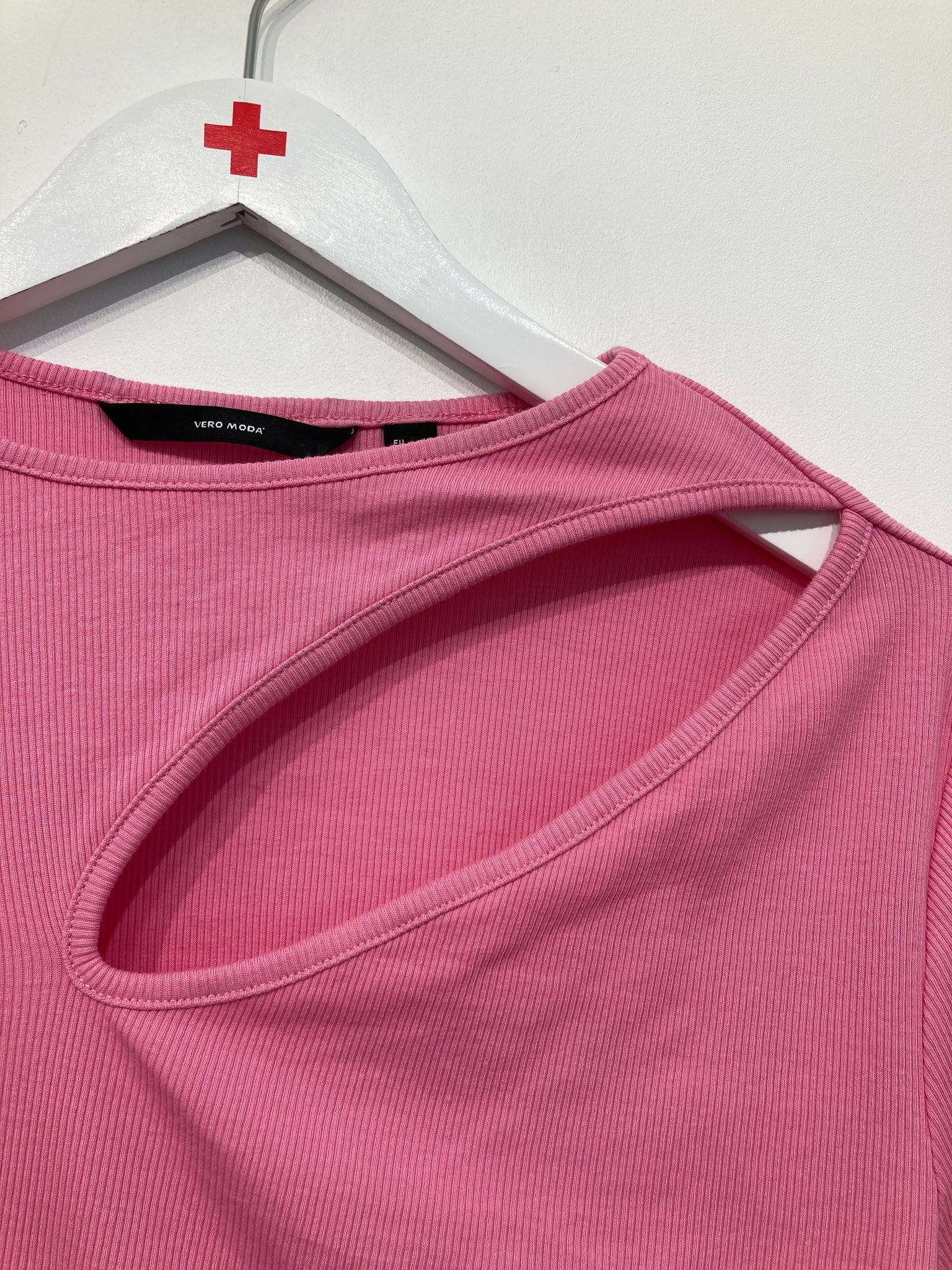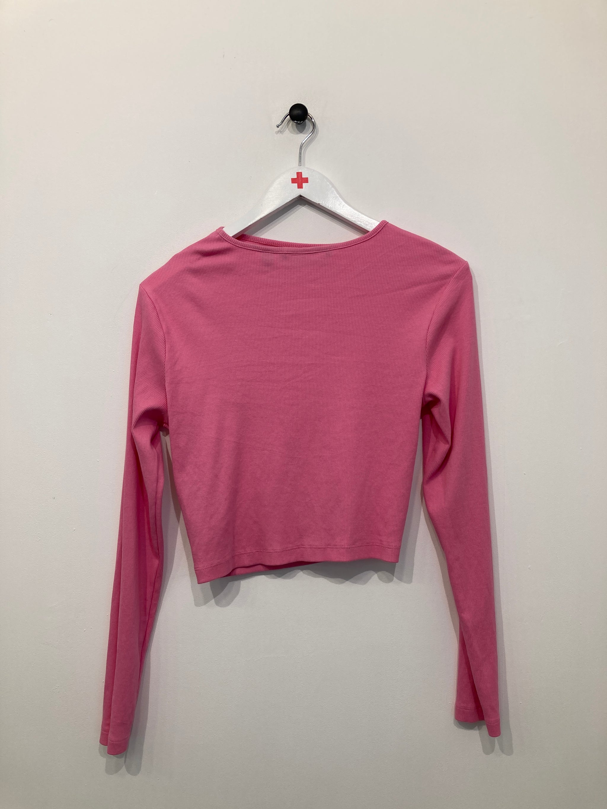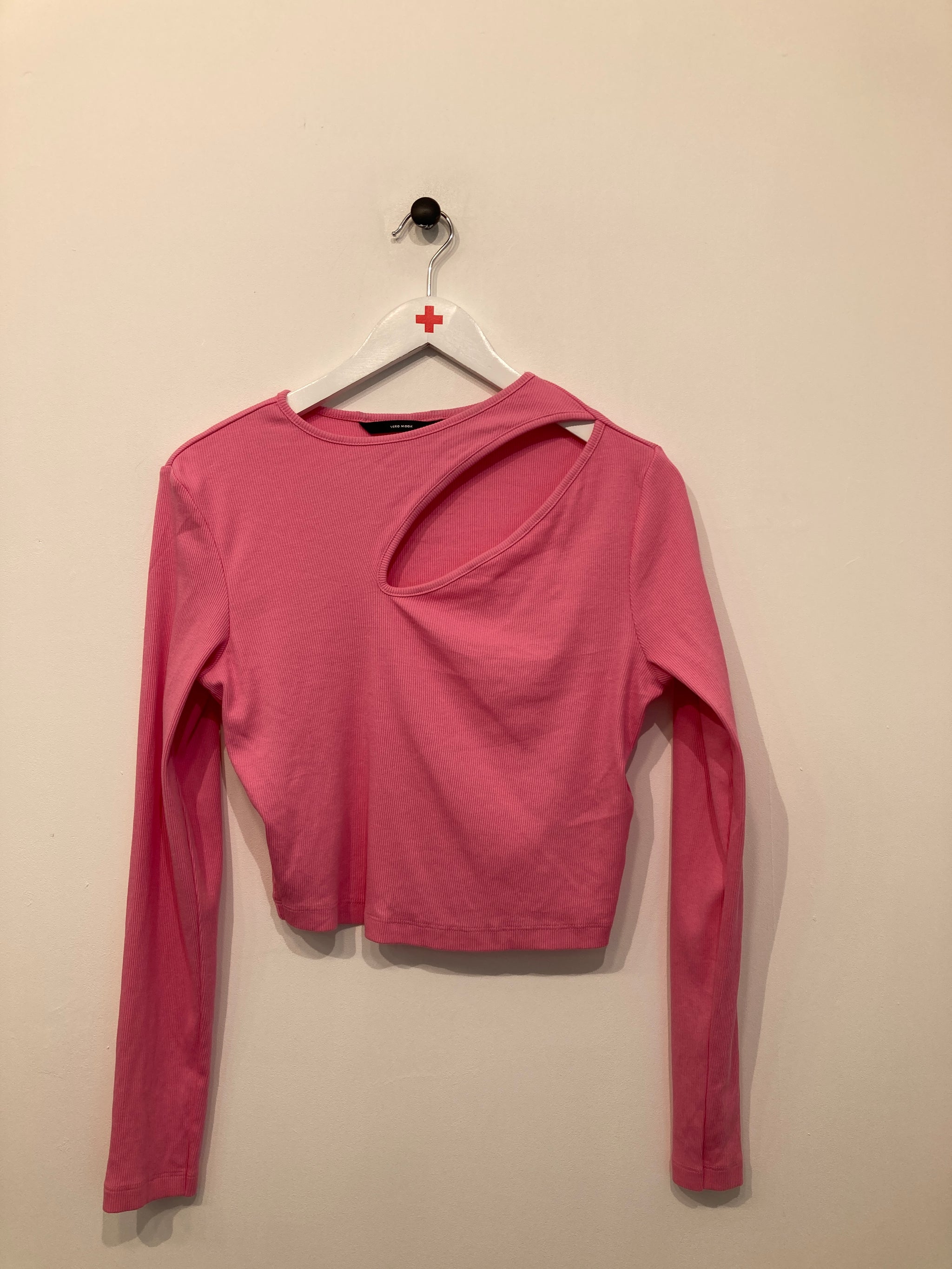 Kort strik bluse med åbning ved ene skulder, lange ærmer.