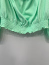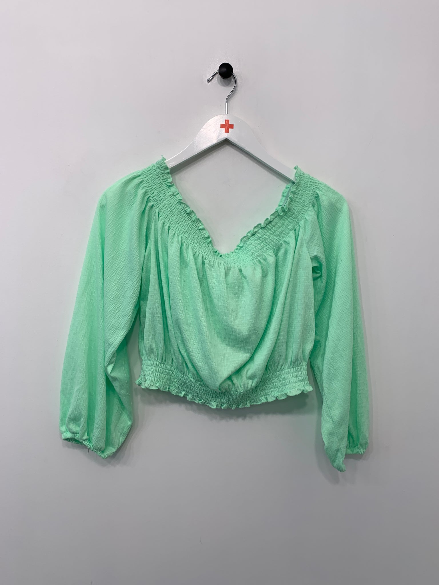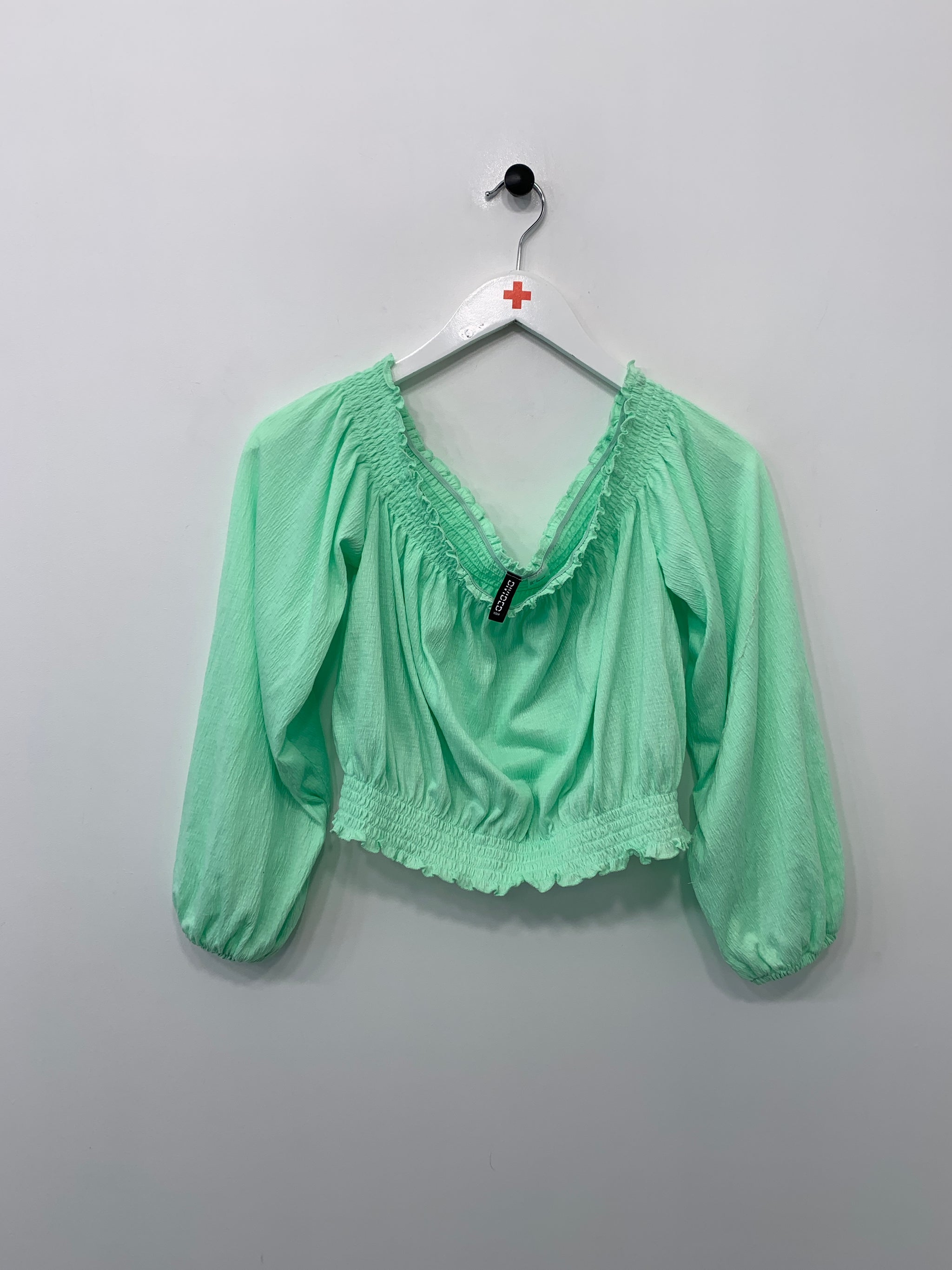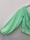 Bluse med elastik i hals. Lange ærmer med vidde og elastik. Elastikbånd nederst.