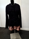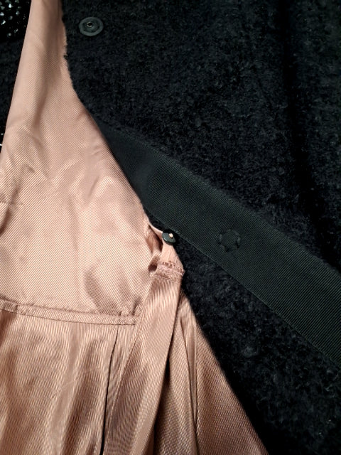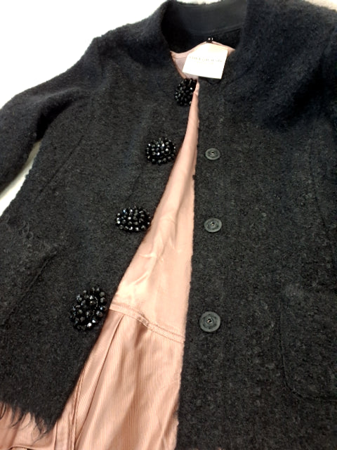 Sort jakke med markante sorte trykknapper. Rosa aftageligt inderfor. Fremstår som ny. Italiensk str 42.