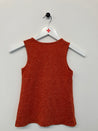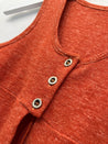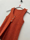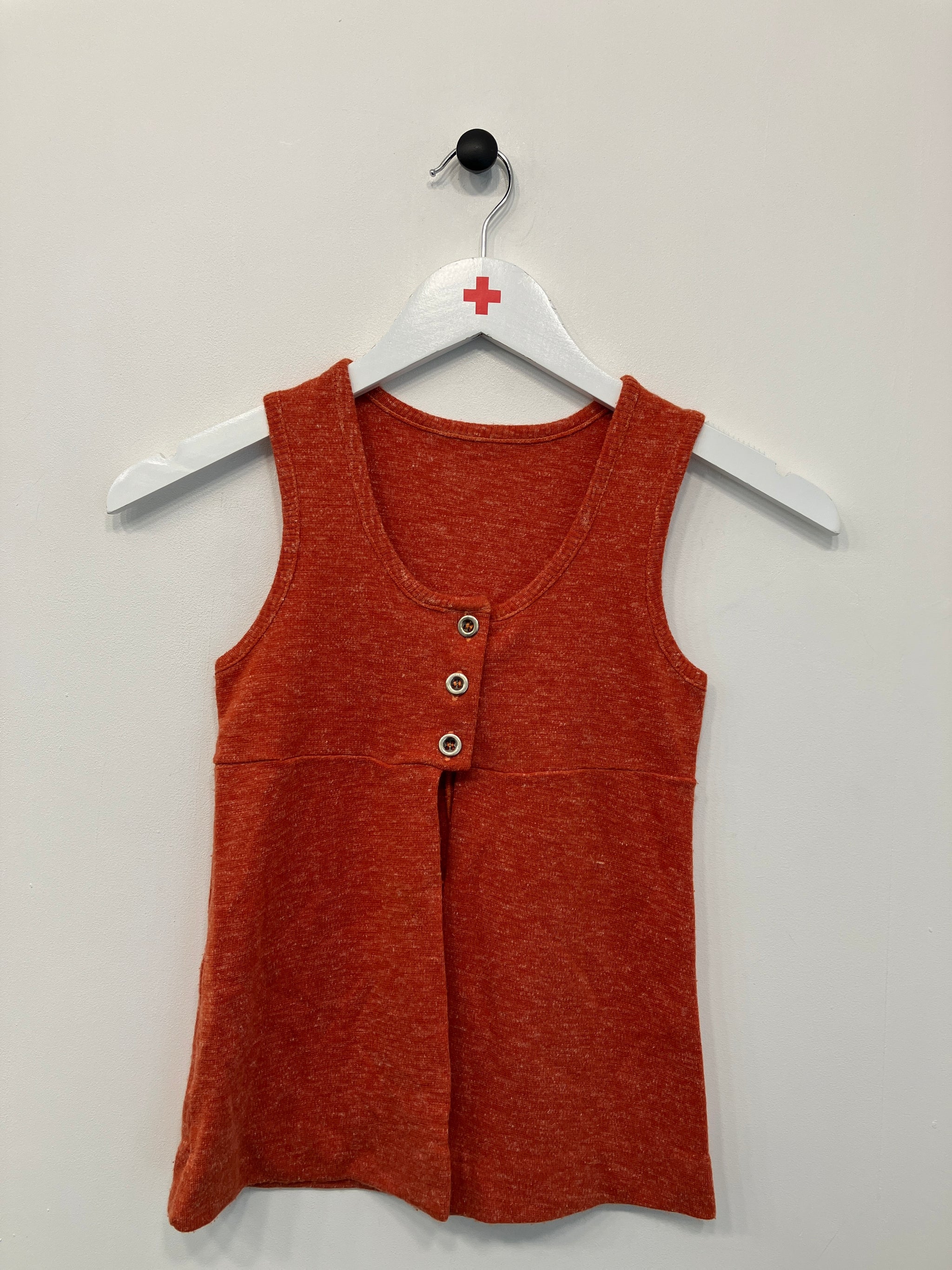 Ærmeløs og åbenstående bluse med knaplukning øverst på front.