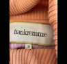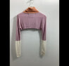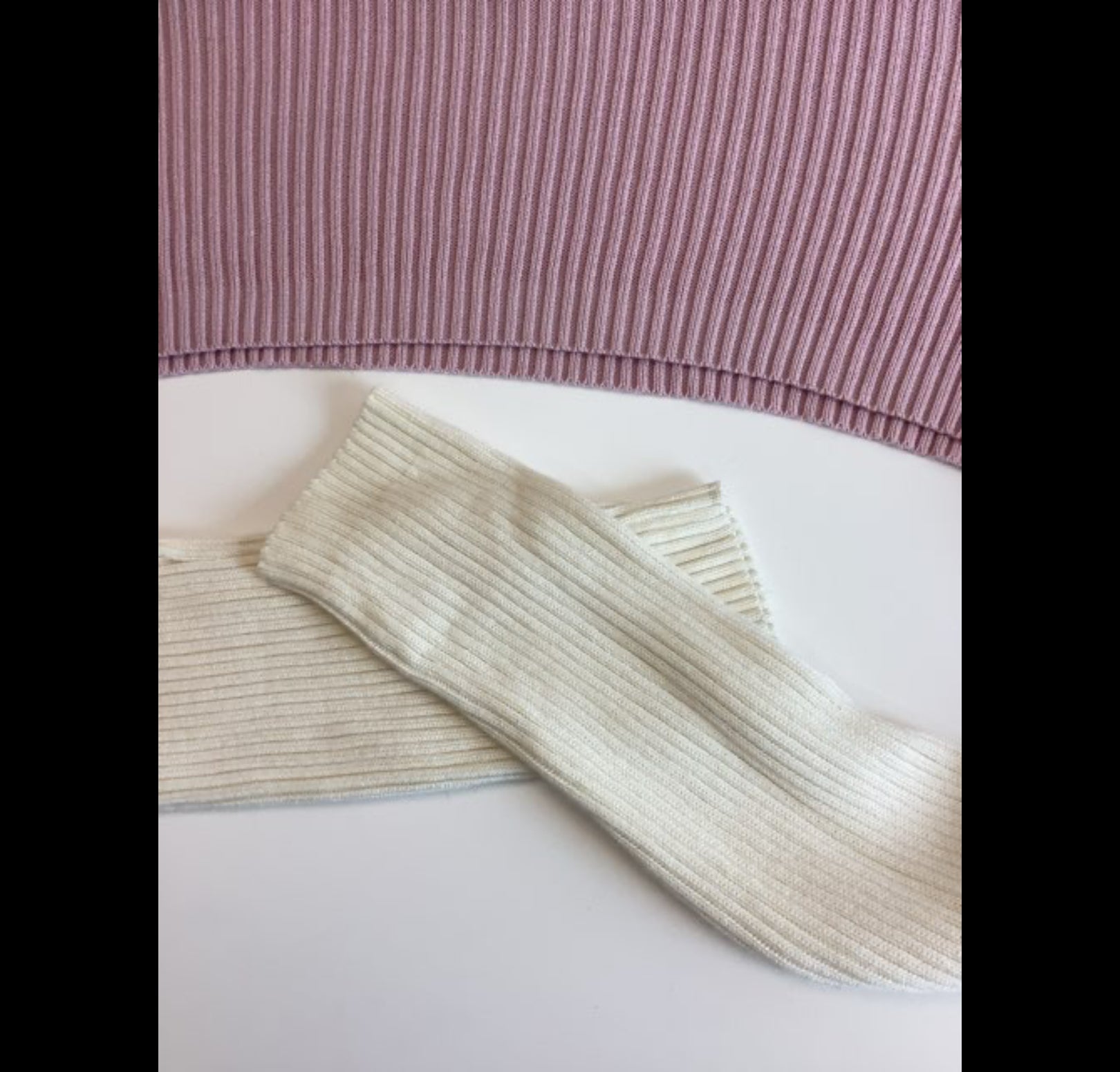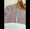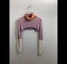 O562 Trøjen har ribbet tekstur og en cropped stil med høj hals. Farverne er lyserød, orange og hvid.