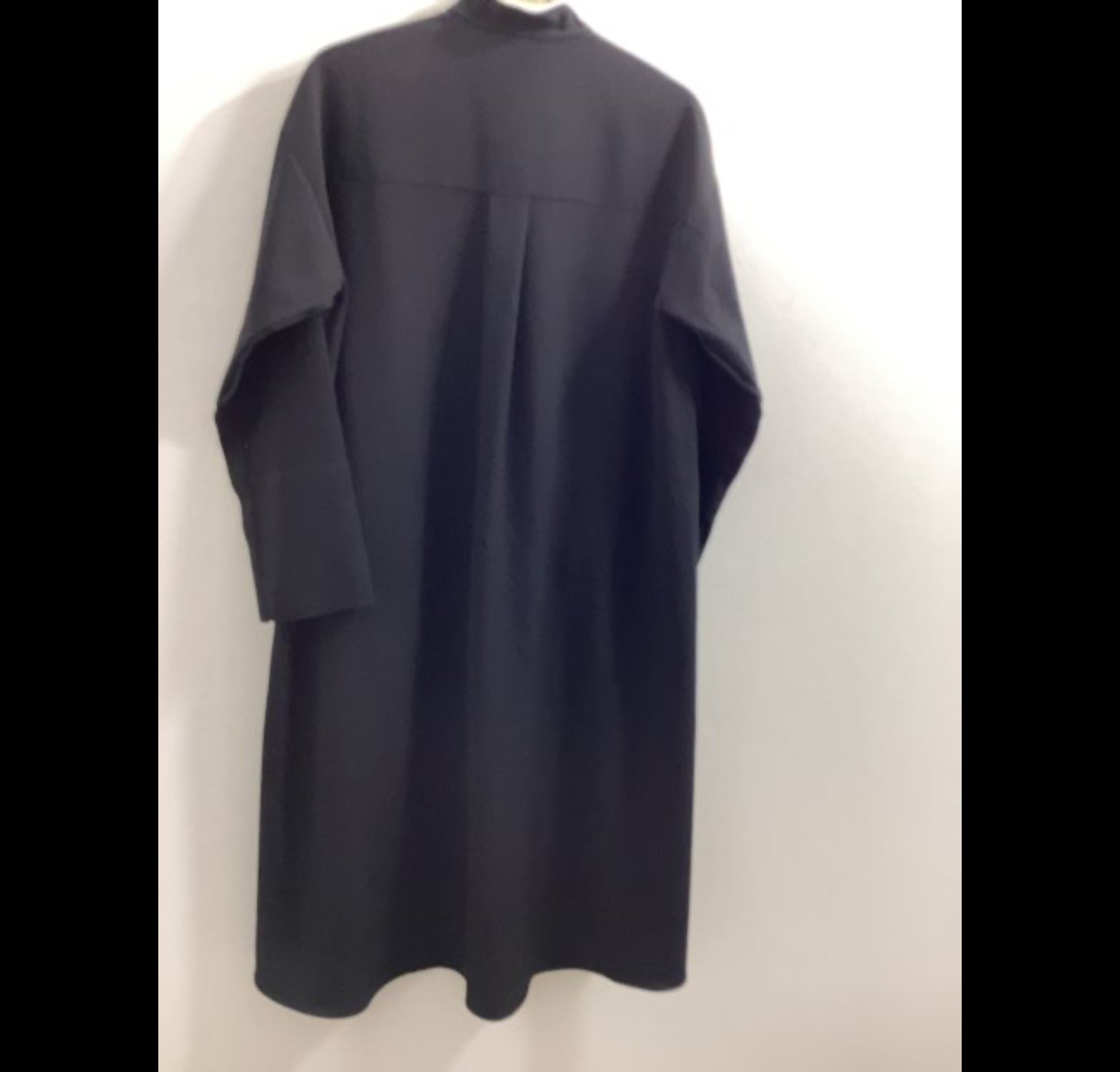 O560 Produktet er en løs kjole med brede ærmer. Den har en minimalistisk stil med en krave med hvide kanter og bånd. Materialet er silke blanding -se billede. Længde bagpå 112cm foran 98cm