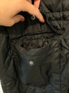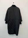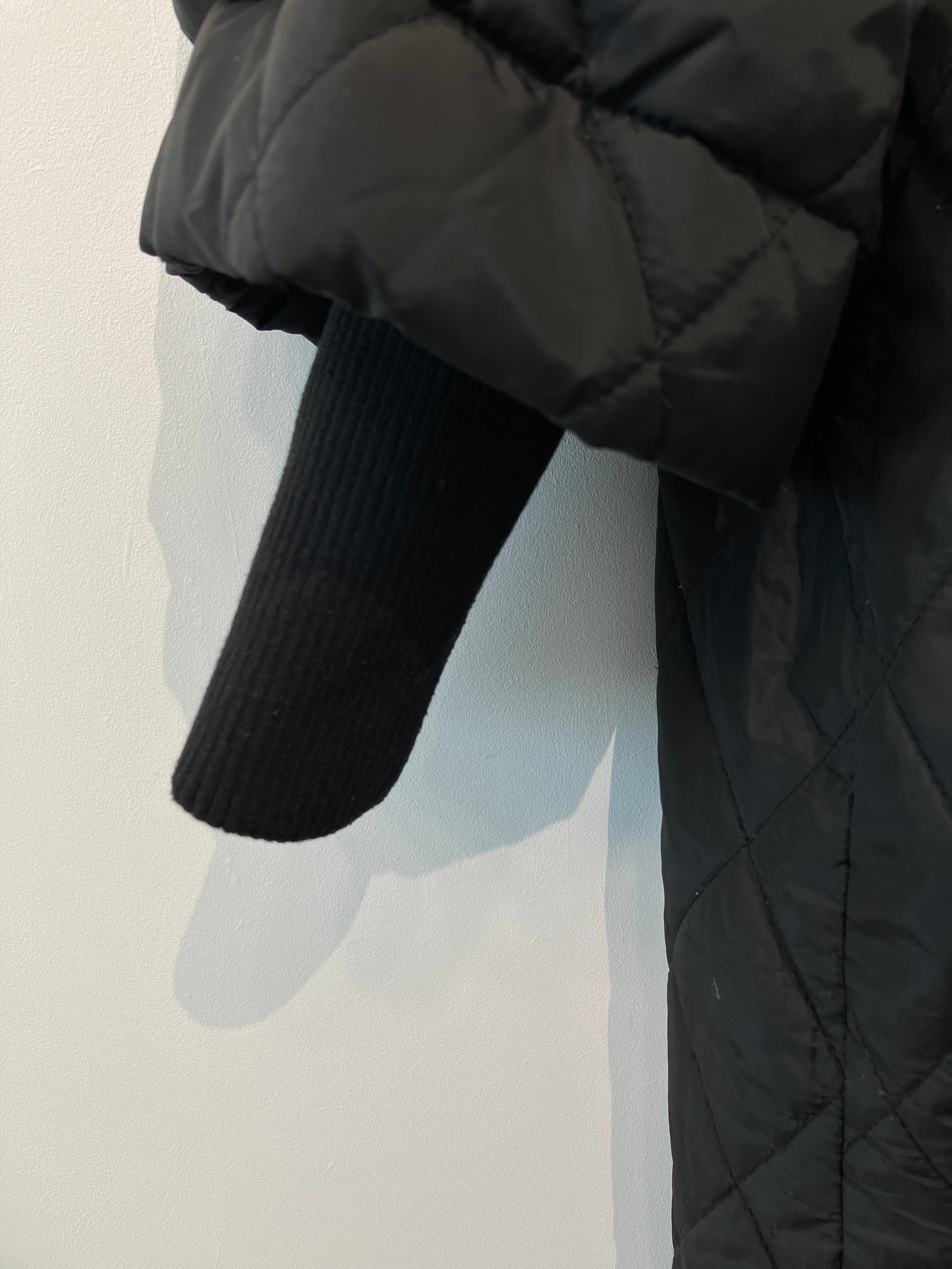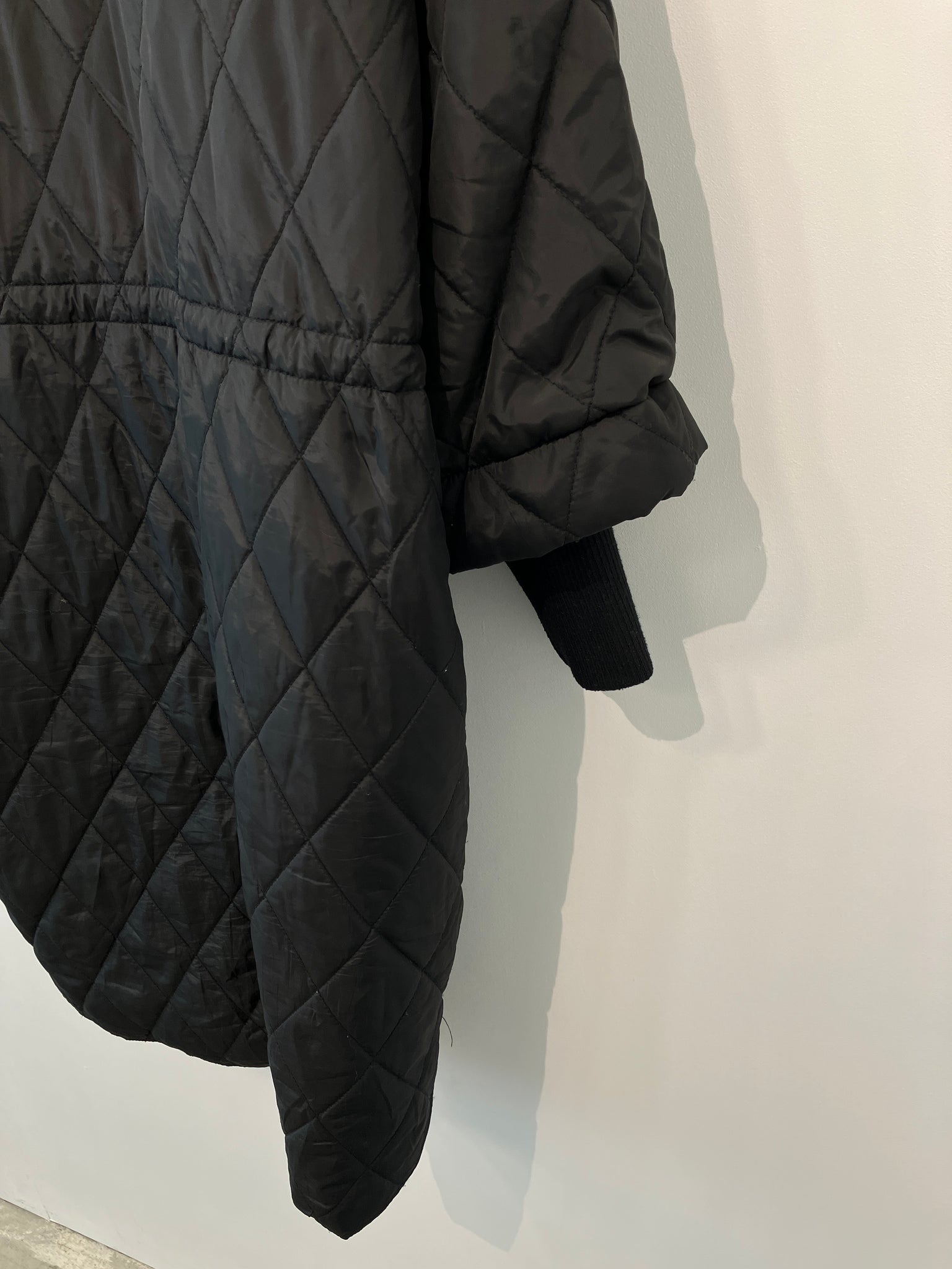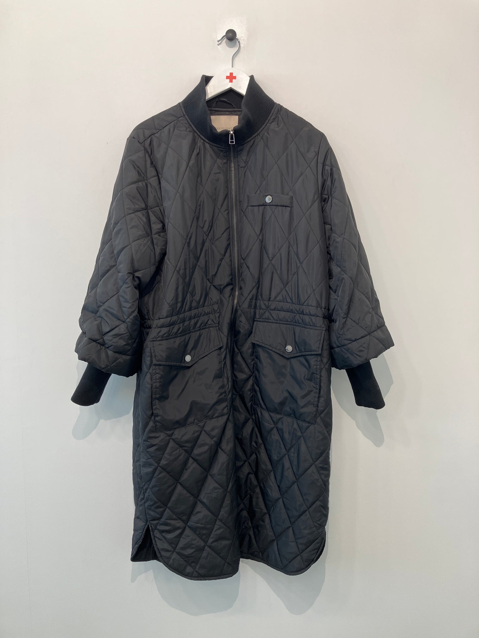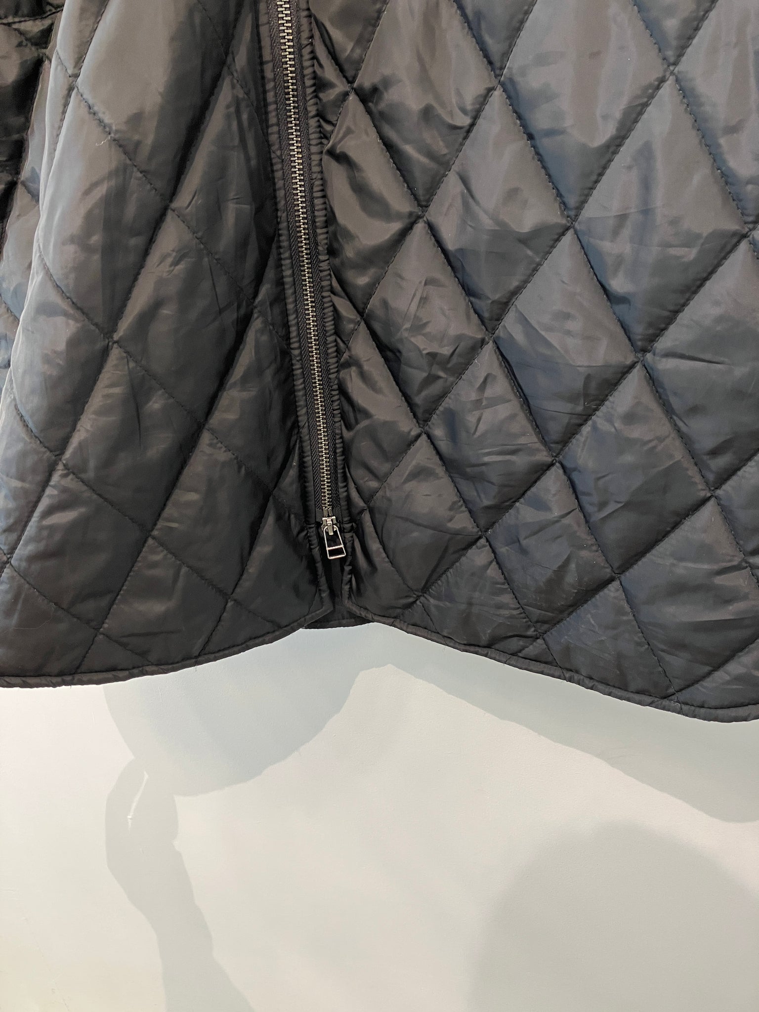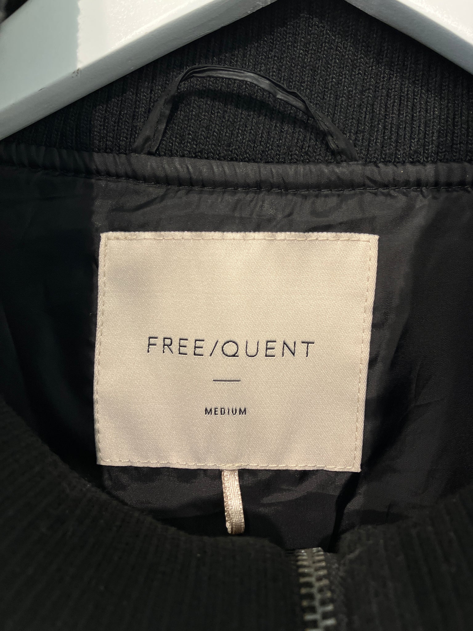 Lun og lang jakke med lynlåslukning, lommer med lynlåslukning, slids i sider.