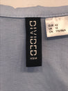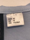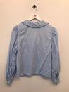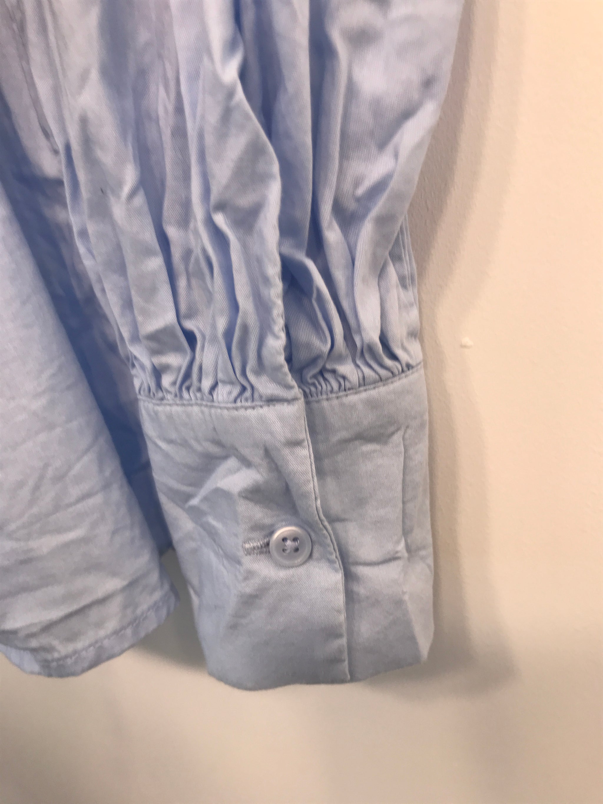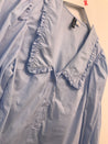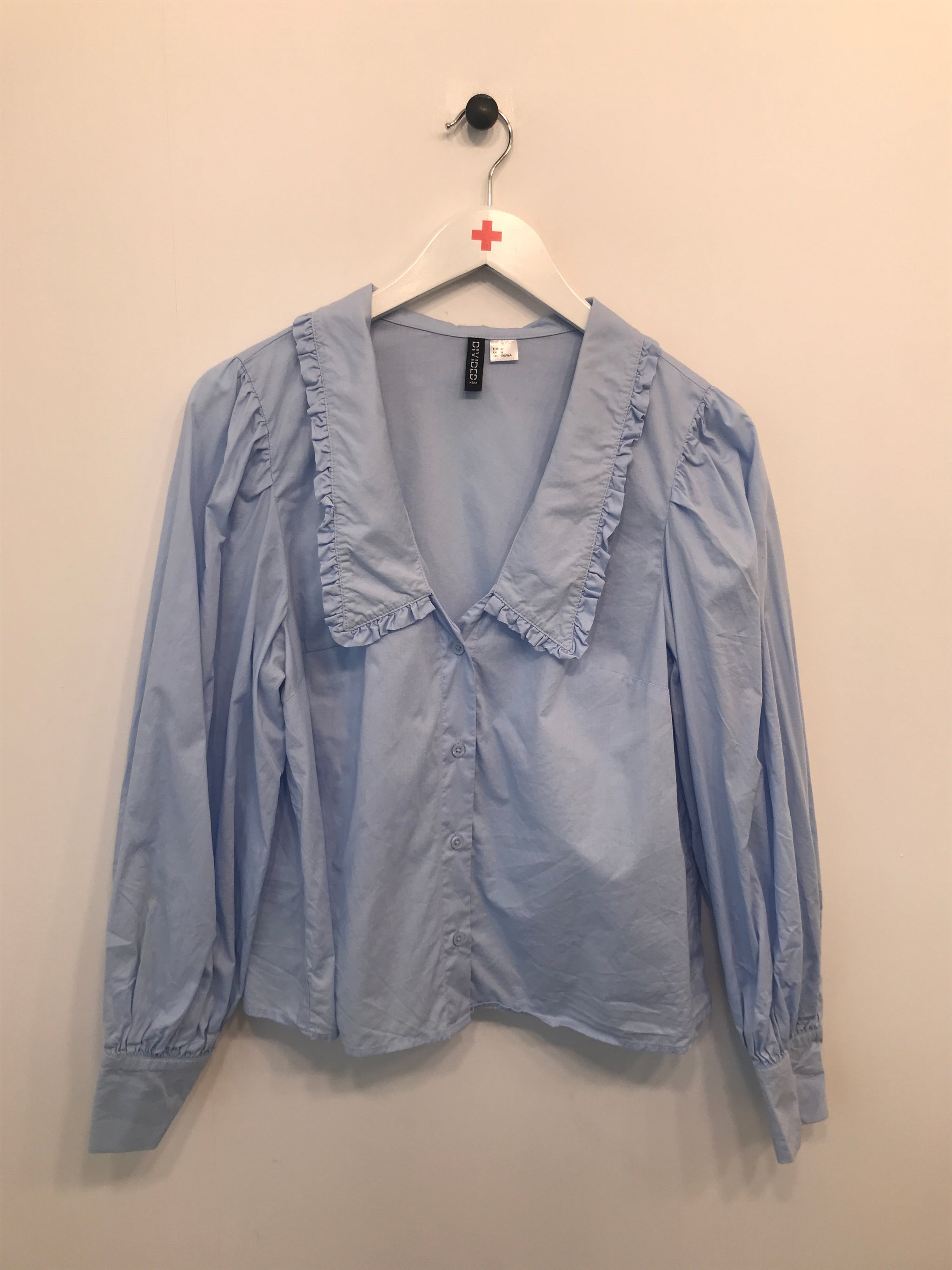 Feminin skjorte med lange ærmer, en dyb V-udskæring og krave med dekorativ flæsekant.