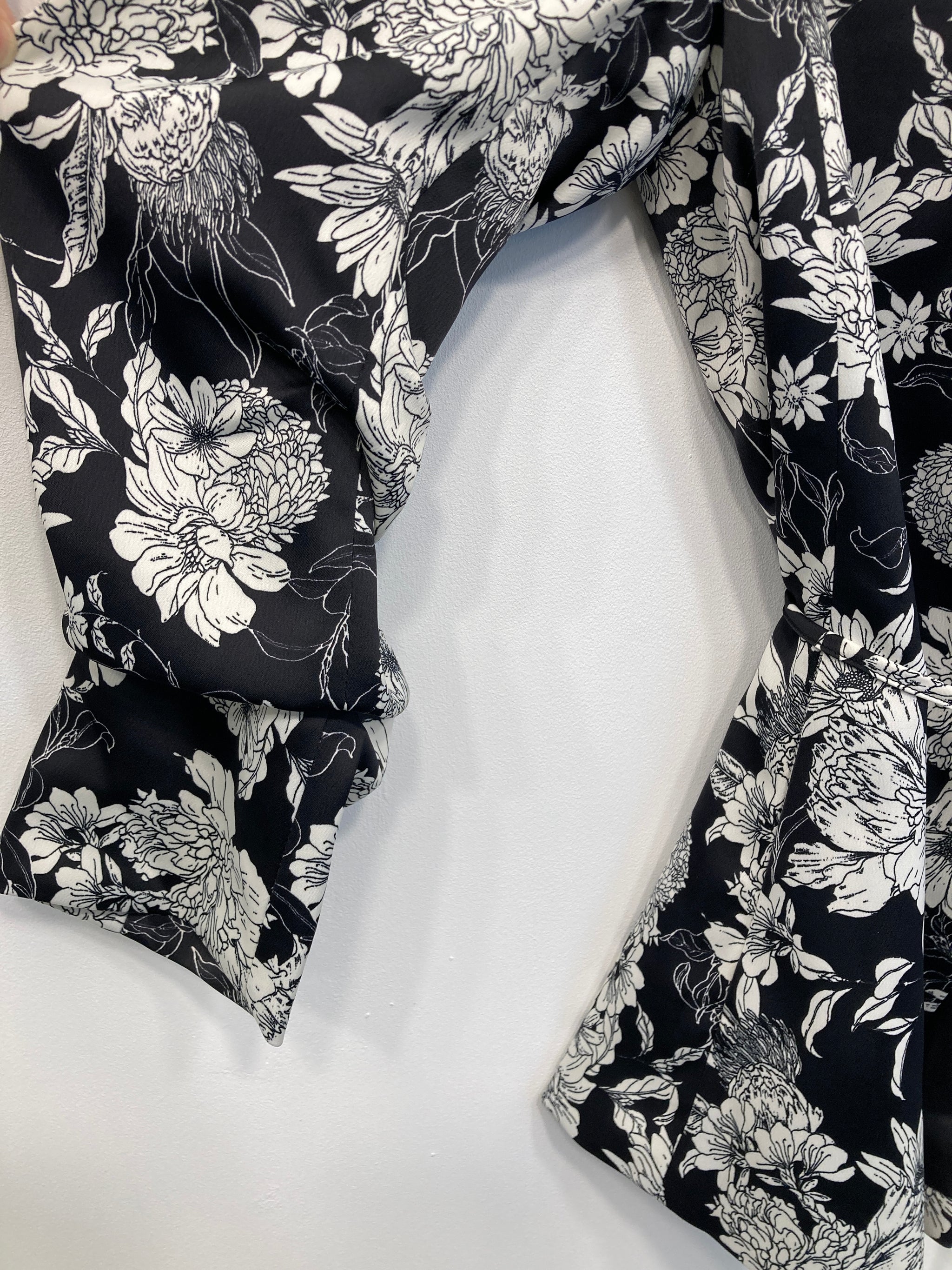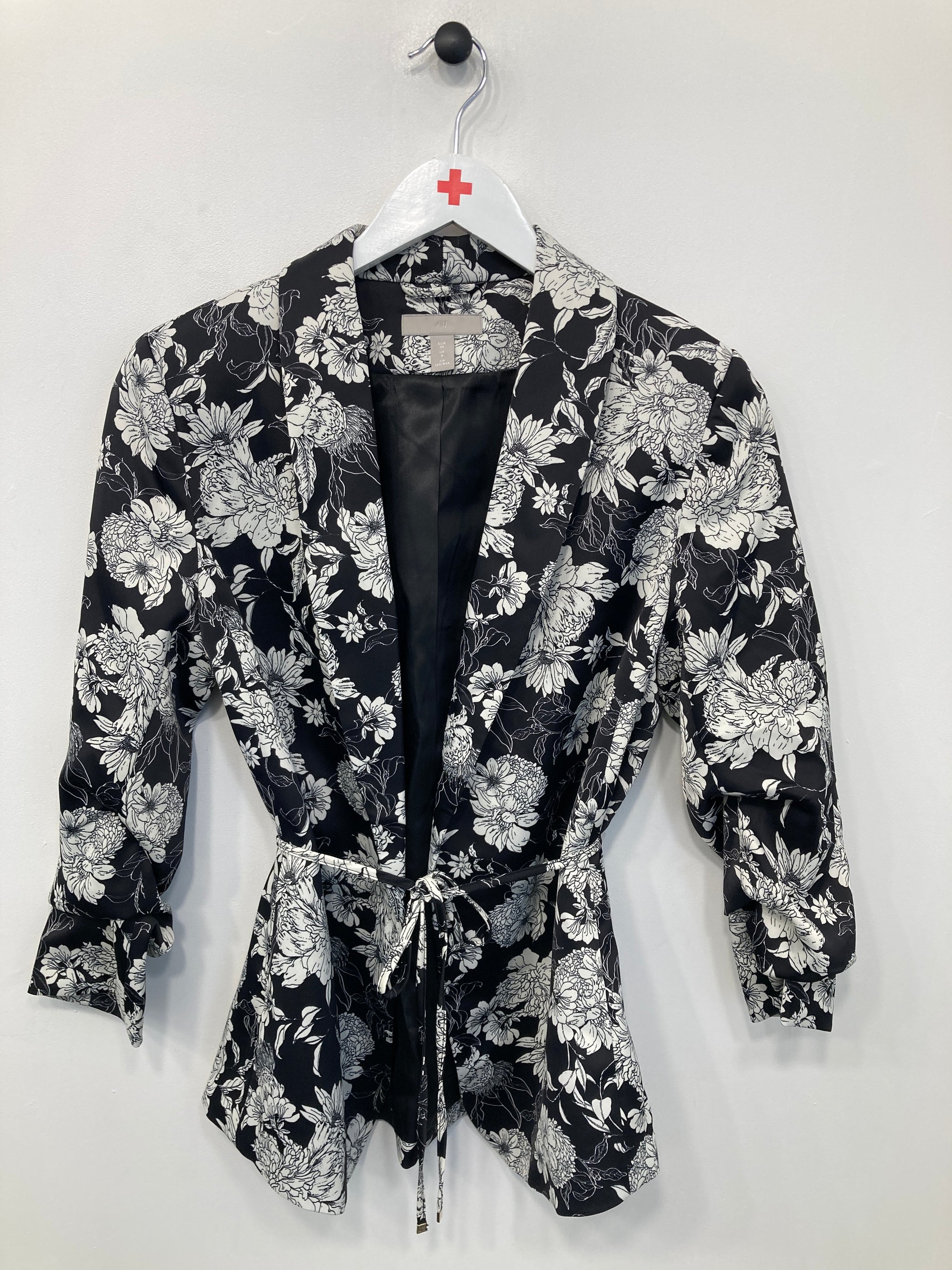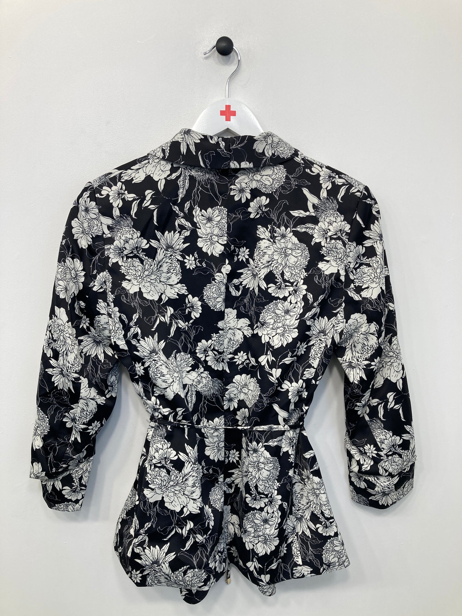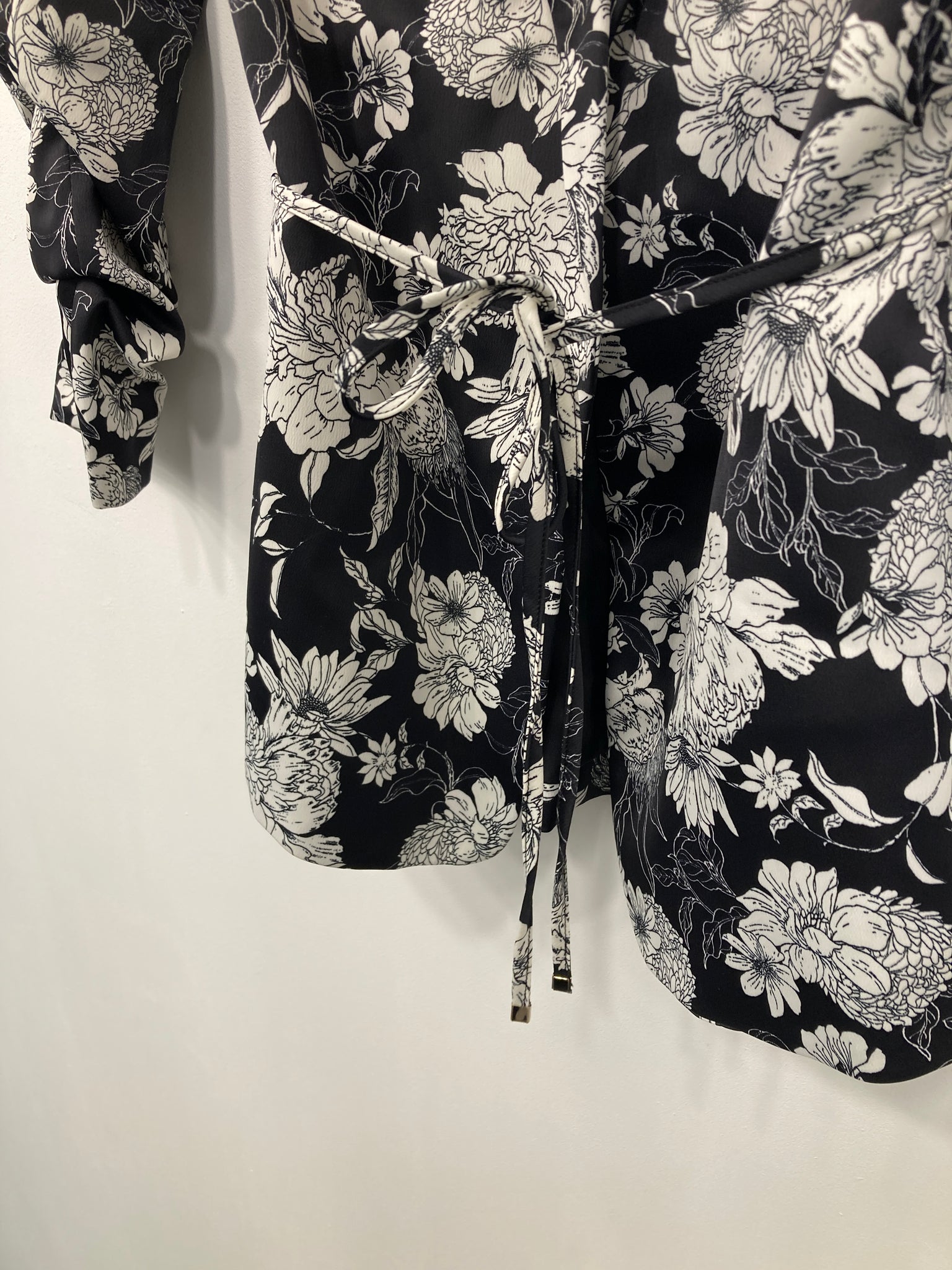 Elegant jakke med smukt blomsterprint. Det lette materiale og bindebæltet i taljen giver et feminint og stilfuldt udtryk. Perfekt til både hverdag og fest.