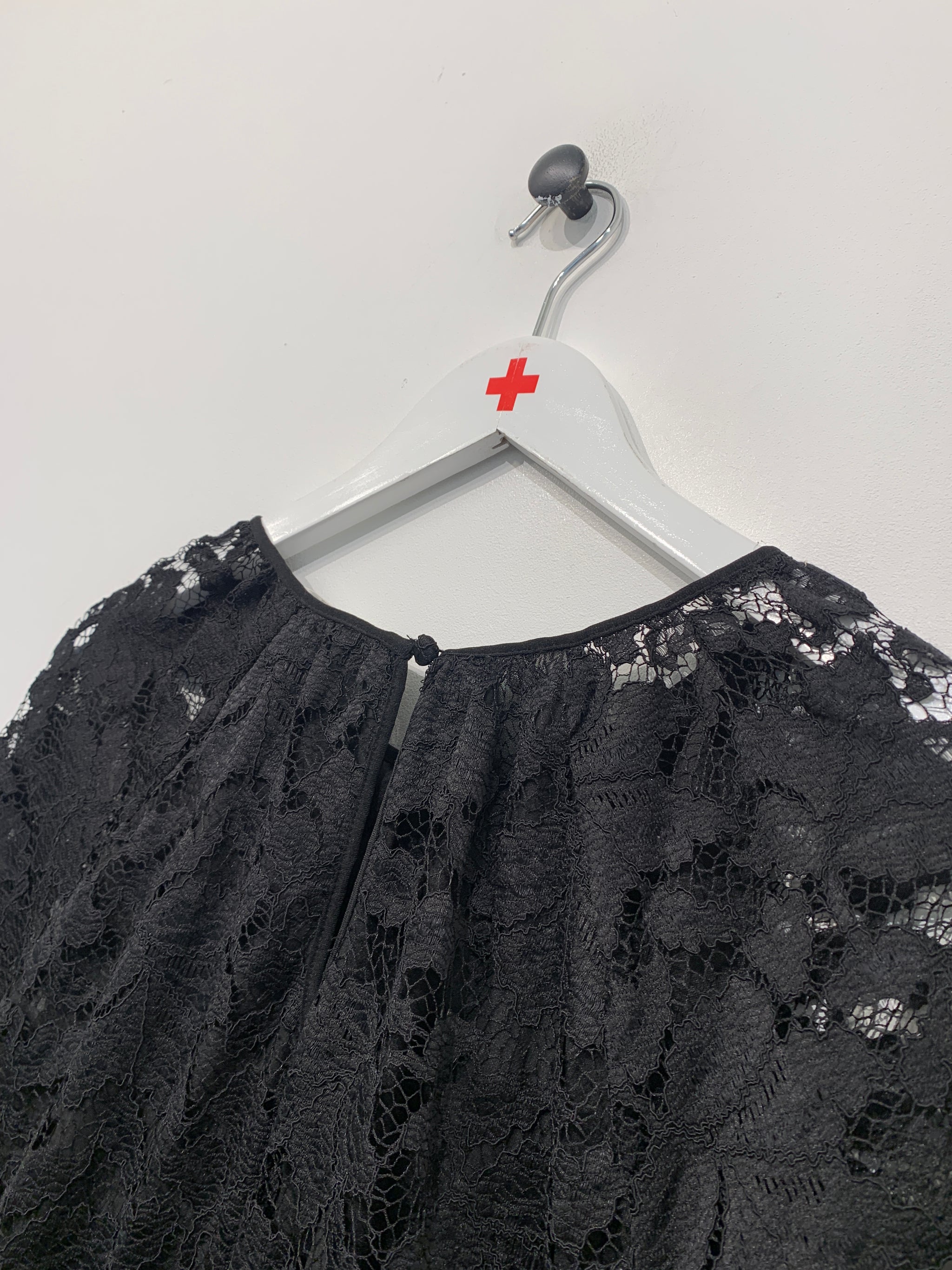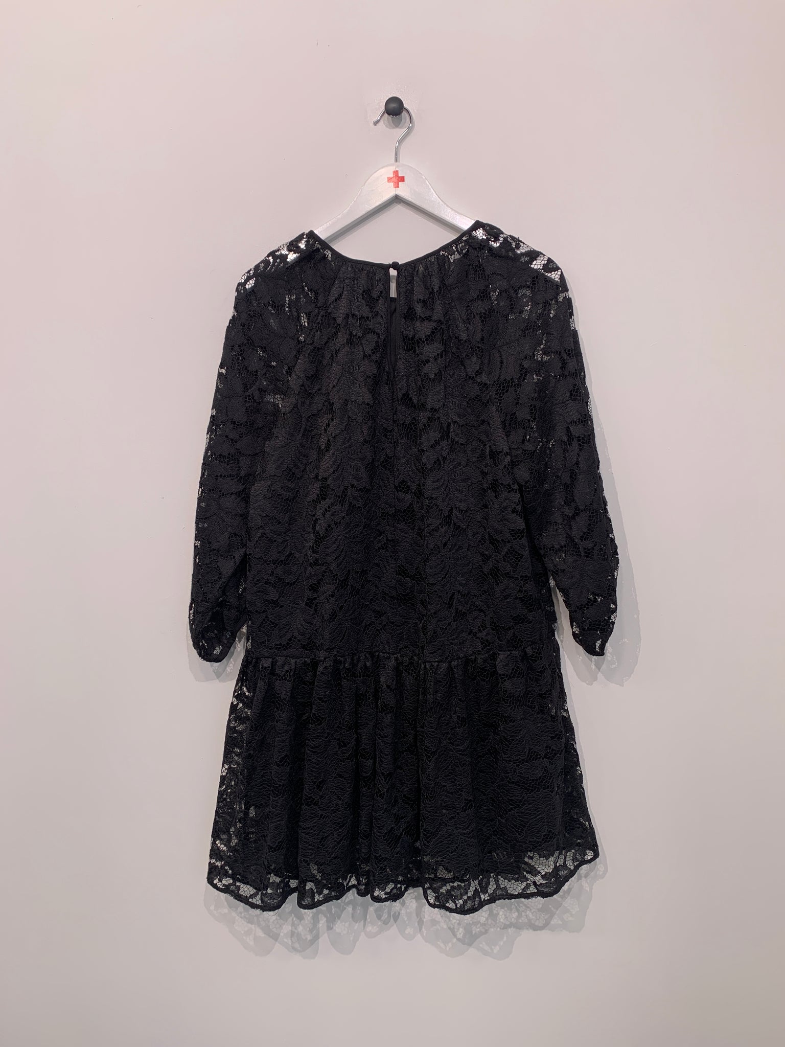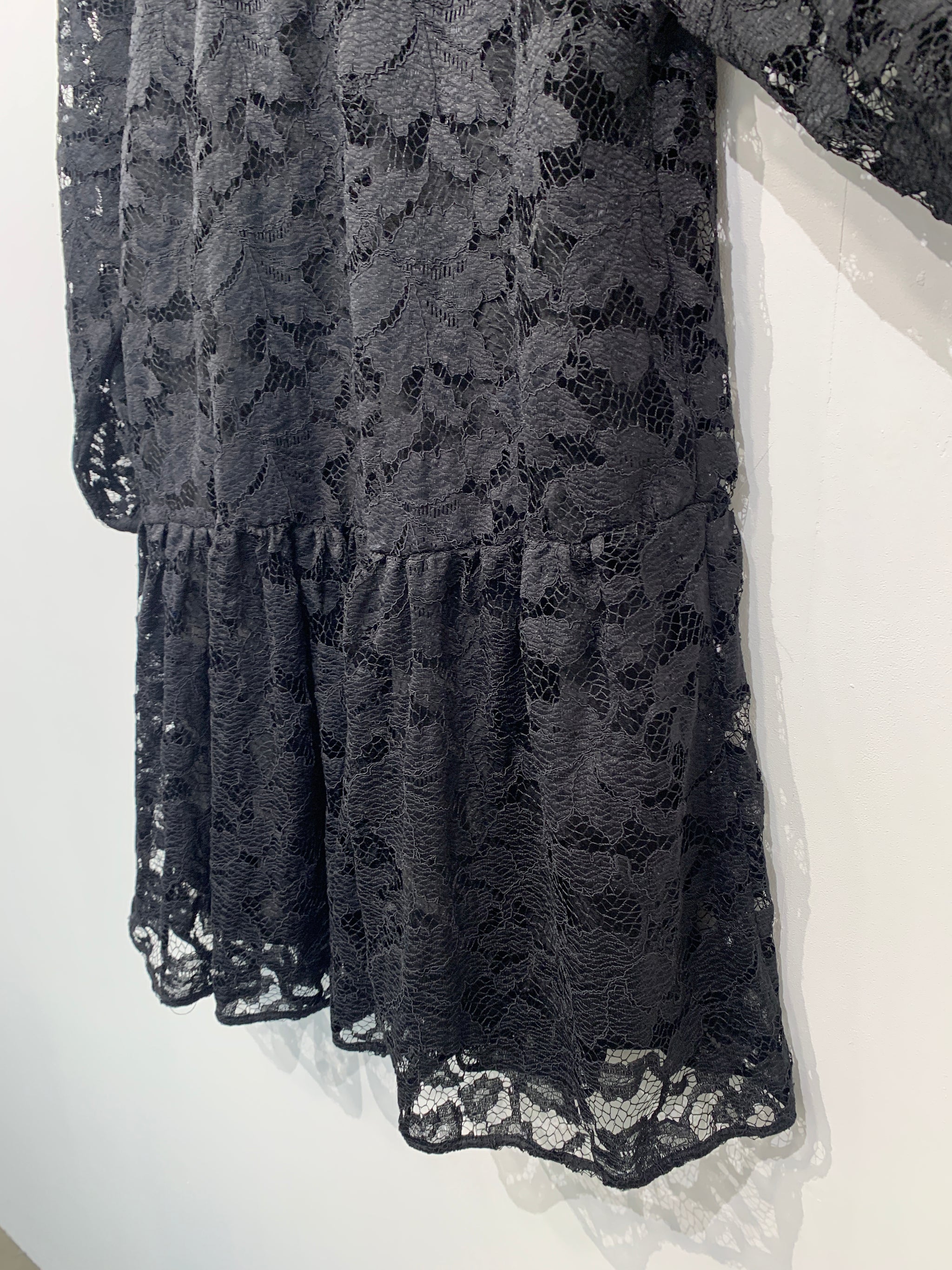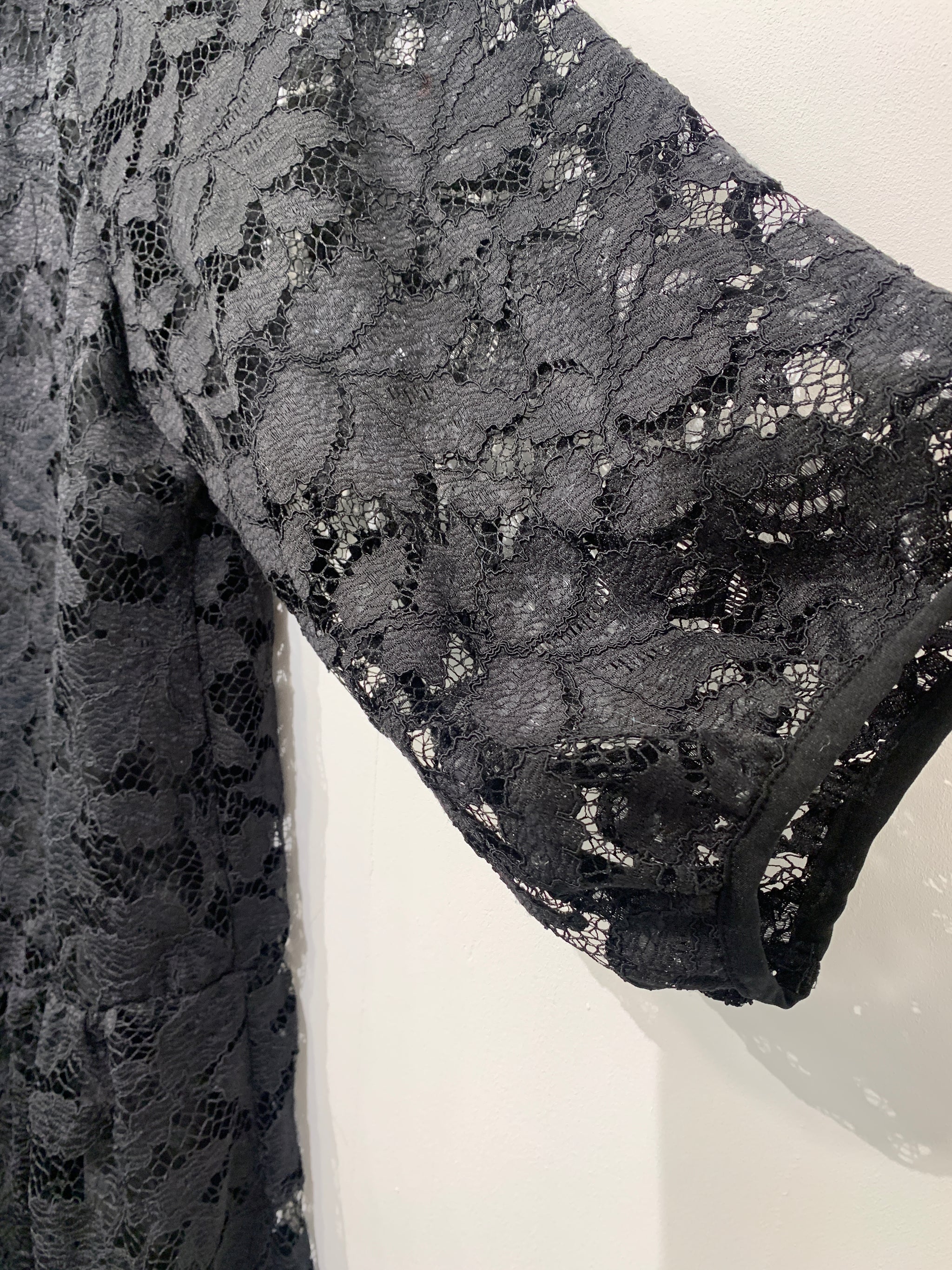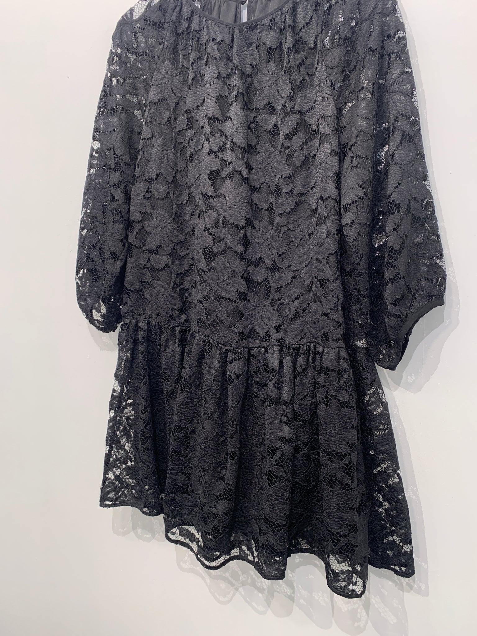 Kjole med rund halsudskæring, knaplukning i ryg og lange ærmer. Blondestof.