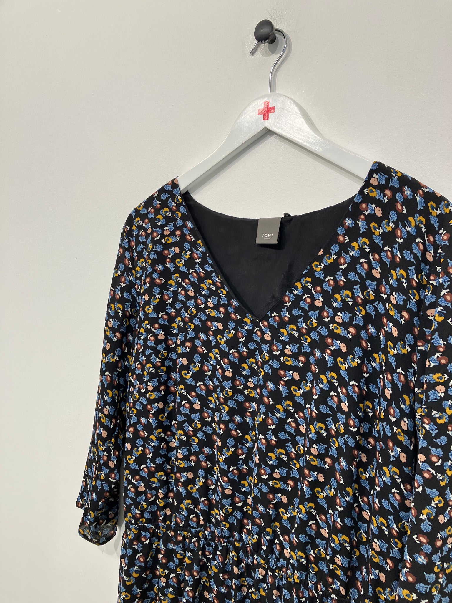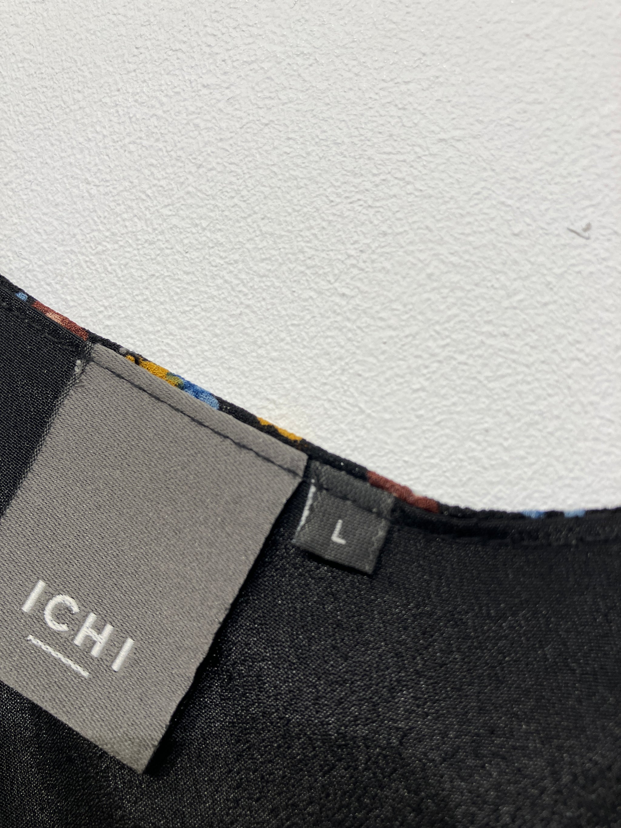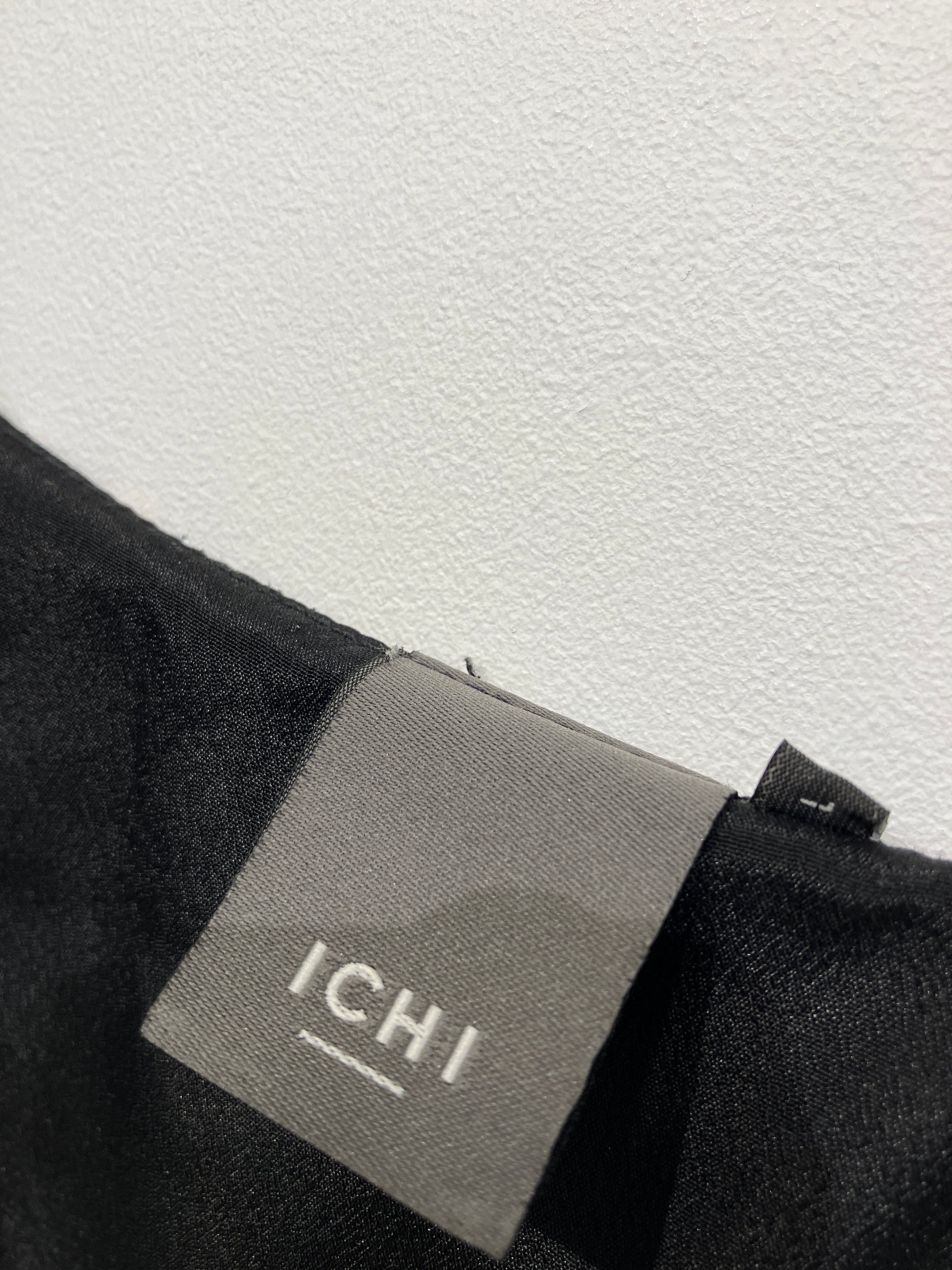 Flot lang Ichi kjole med smukt overflademønster og flæser forneden. Mangler vaskemærke.