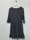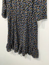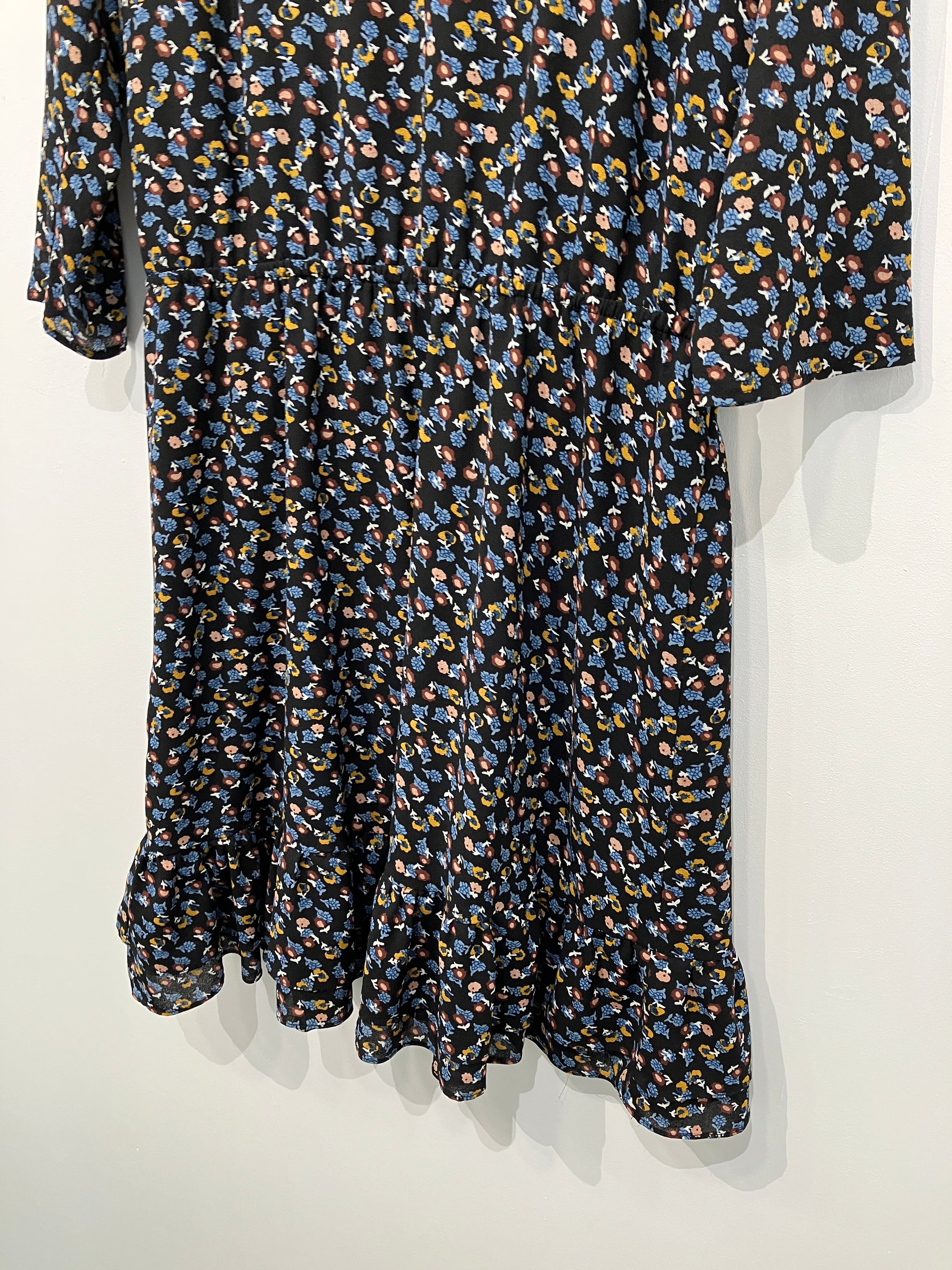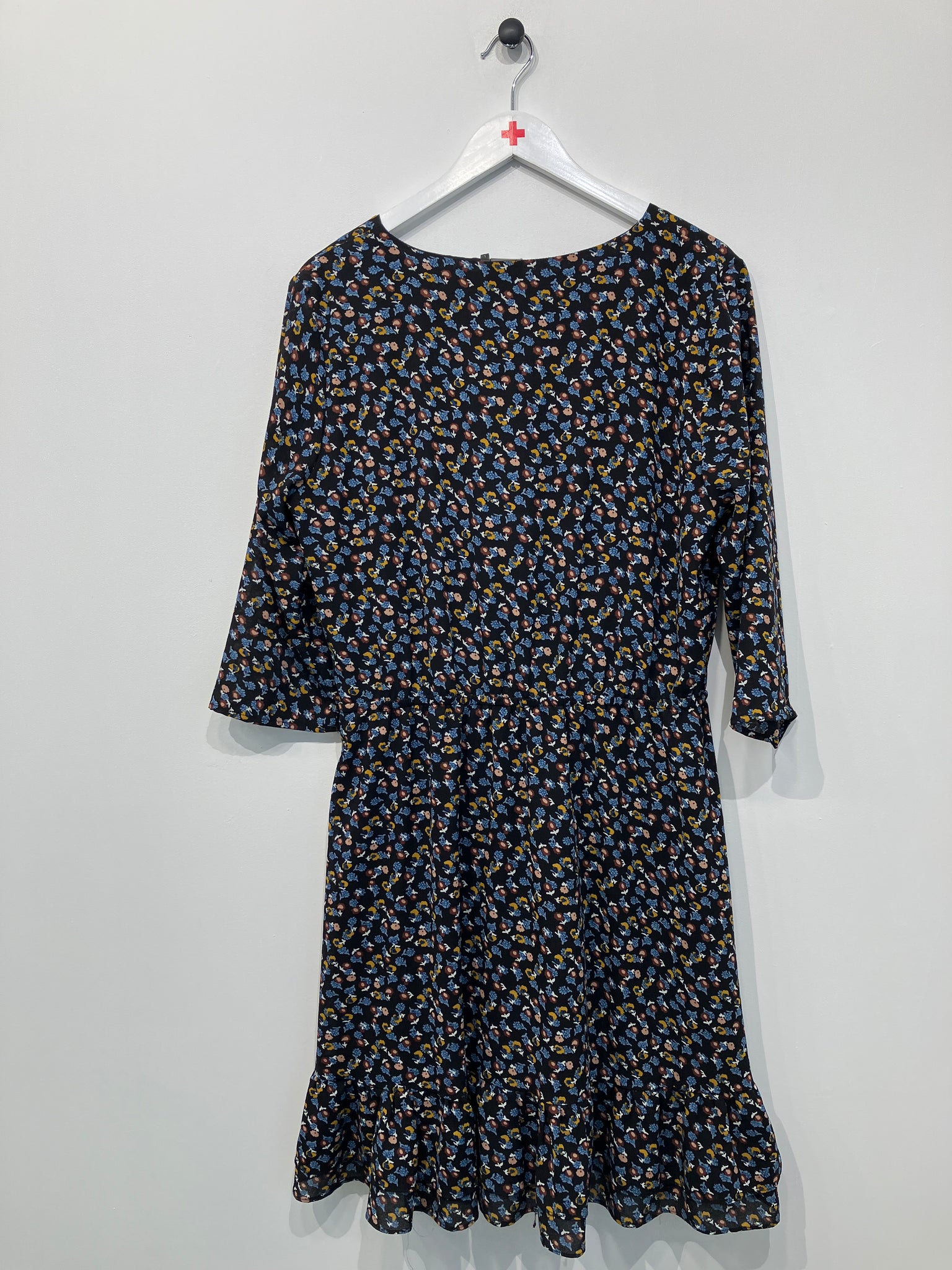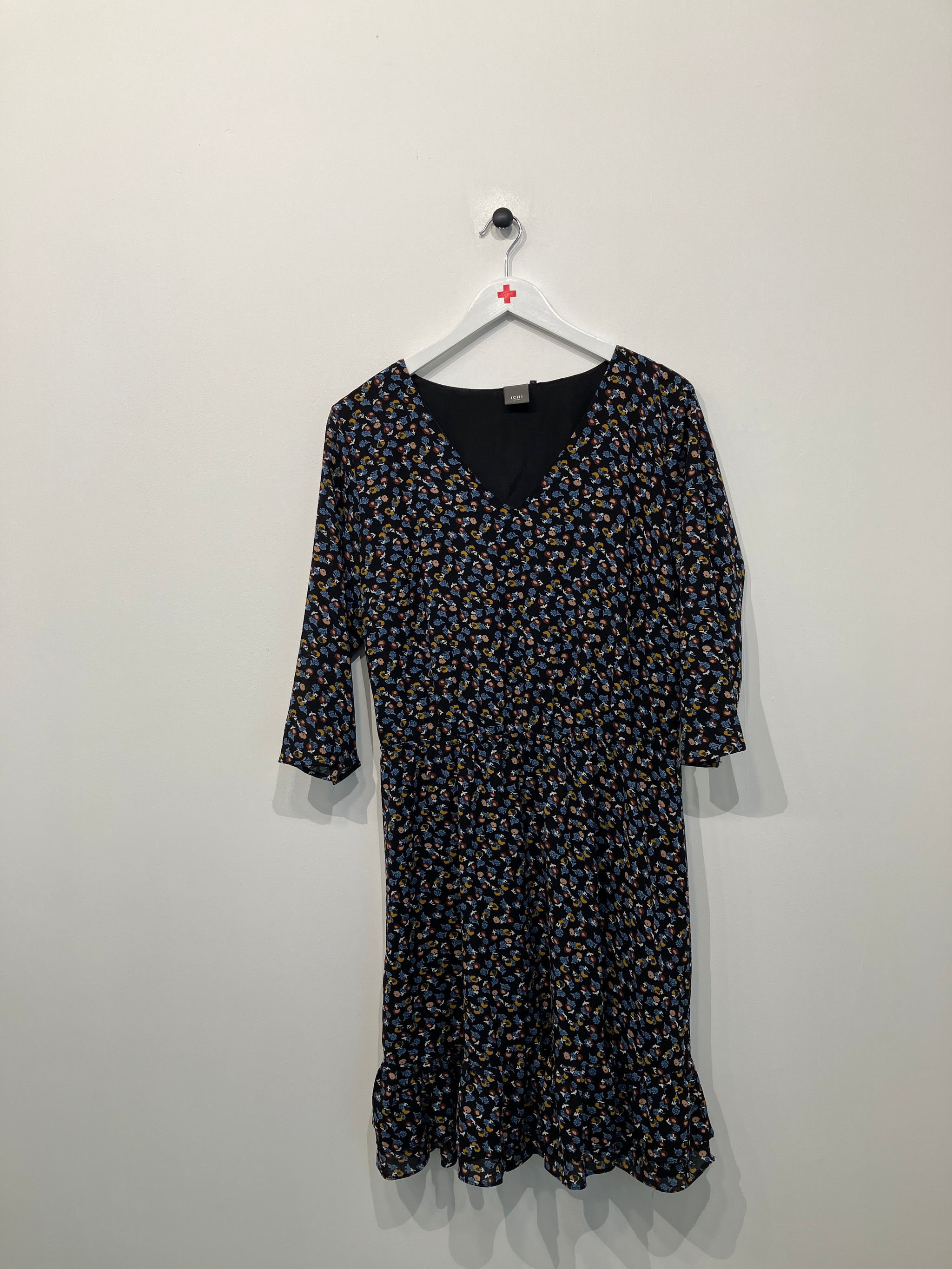Flot lang Ichi kjole med smukt overflademønster og flæser forneden. Mangler vaskemærke.
