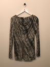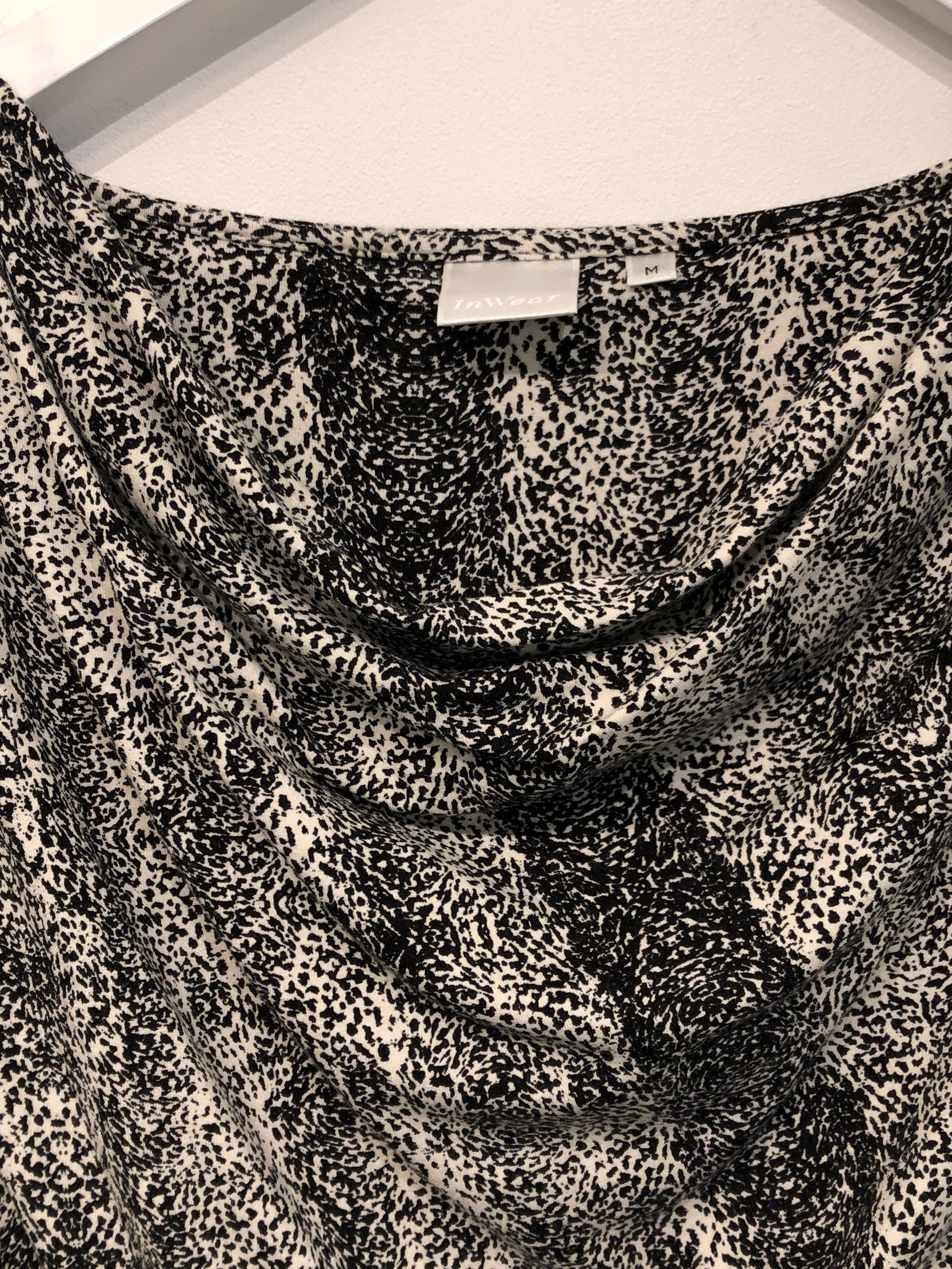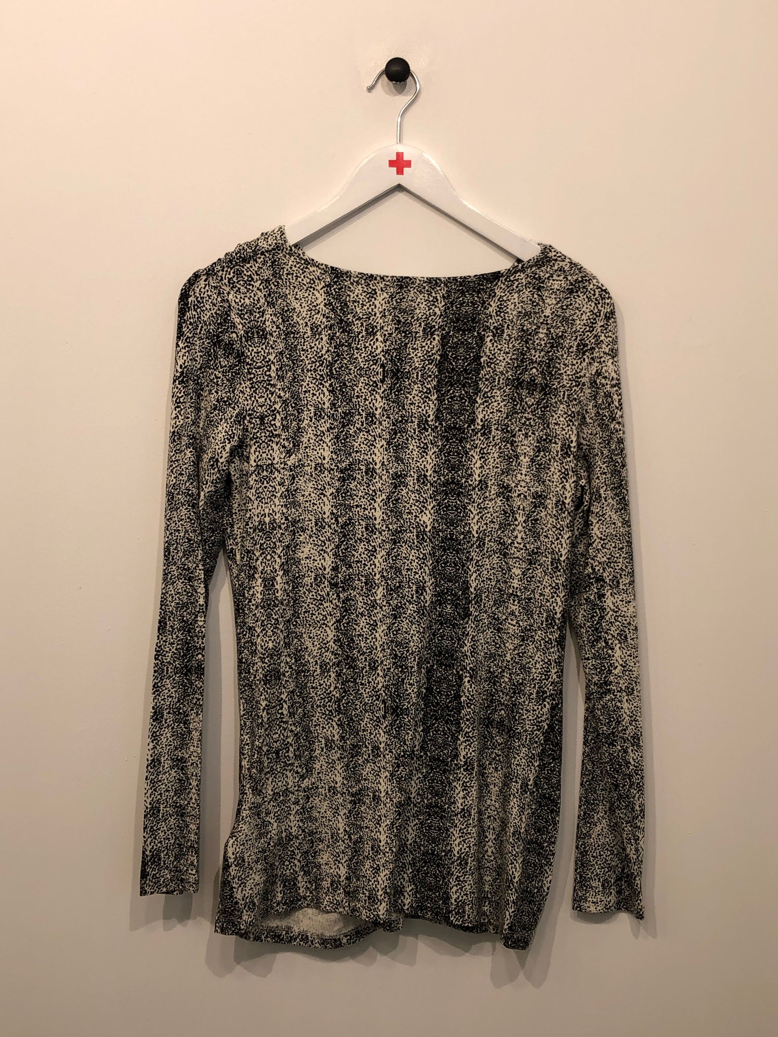 Fin bluse med draperet halsudskæring og lange ærmer.