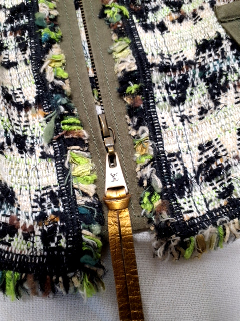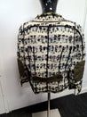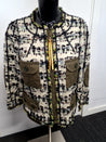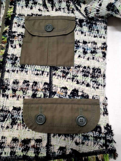 Jakken har et struktureret design med broderede detaljer og knaplommer. Med albue lapper og afskåret indsnit i ærmerne