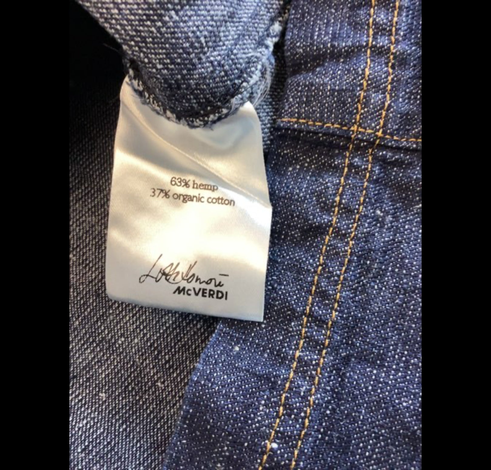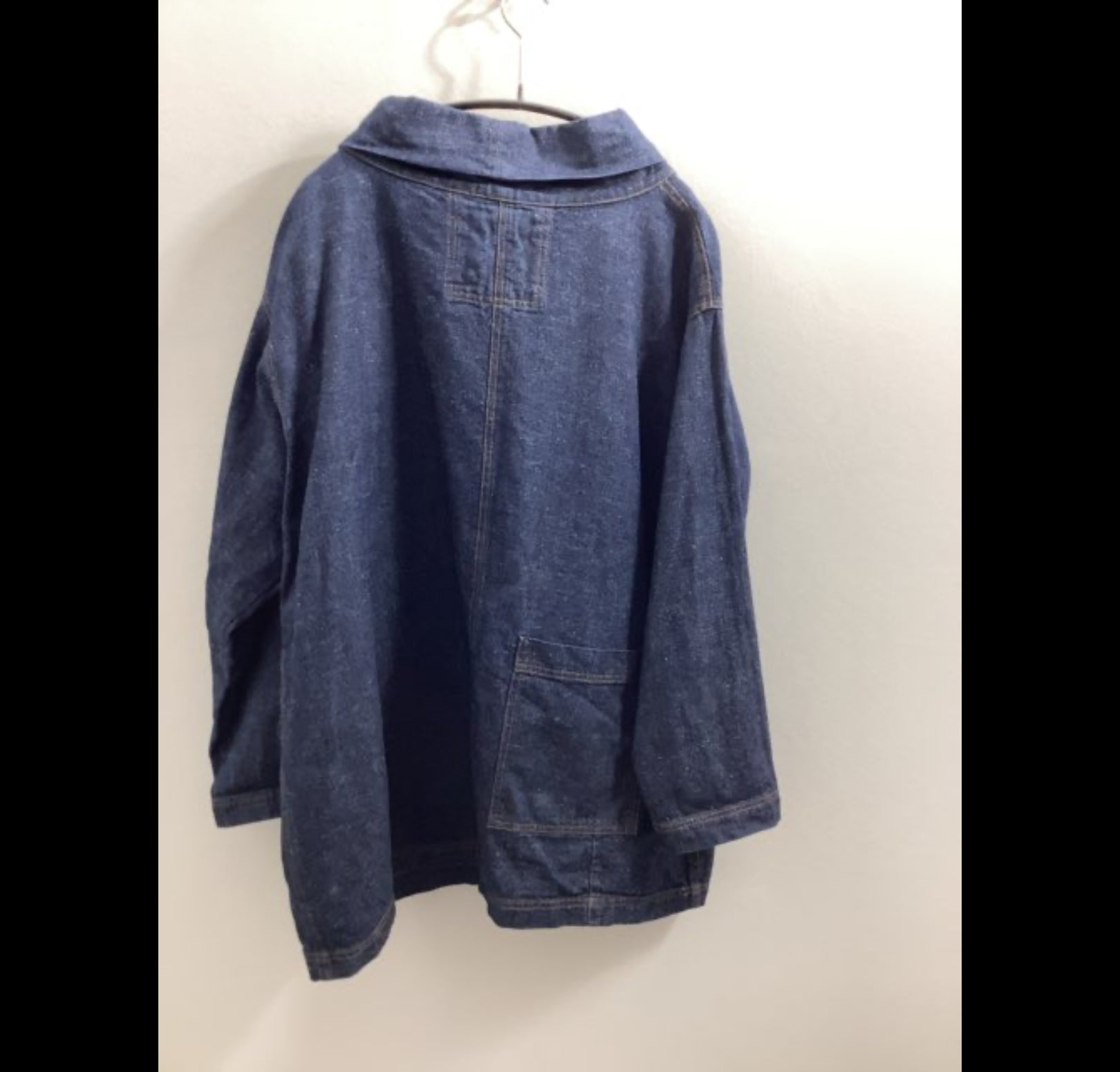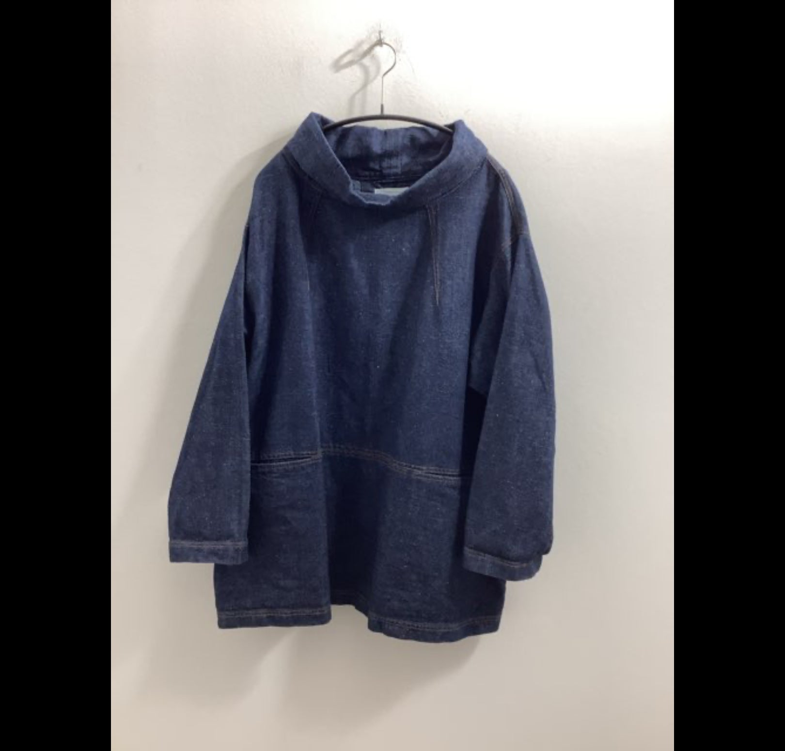 O566 Produkten er en løs, langærmet skjorte med høj krave. Den er lavet af denim og har syninger og lommer på tværs også bagpå. Brystvidde 120cm længde 70cm. McVerdi størrelse 1