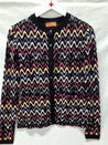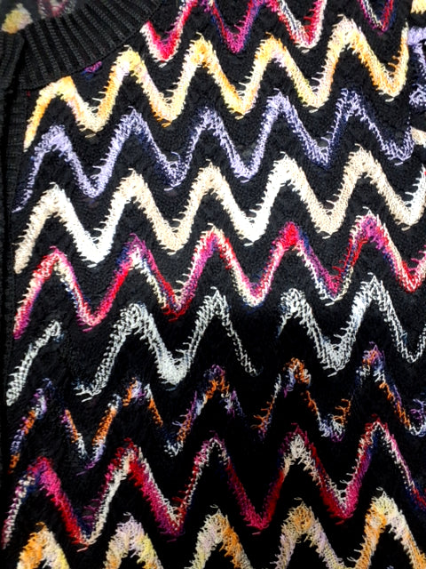 Missoni cardiganen har et zigzag-mønster i flere farver. Grundfarven er sort. Den har knapper foran og lange smalle ærmer.