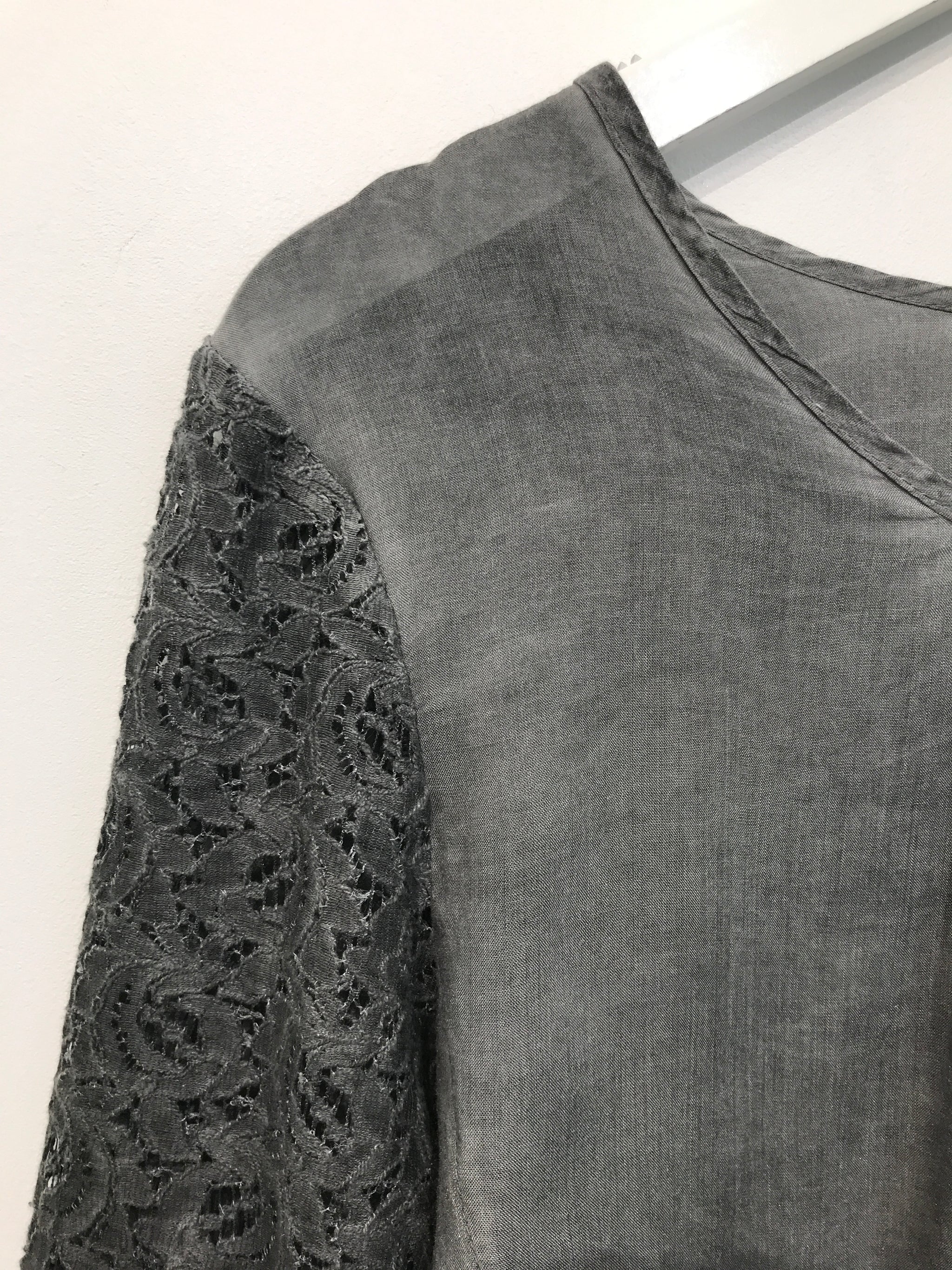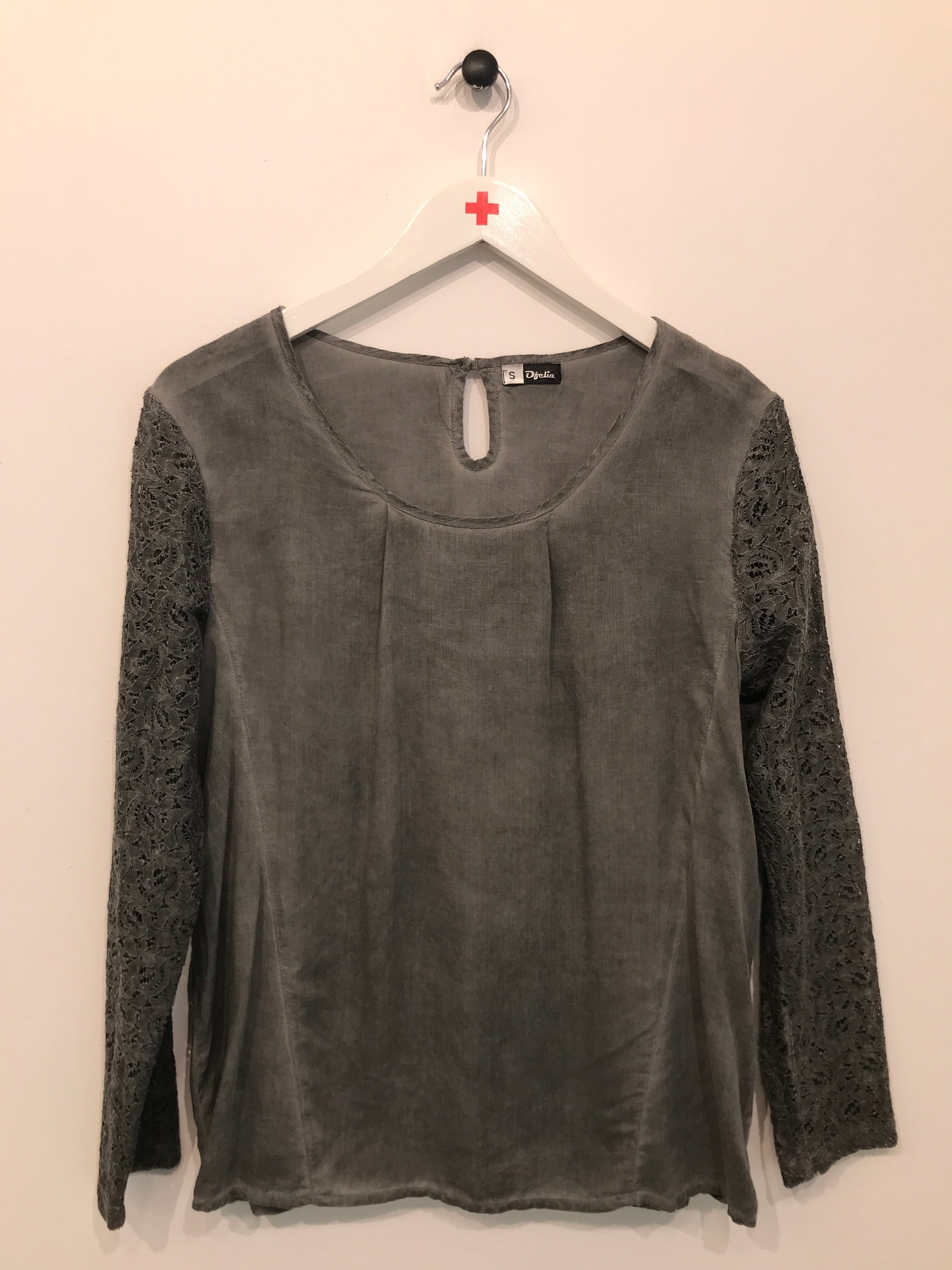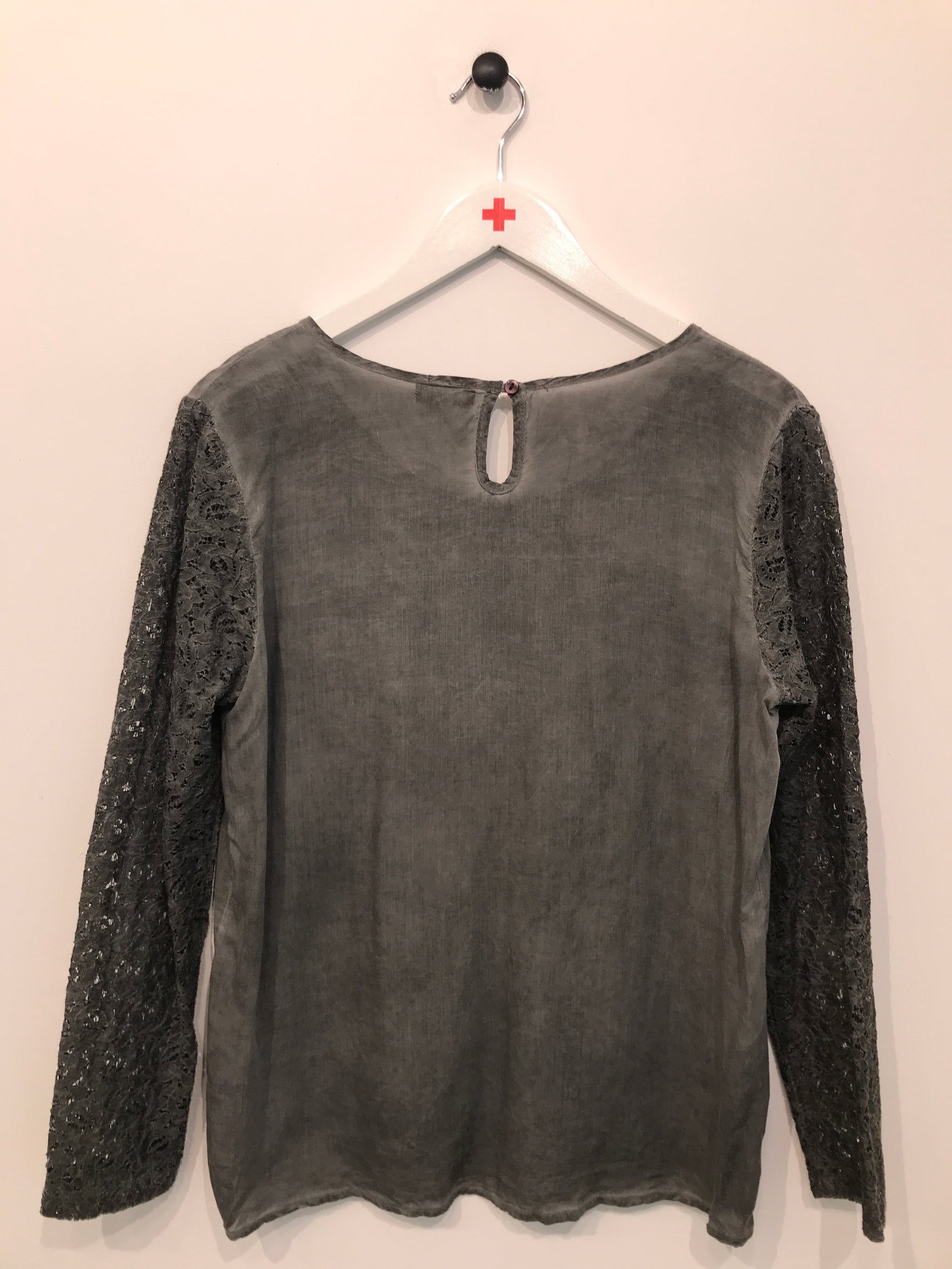 Bluse med lange blondeærmer, rund hals og knaplukning i nakken.