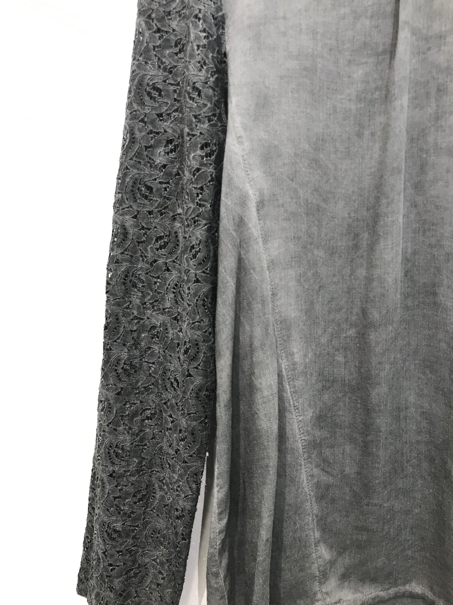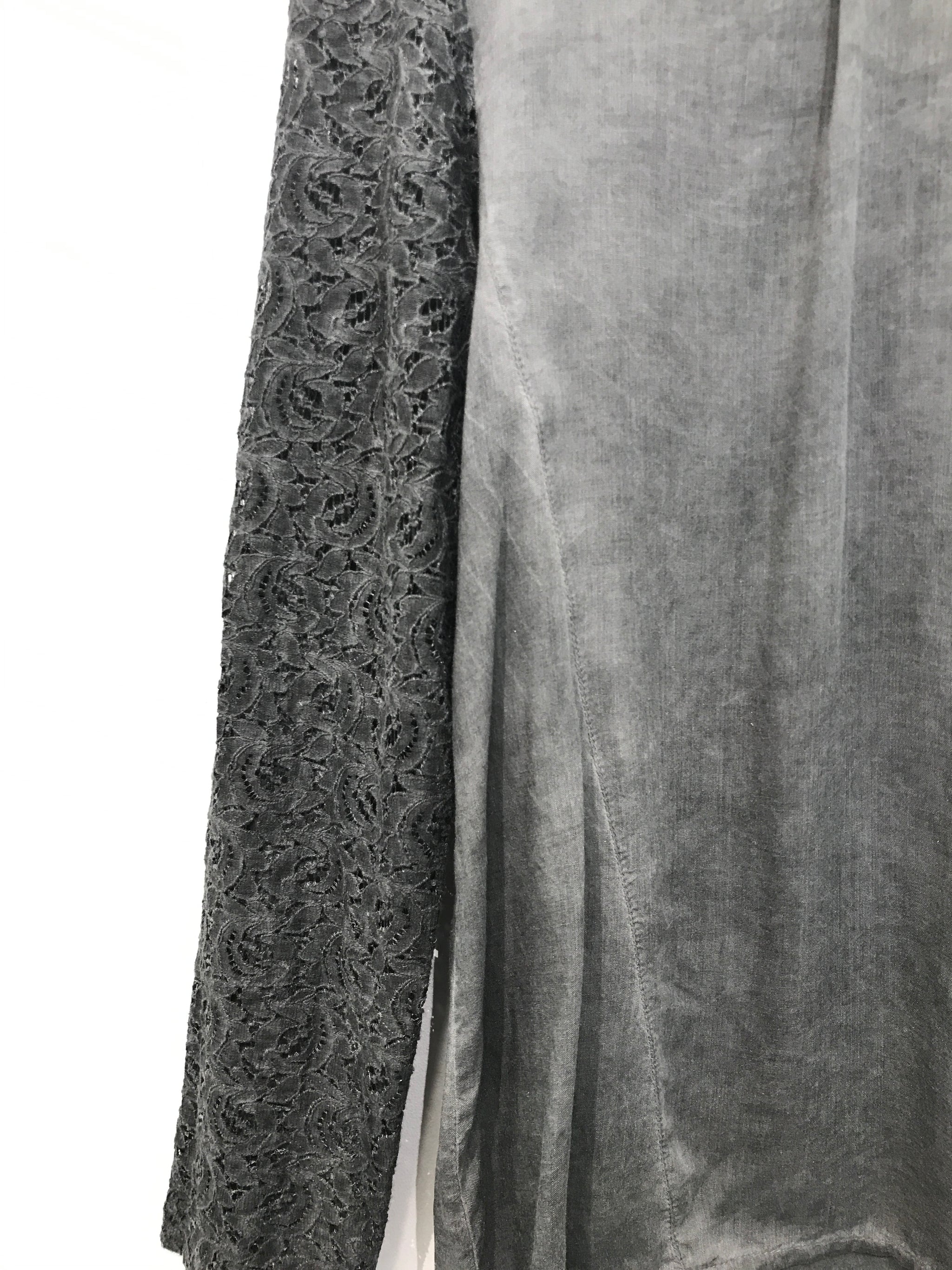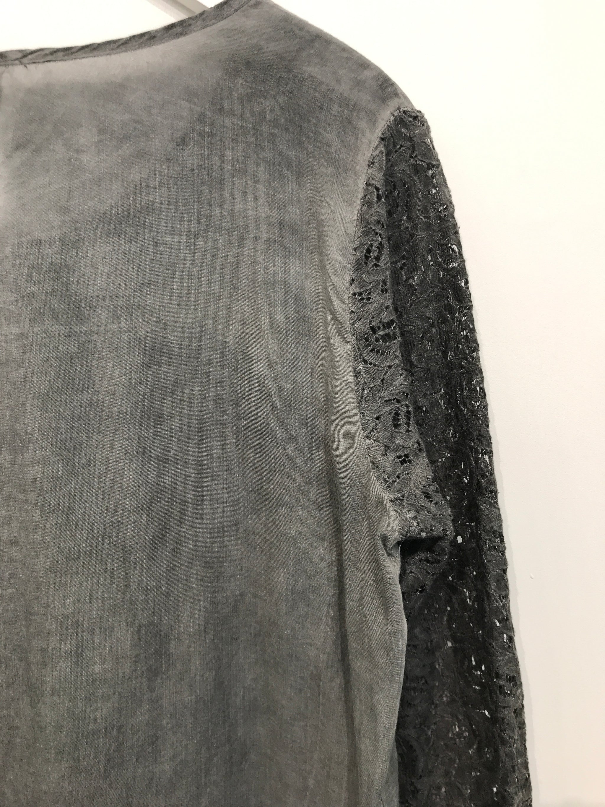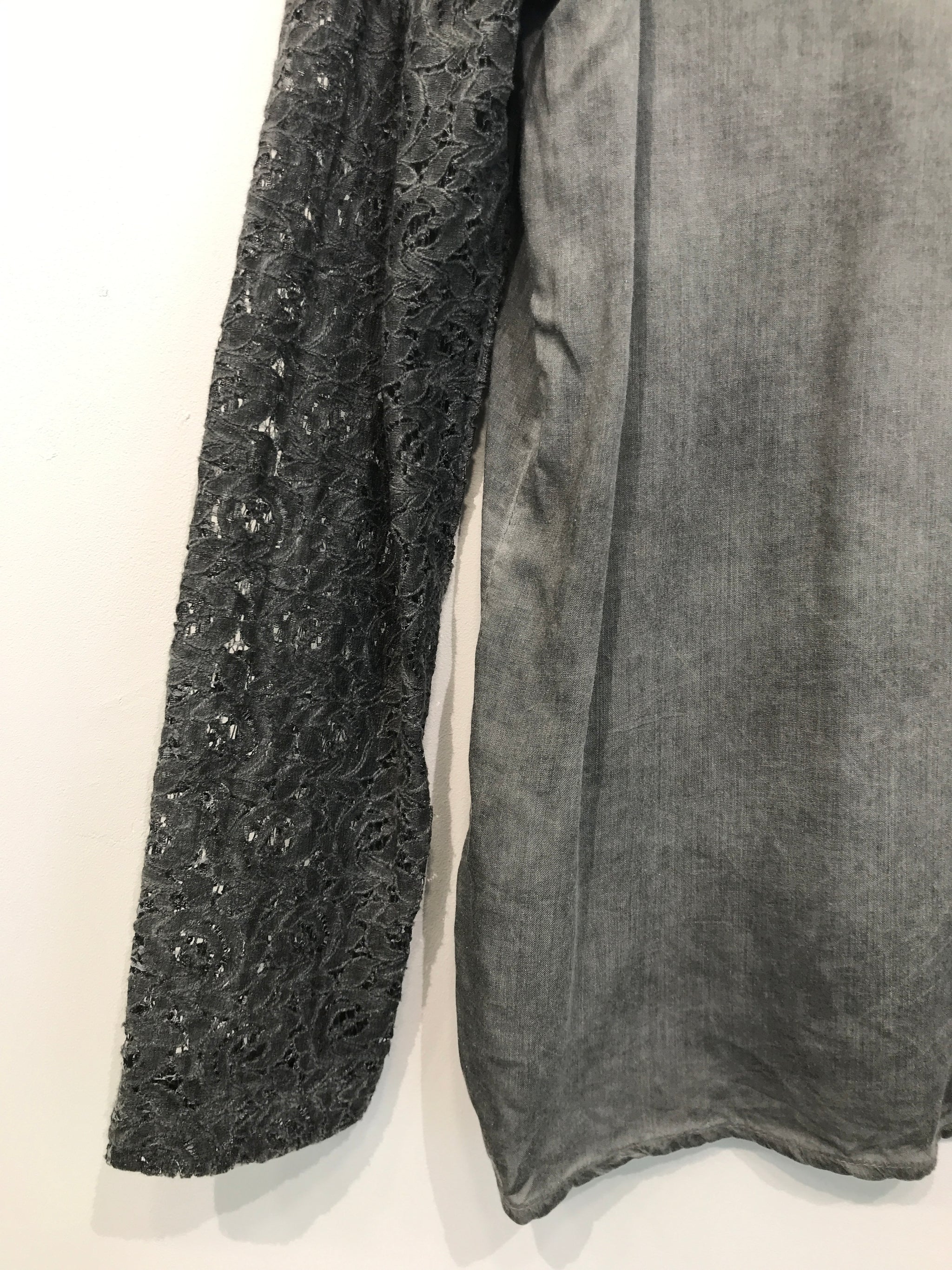 Bluse med lange blondeærmer, rund hals og knaplukning i nakken.