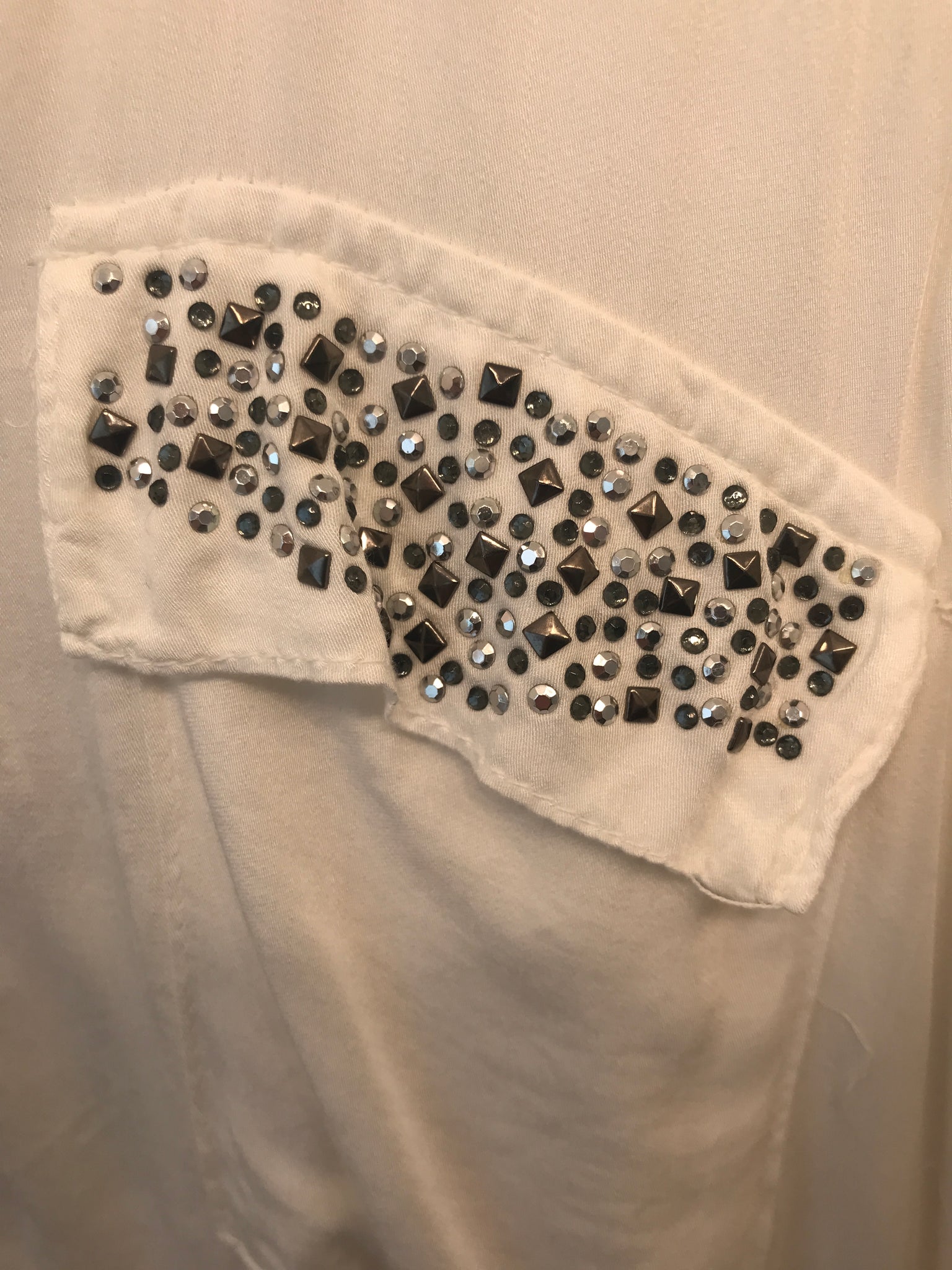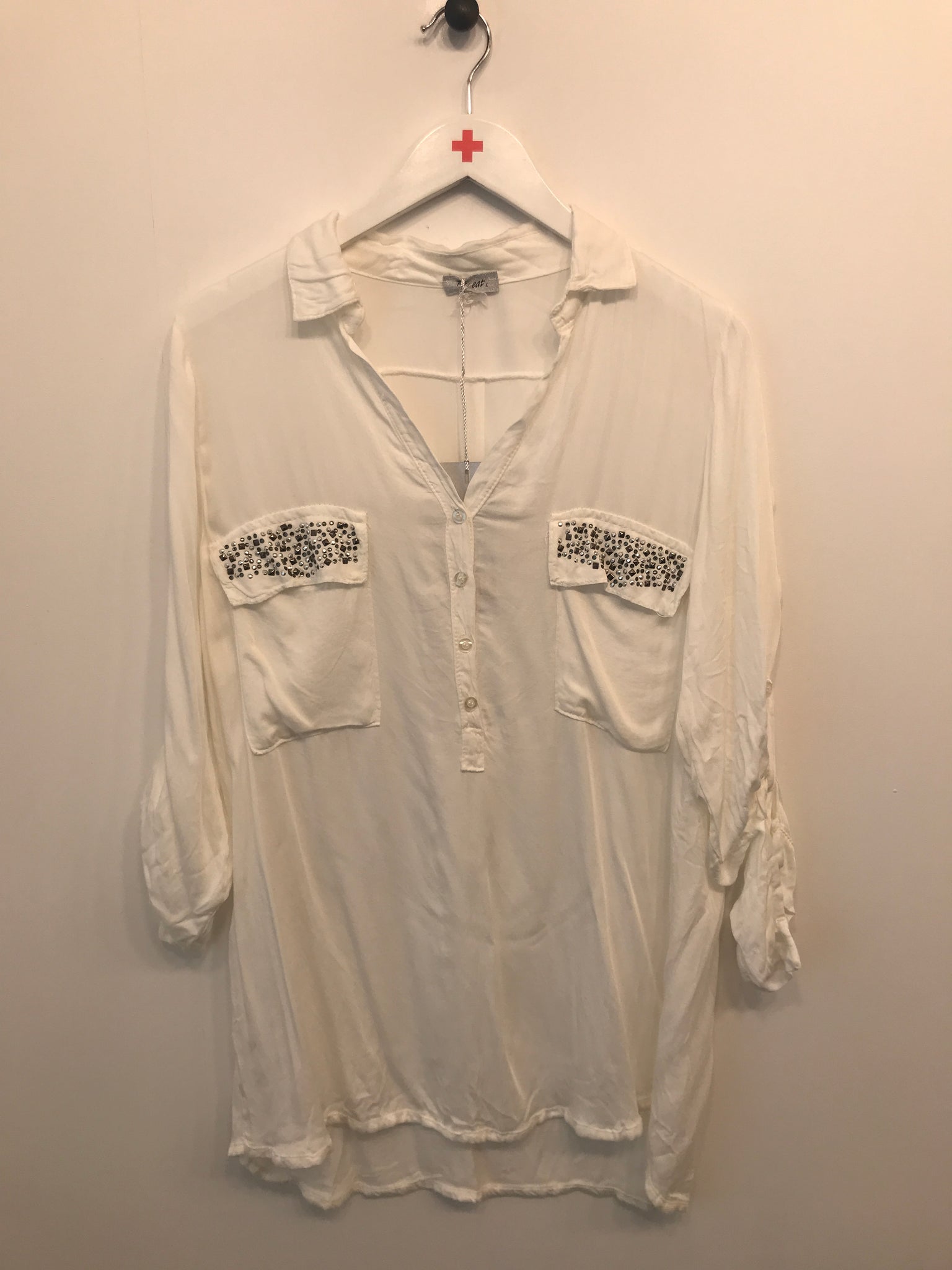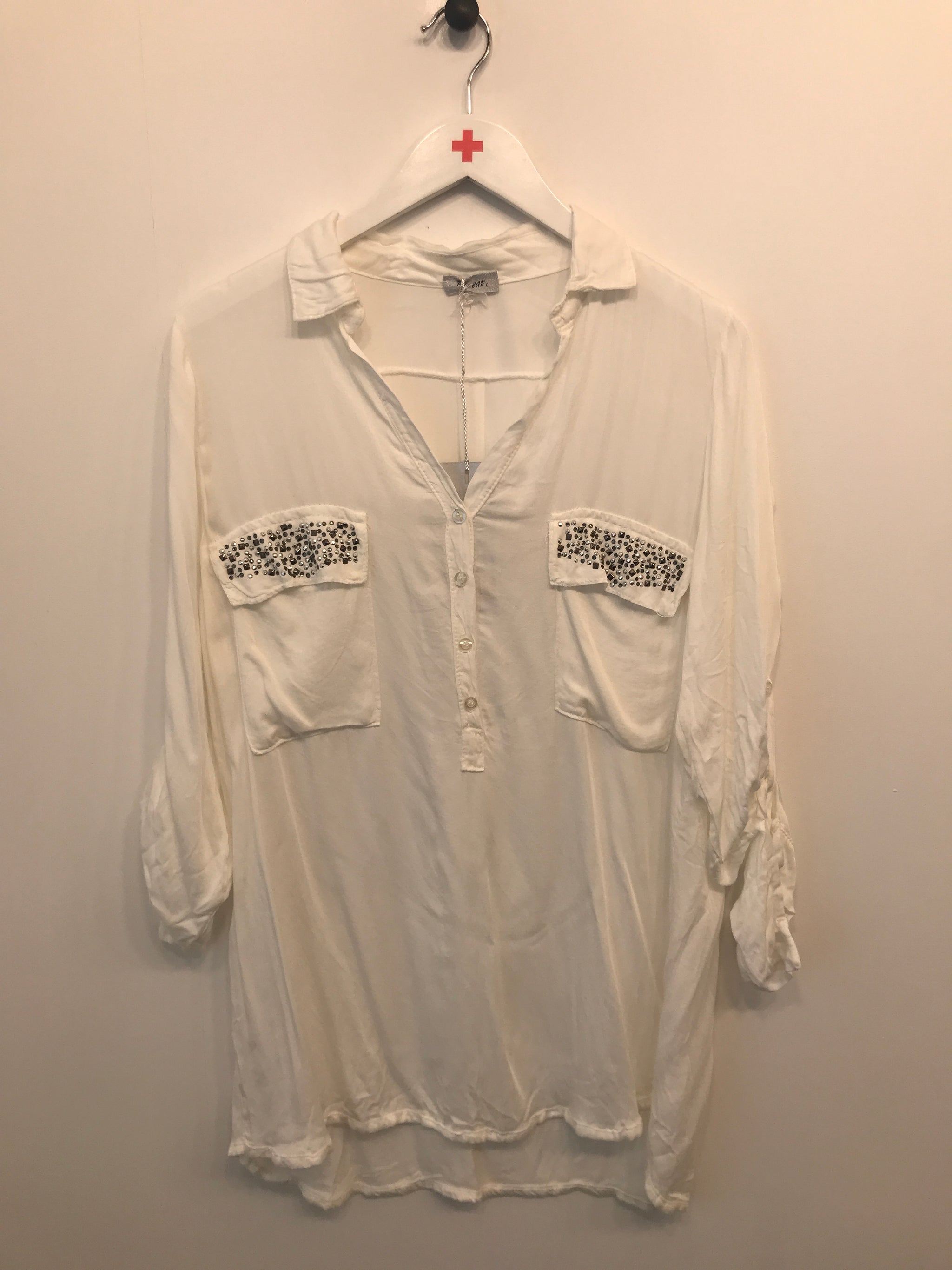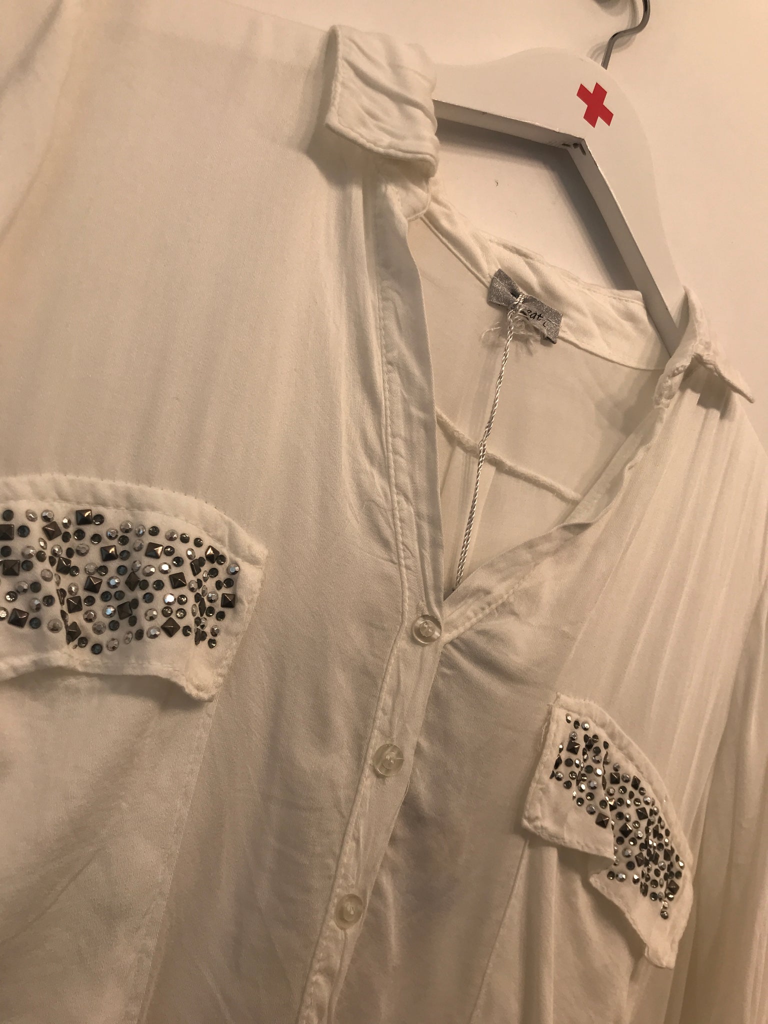 Skjorte med krave og enkelte knapper foran. Ærmerne kan smøges op og fastgøres med knap. Forlommer med flapper pyntet med små sten.