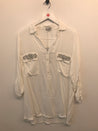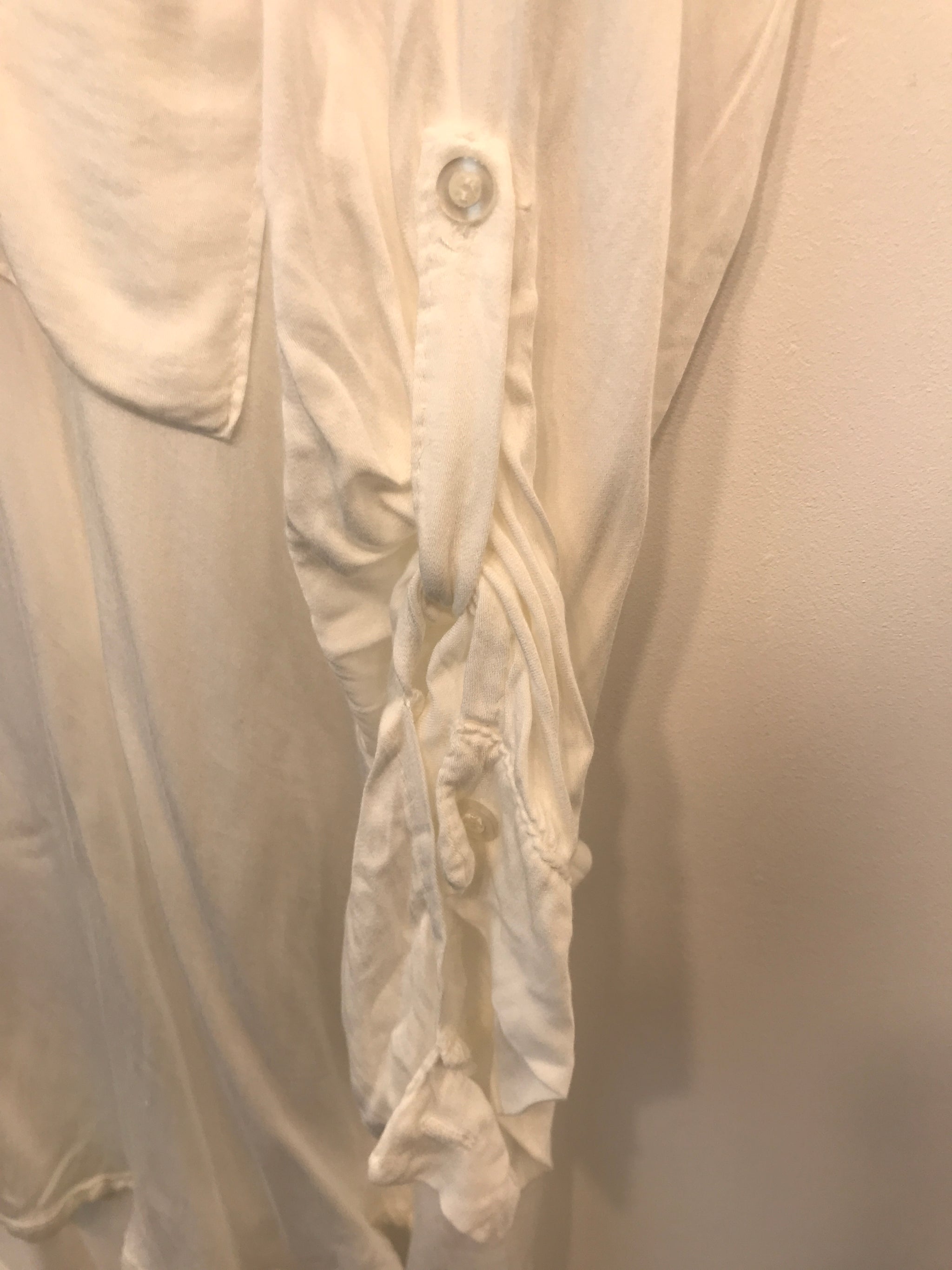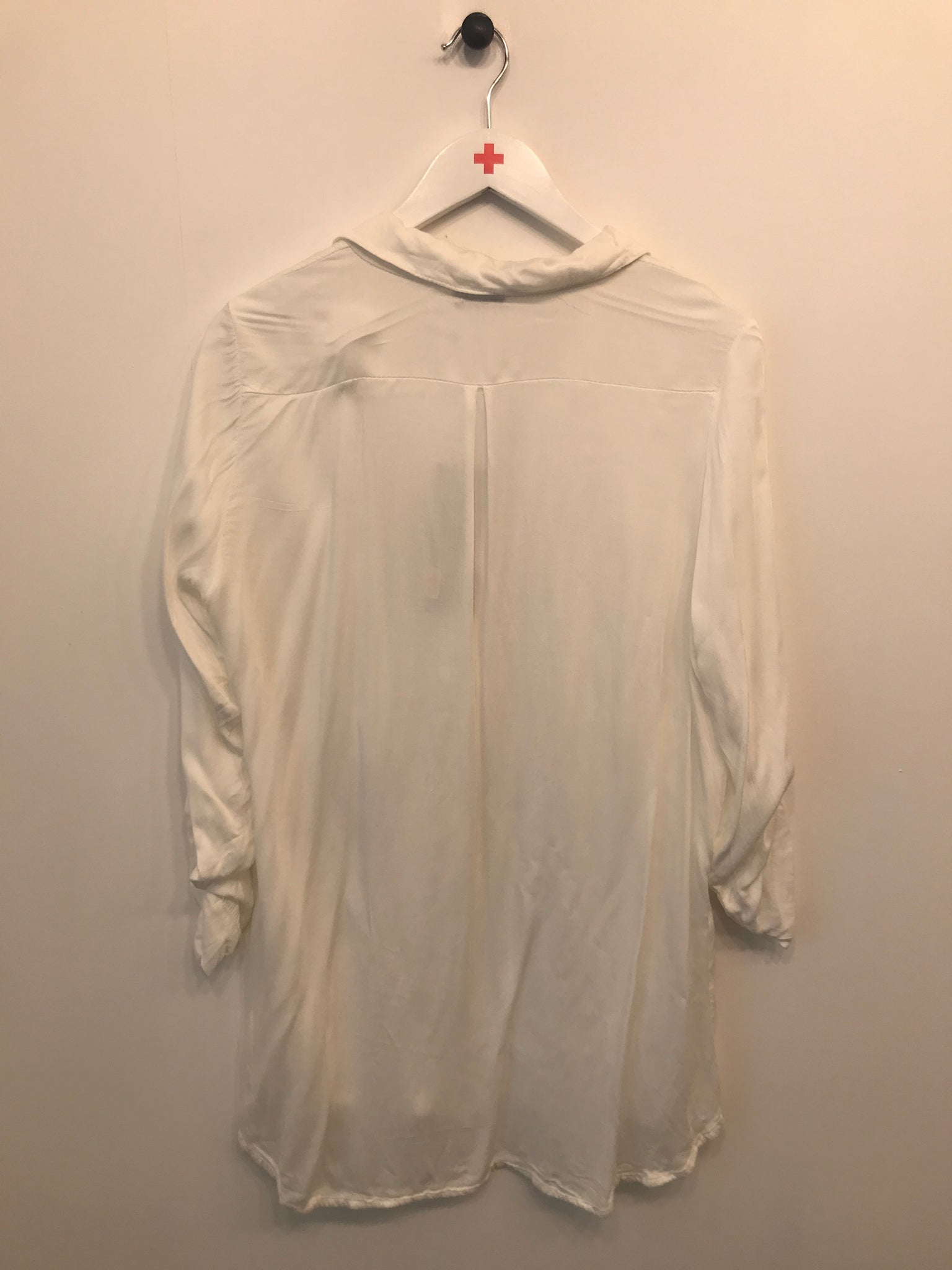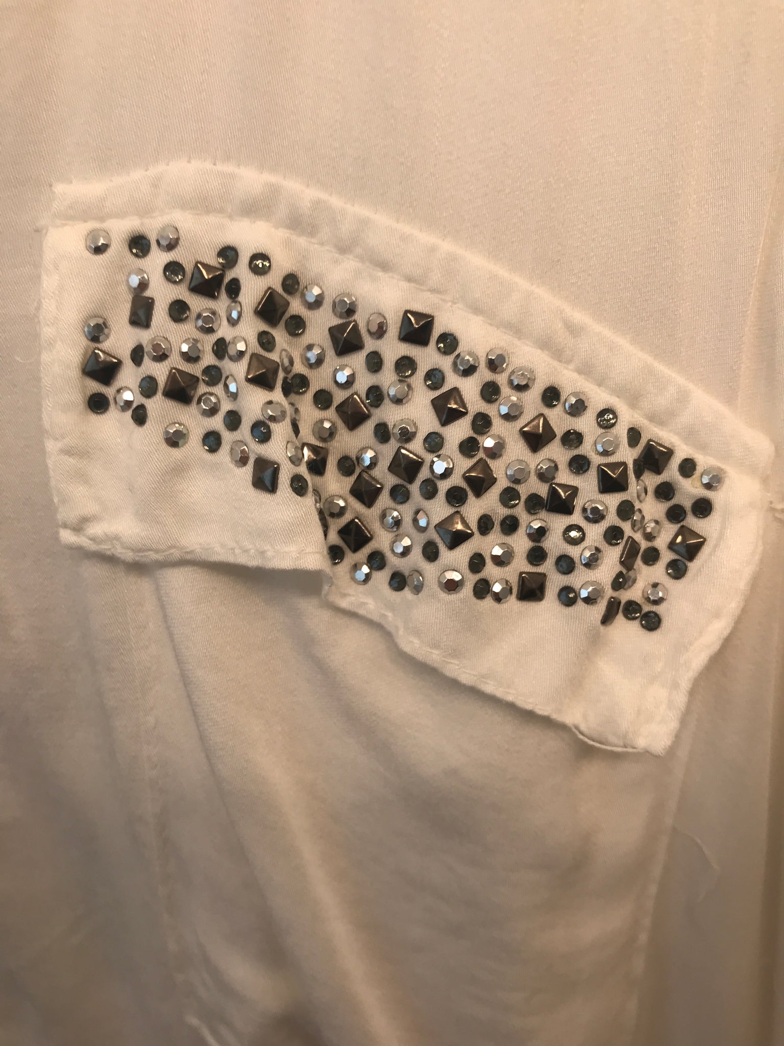Skjorte med krave og enkelte knapper foran. Ærmerne kan smøges op og fastgøres med knap. Forlommer med flapper pyntet med små sten.