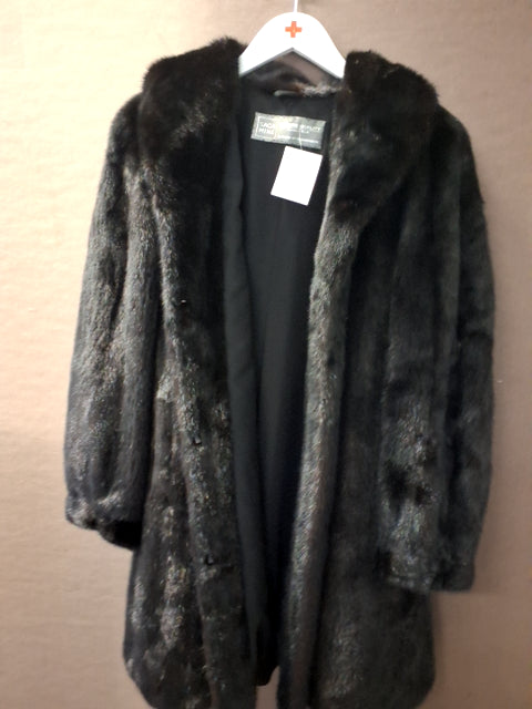 Pelsen har en lang, løs pasfor og bred krave. Den fremstår som ny.