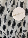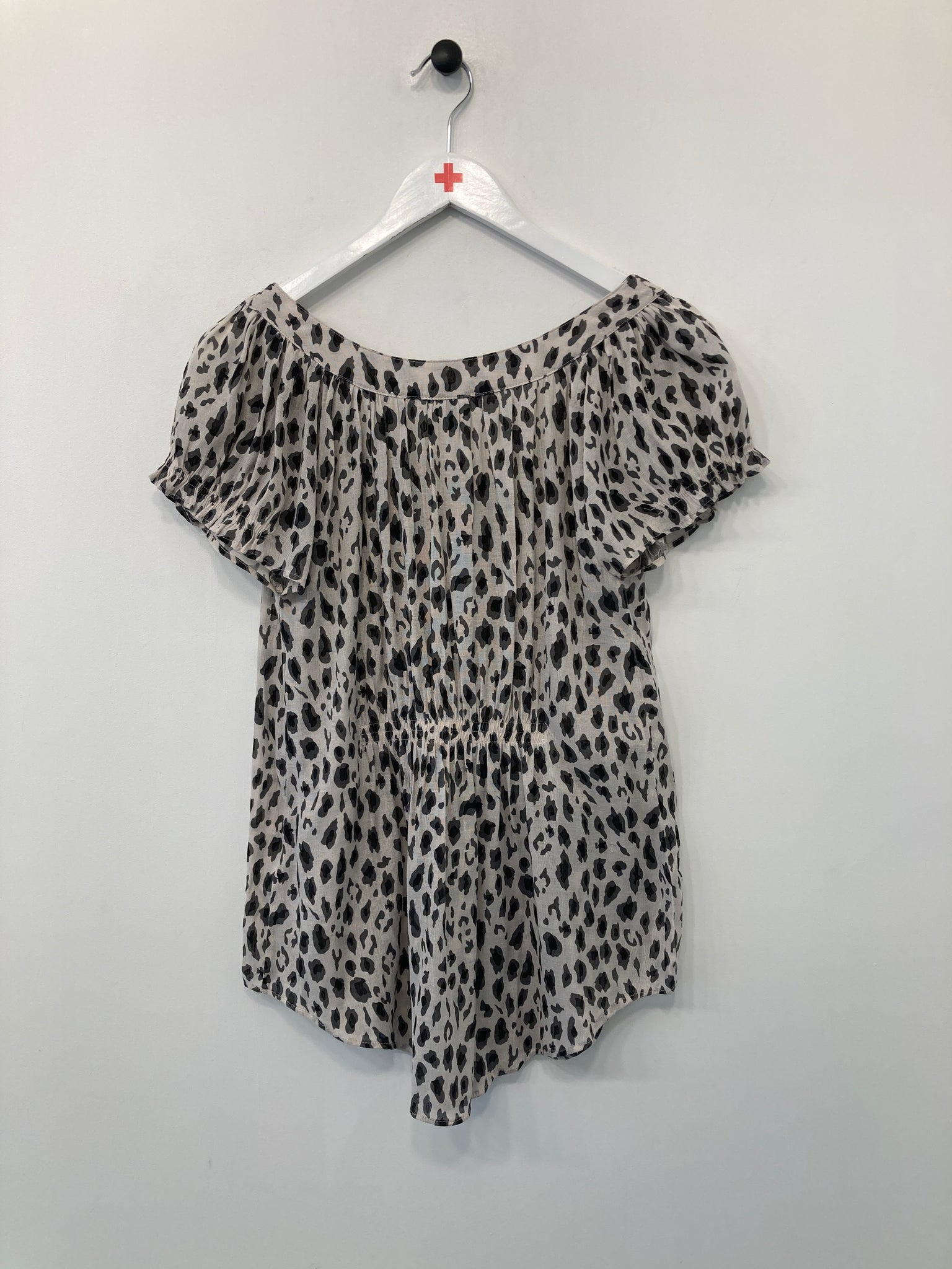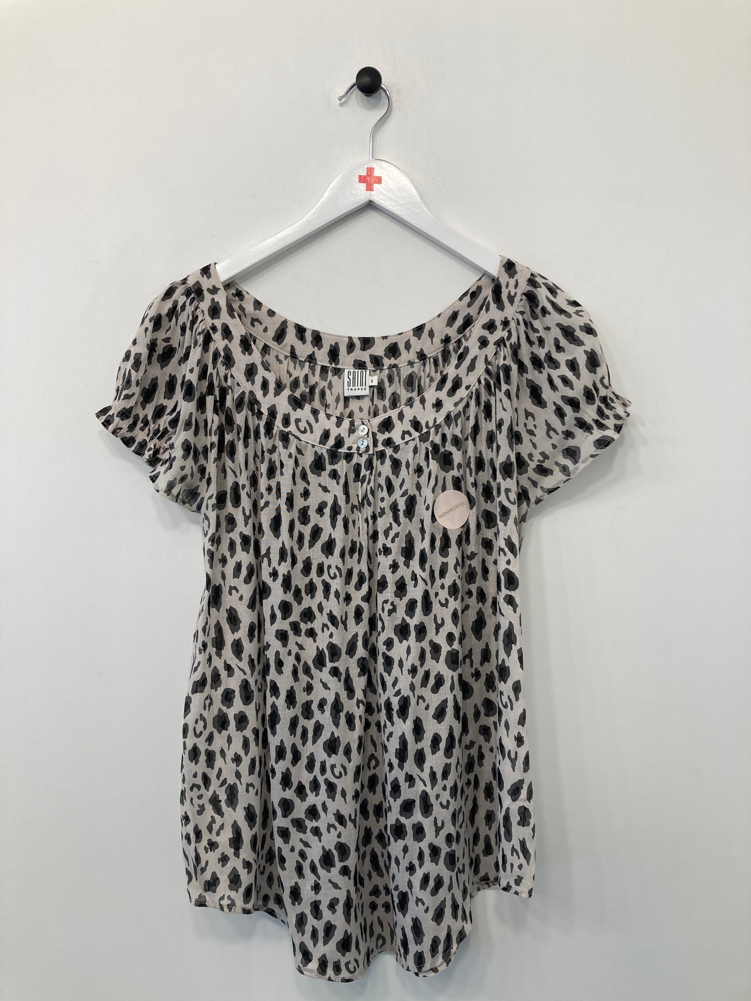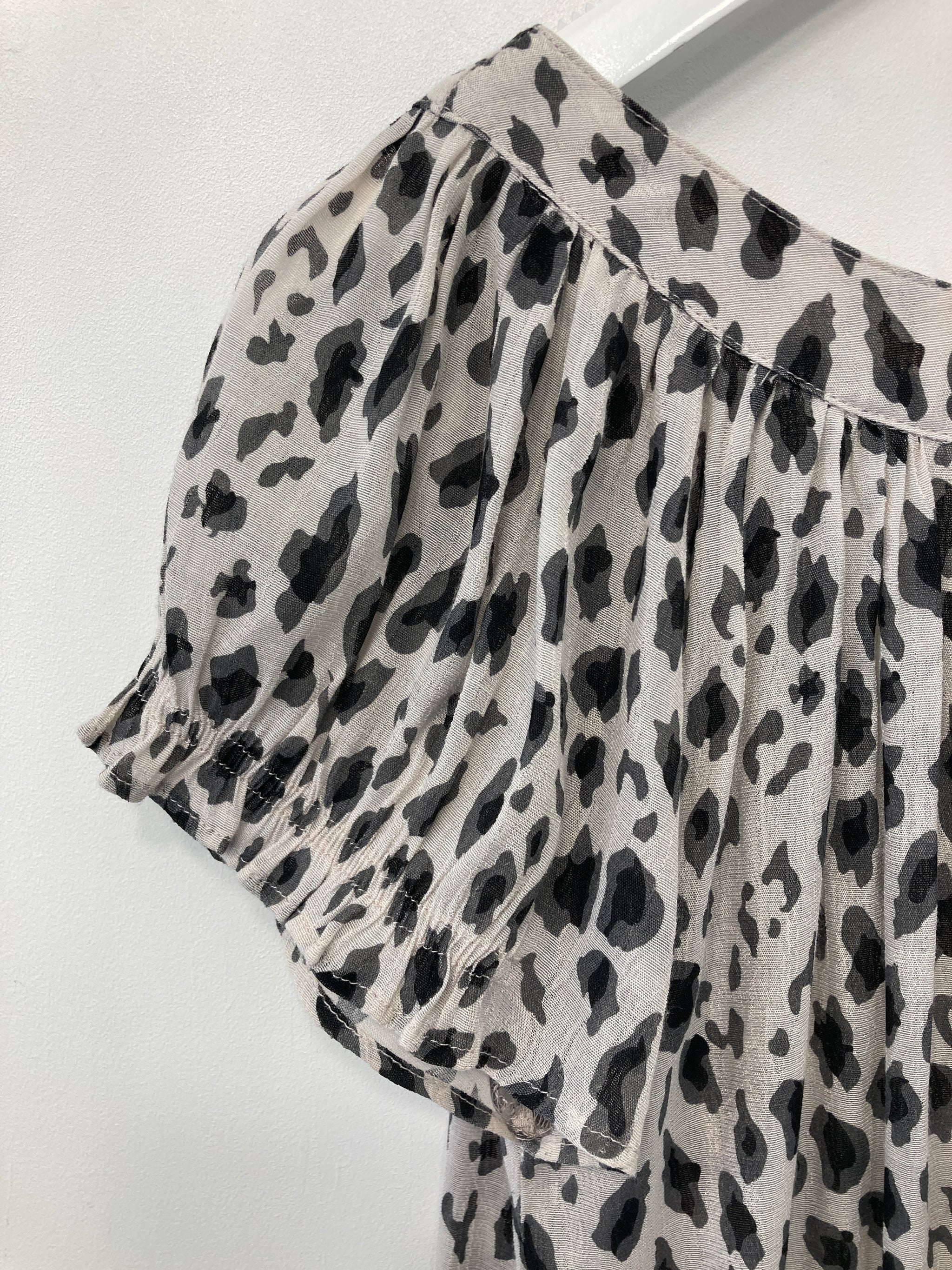 Flot hvid og sort dyreprint bluse med korte ærmer.
