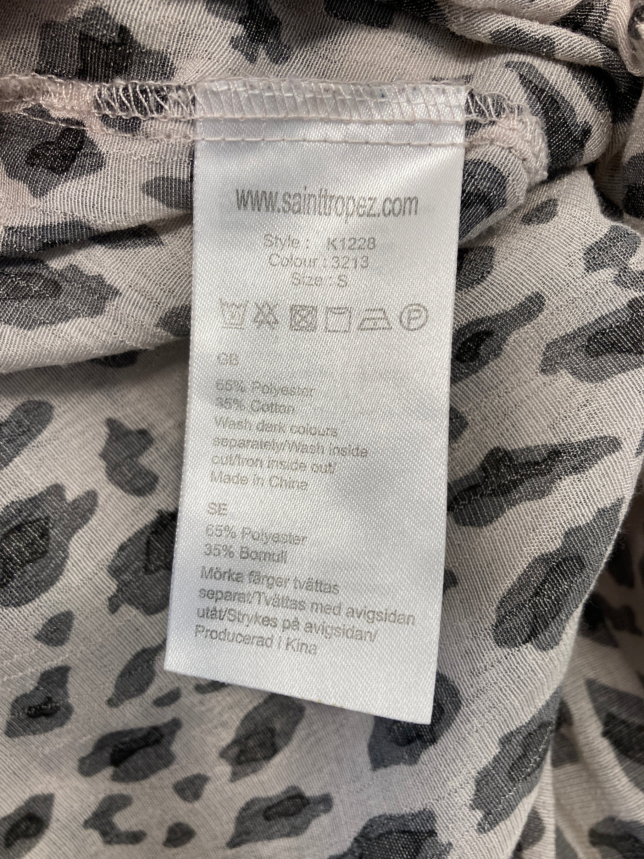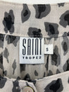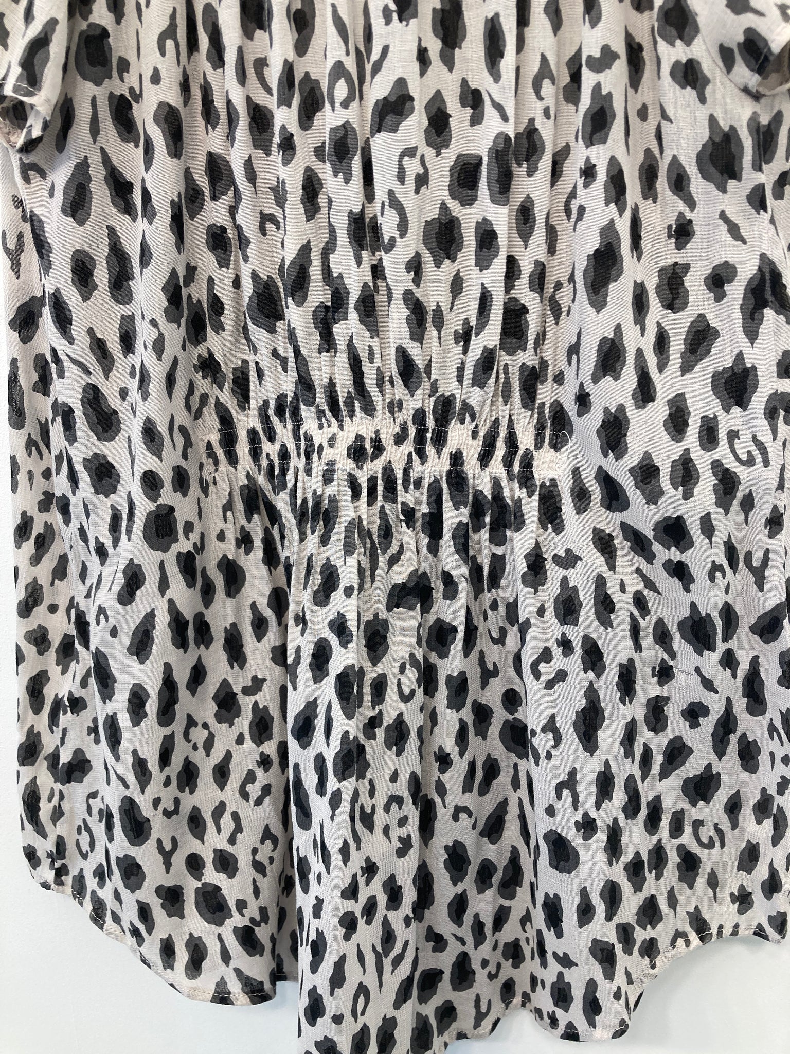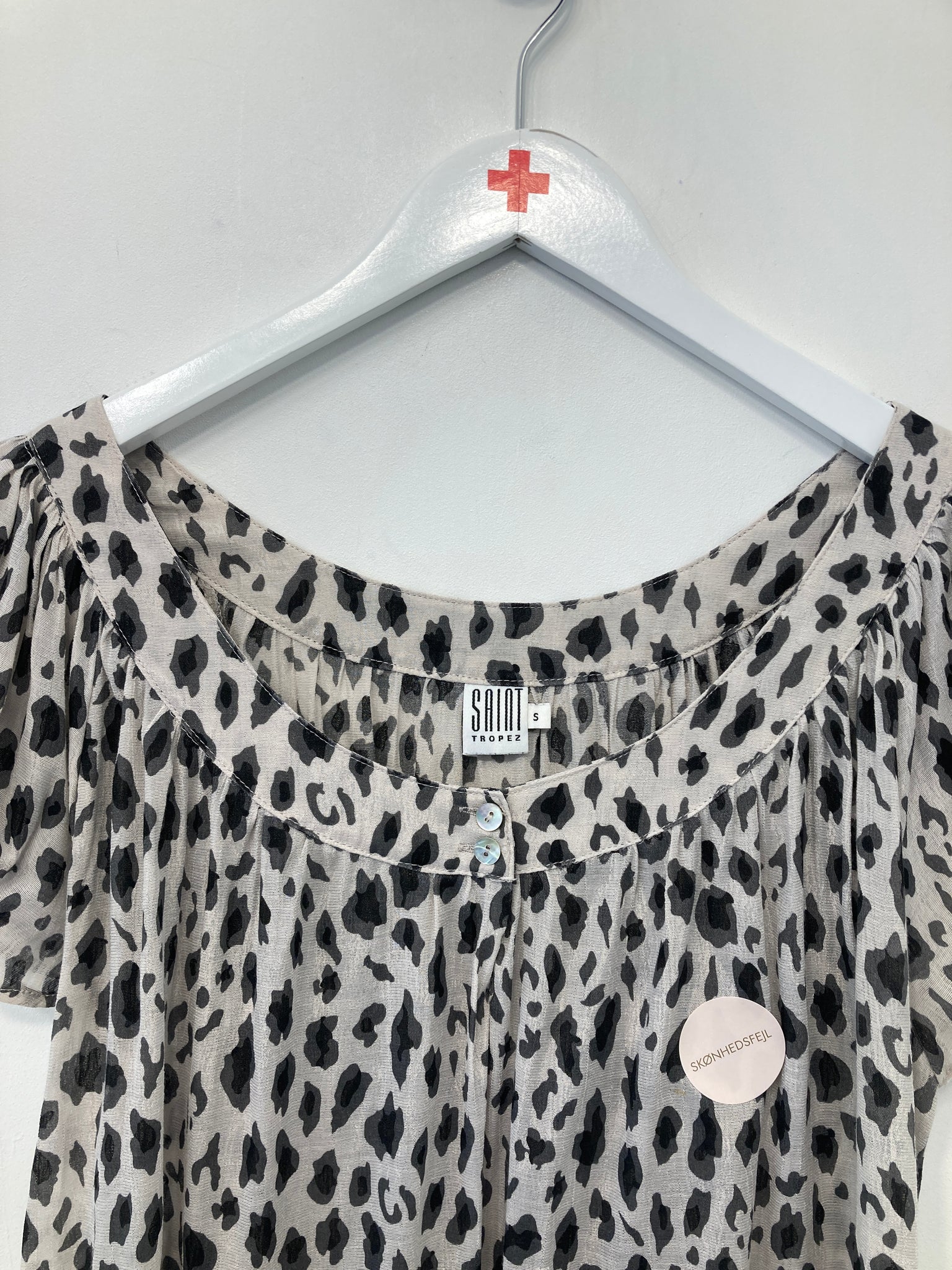 Flot hvid og sort dyreprint bluse med korte ærmer.
