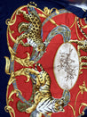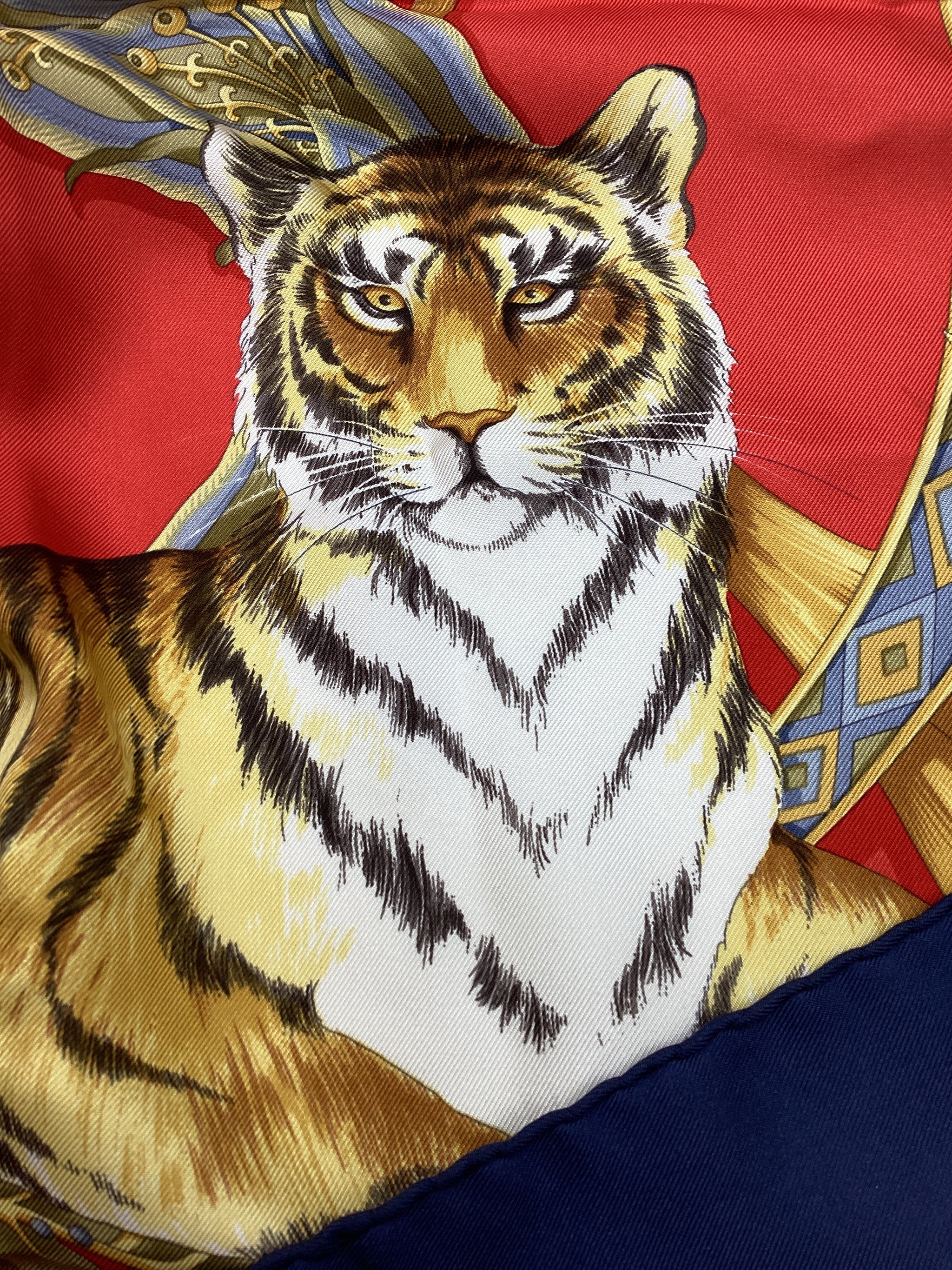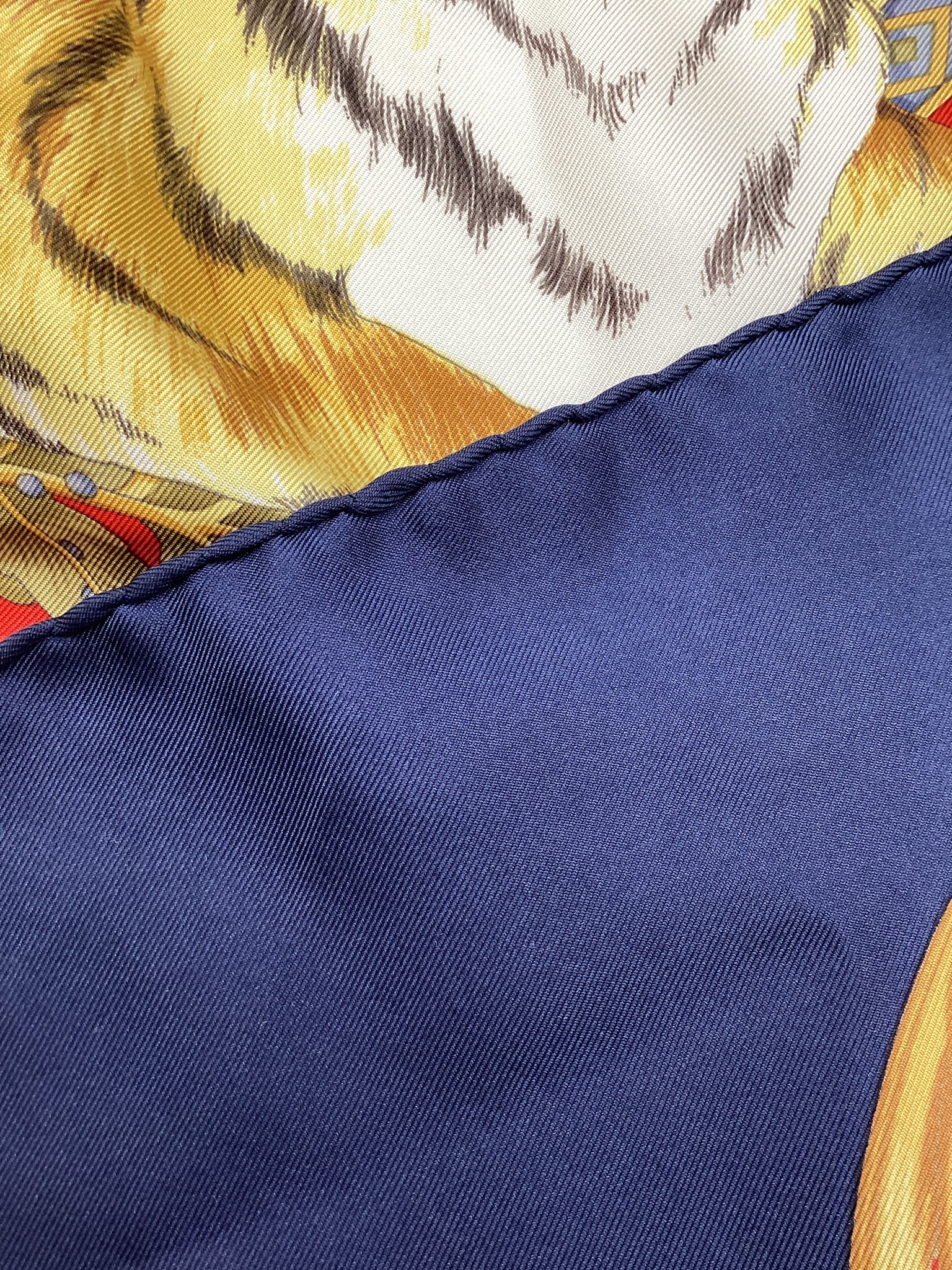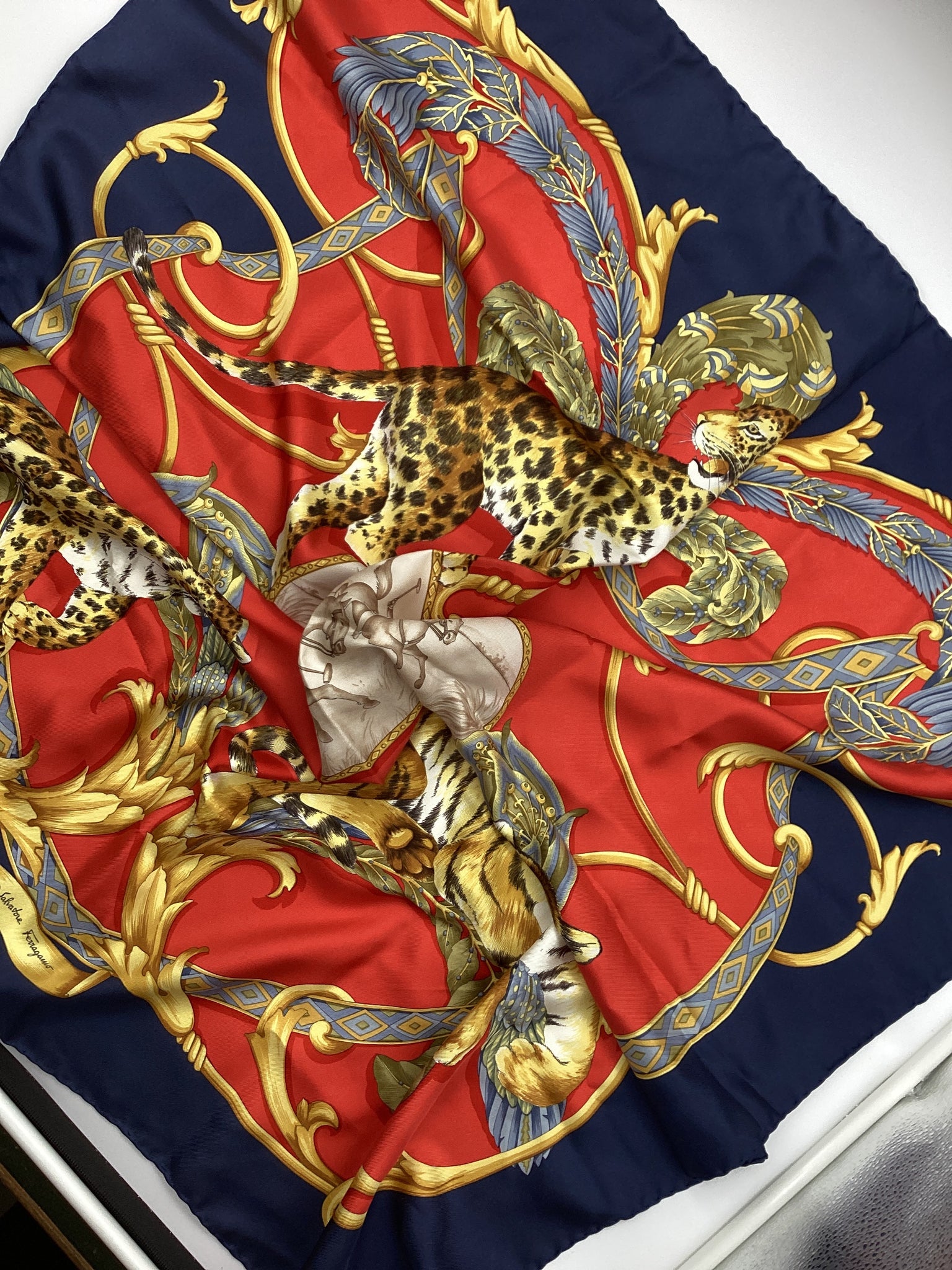 H354 Tørklædet er helsilke. Med dyremotiver og detaljerede ornamenter. Det er lavet af silke og har en glat overflade og har håndrullet kant. 88 x 88cm