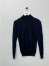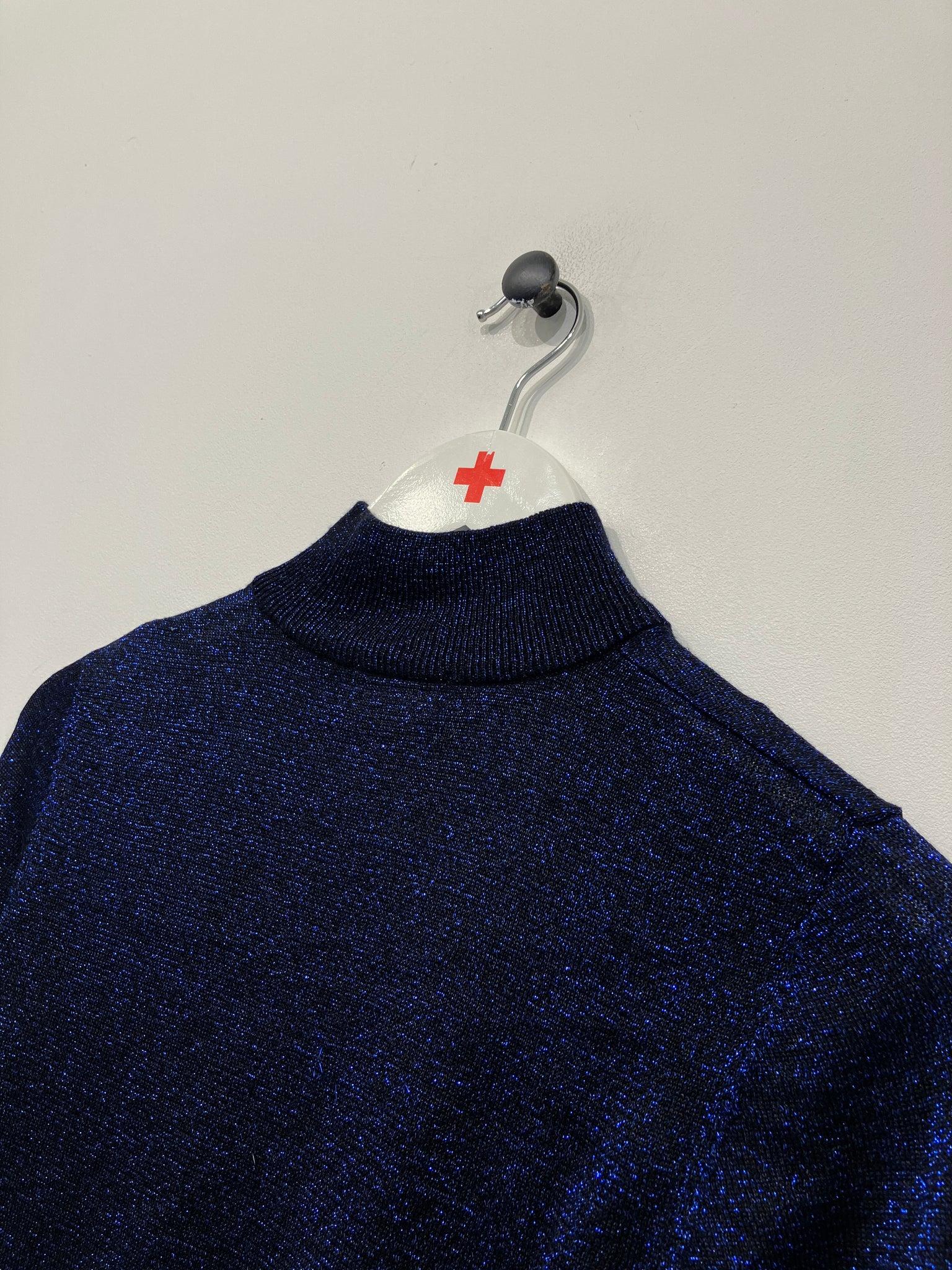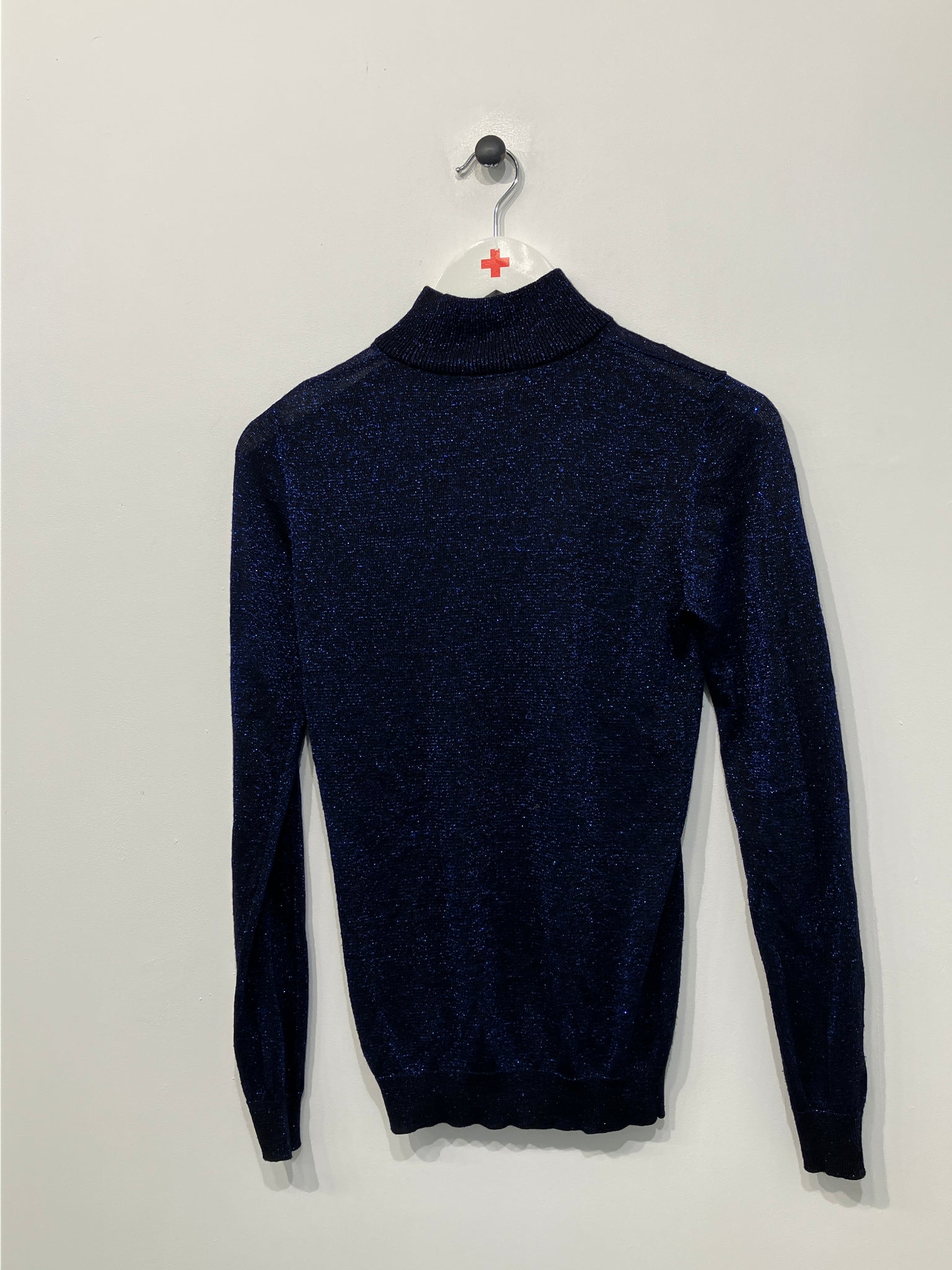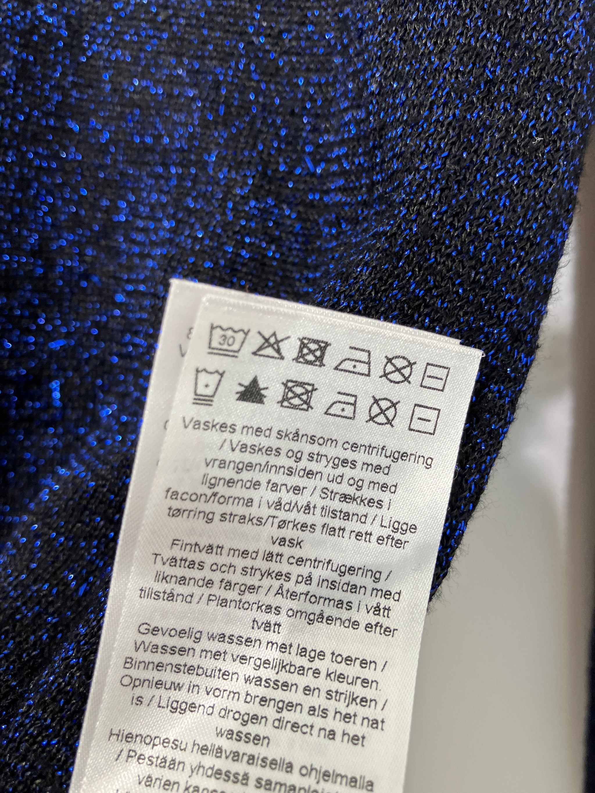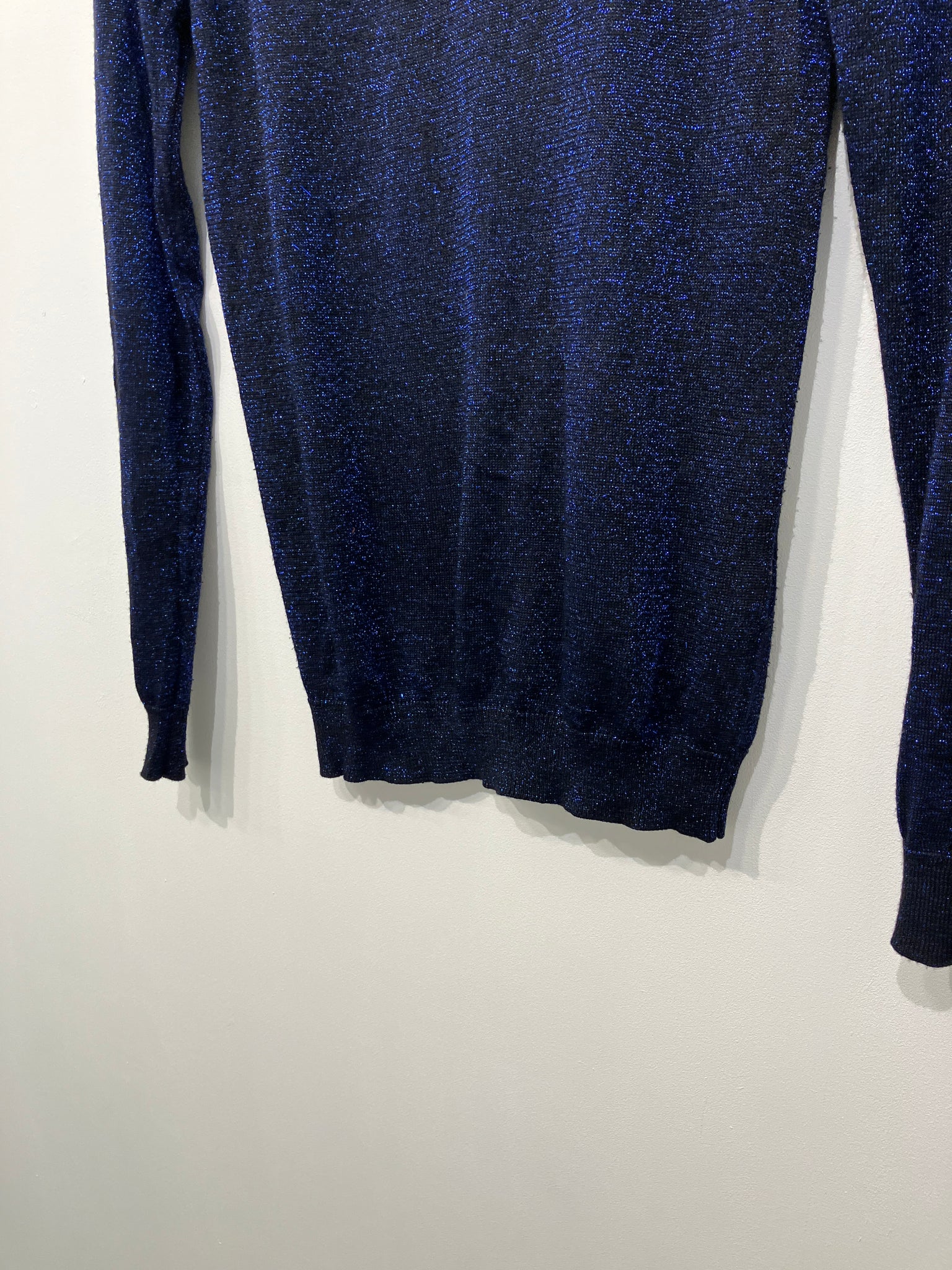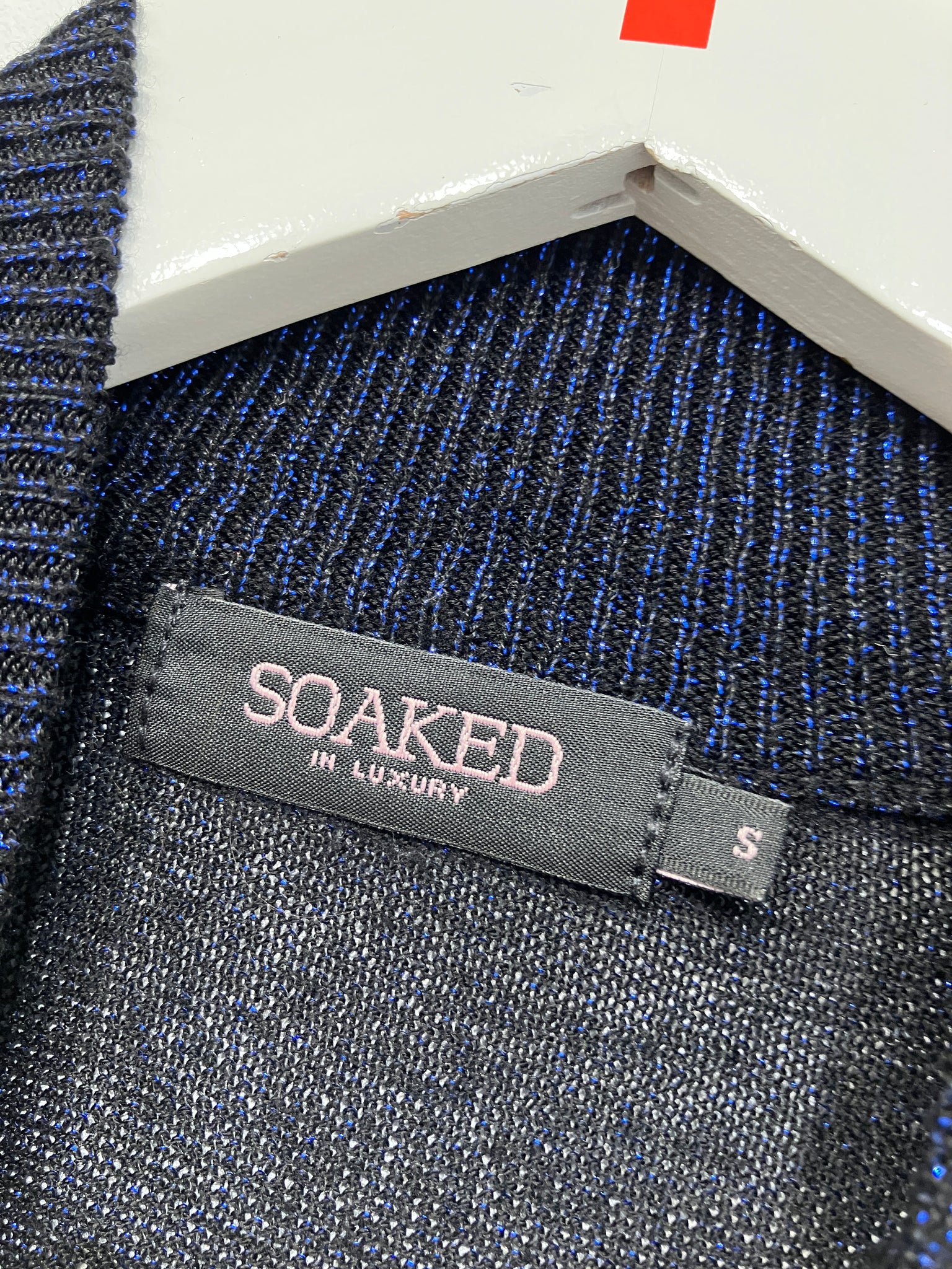 Fin, langærmet striktrøje af mærket Soaked in Luxury med krave og glitrende, blå tråd i stoffet.