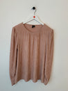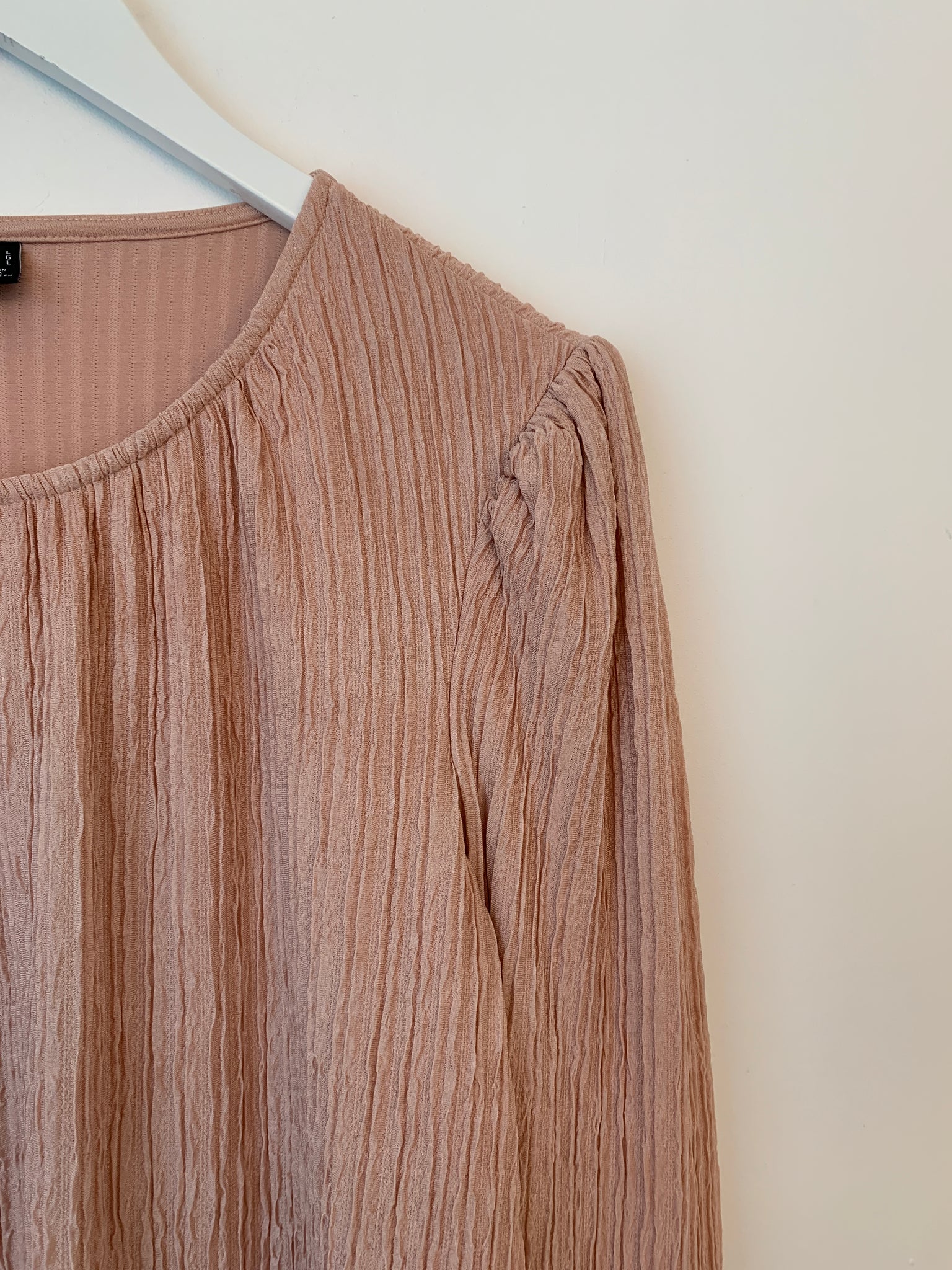Bluse med puf ved skulderne og rynke ved halsudskæring.