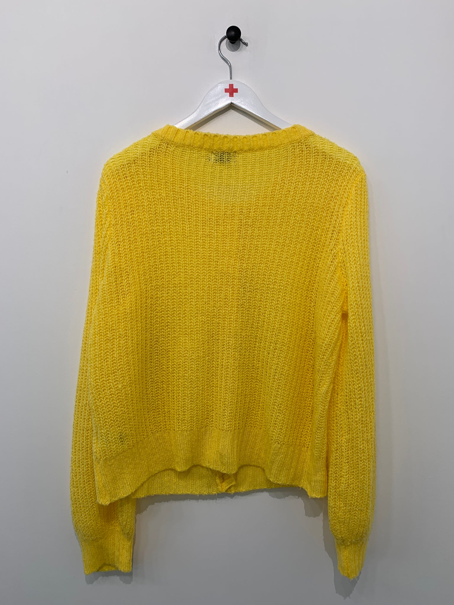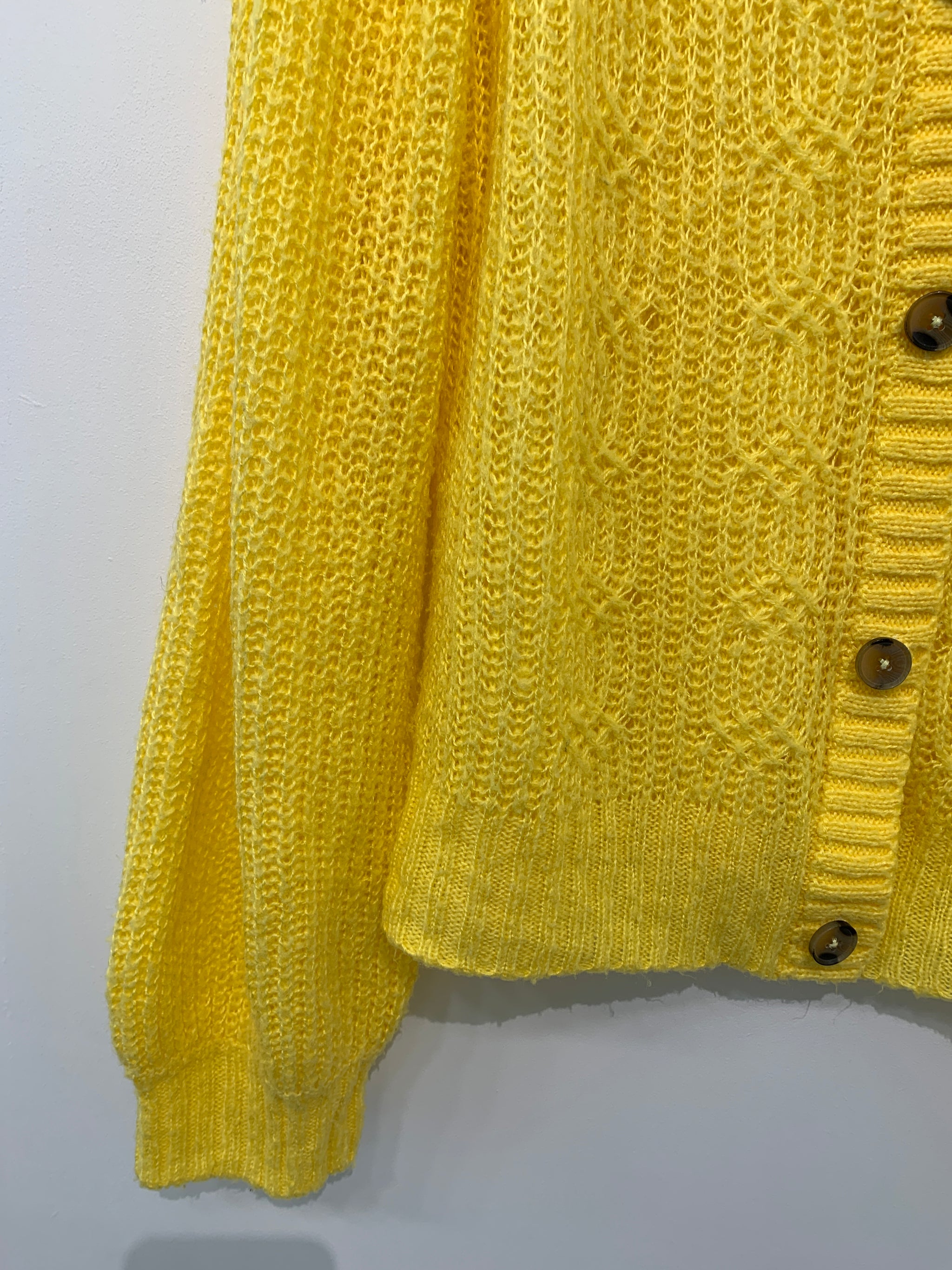 Strik cardigan. Knaplukket, rund halsudskæring og lange ærmer.