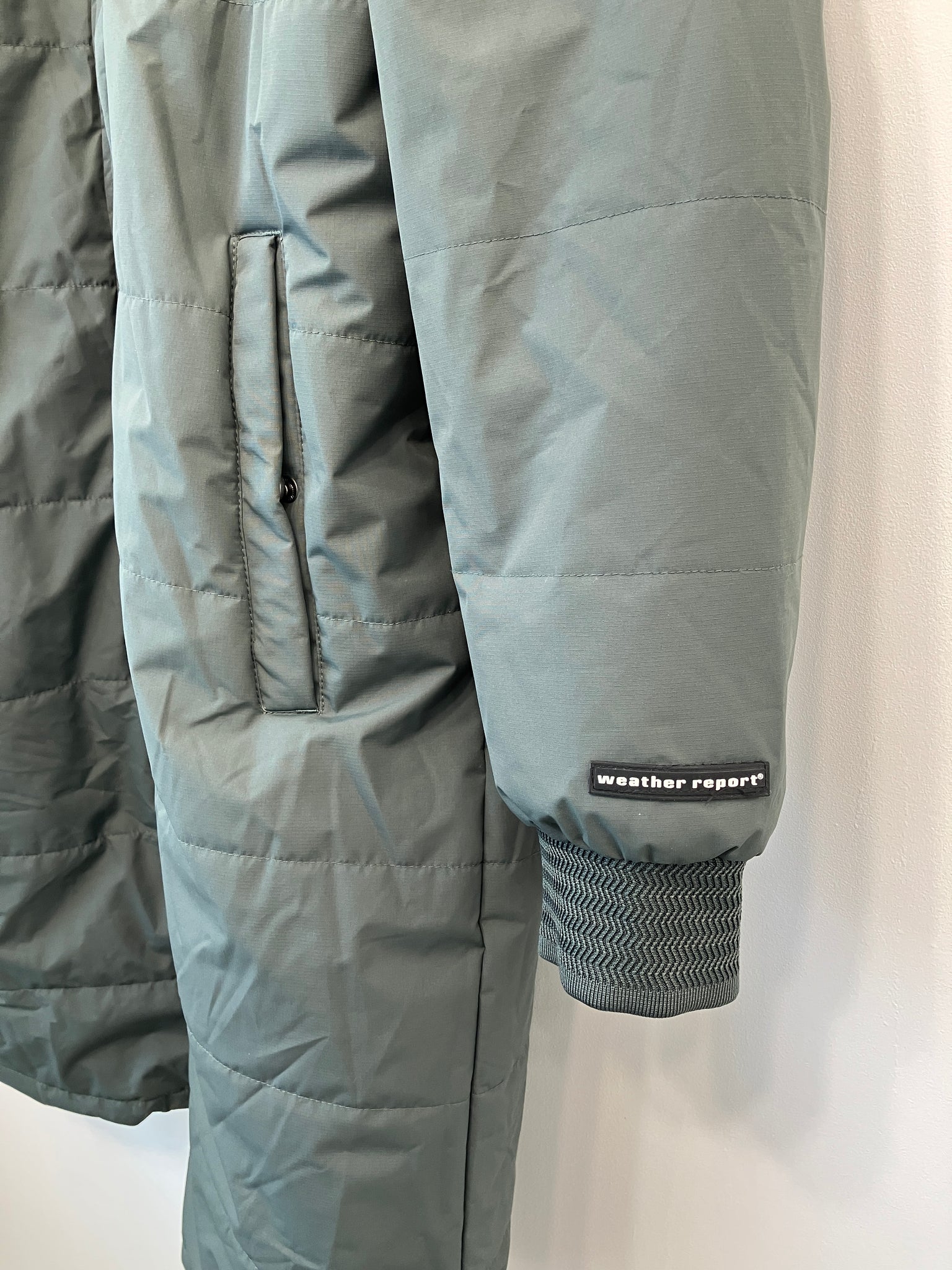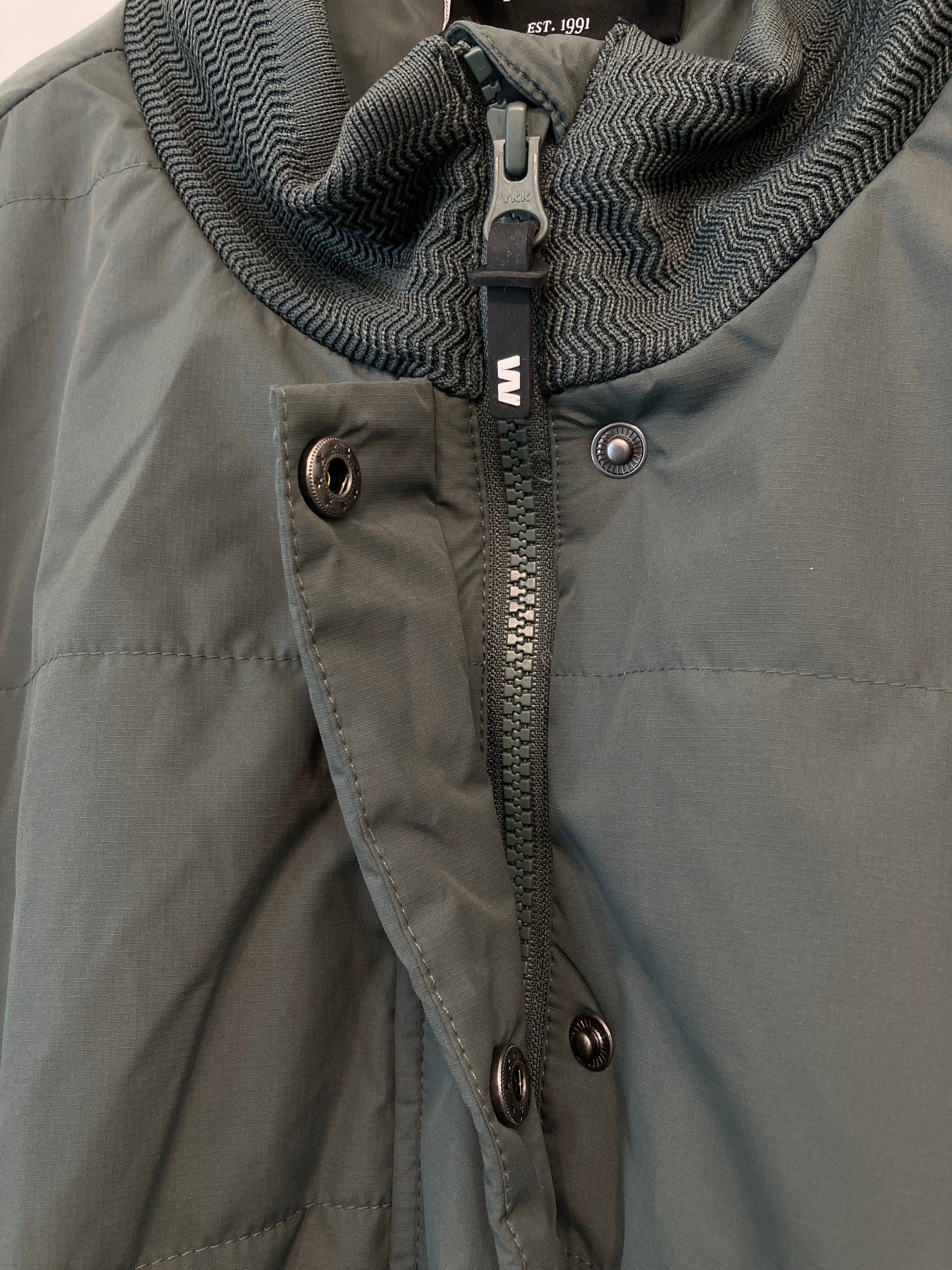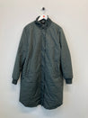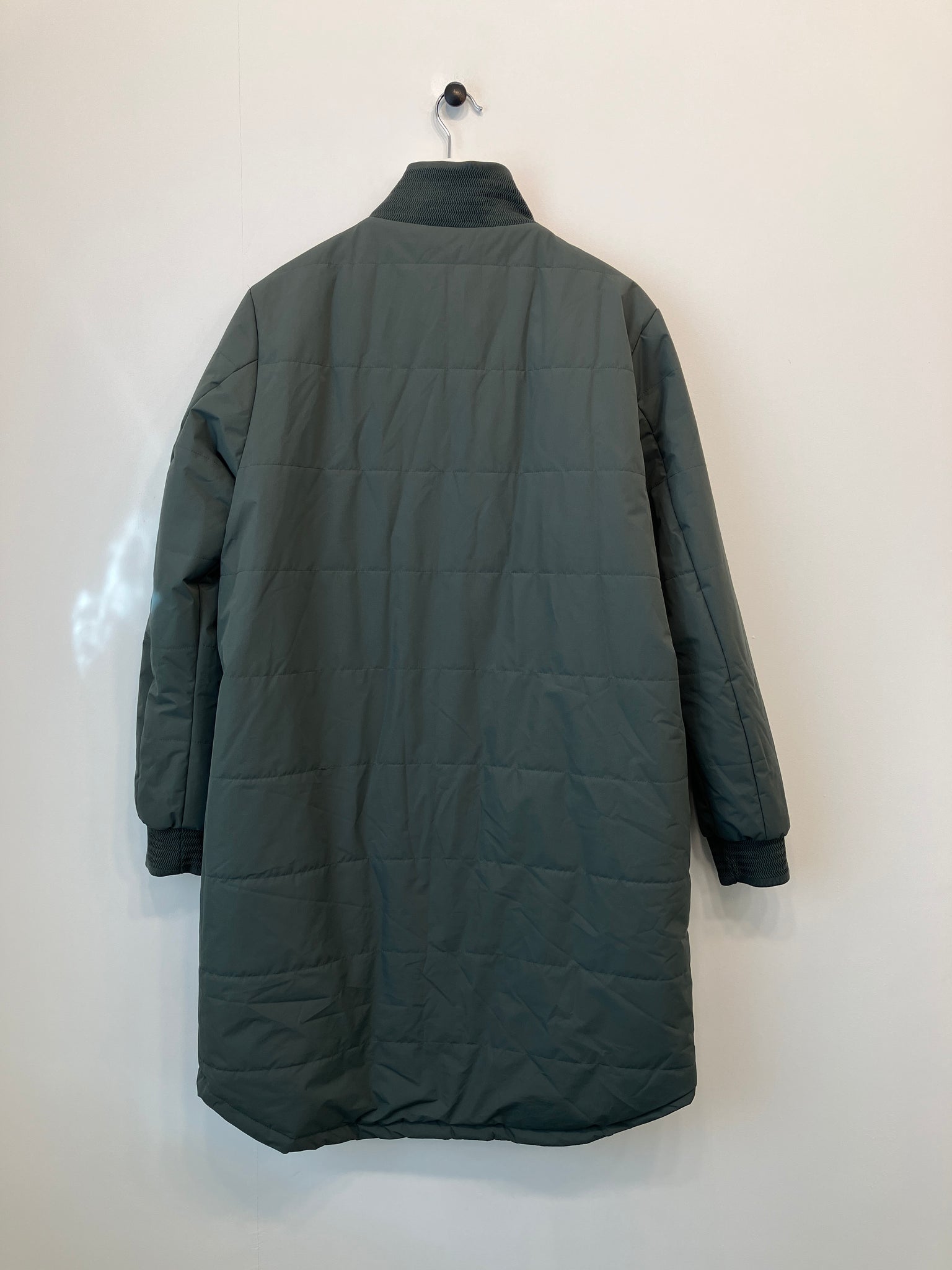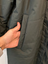 Lun og lang jakke med lynlås-og knaplukning, lommer på front med knaplukning.
