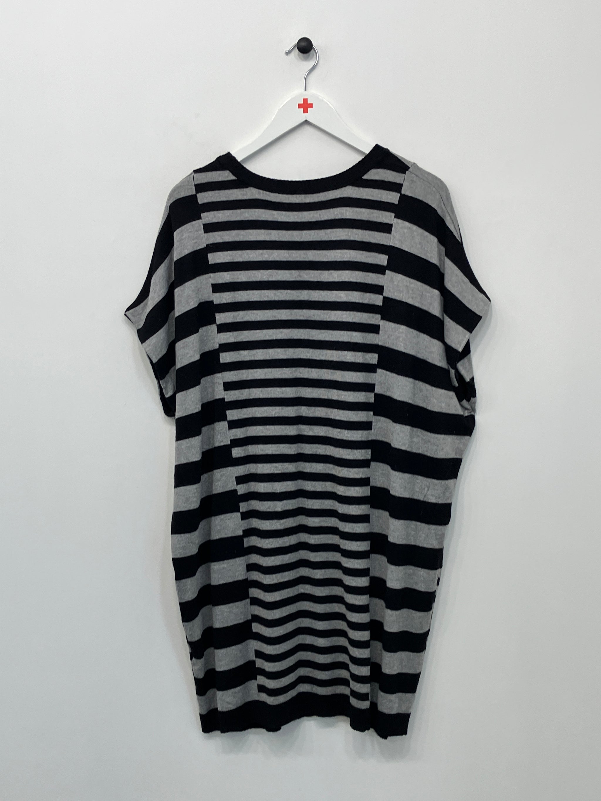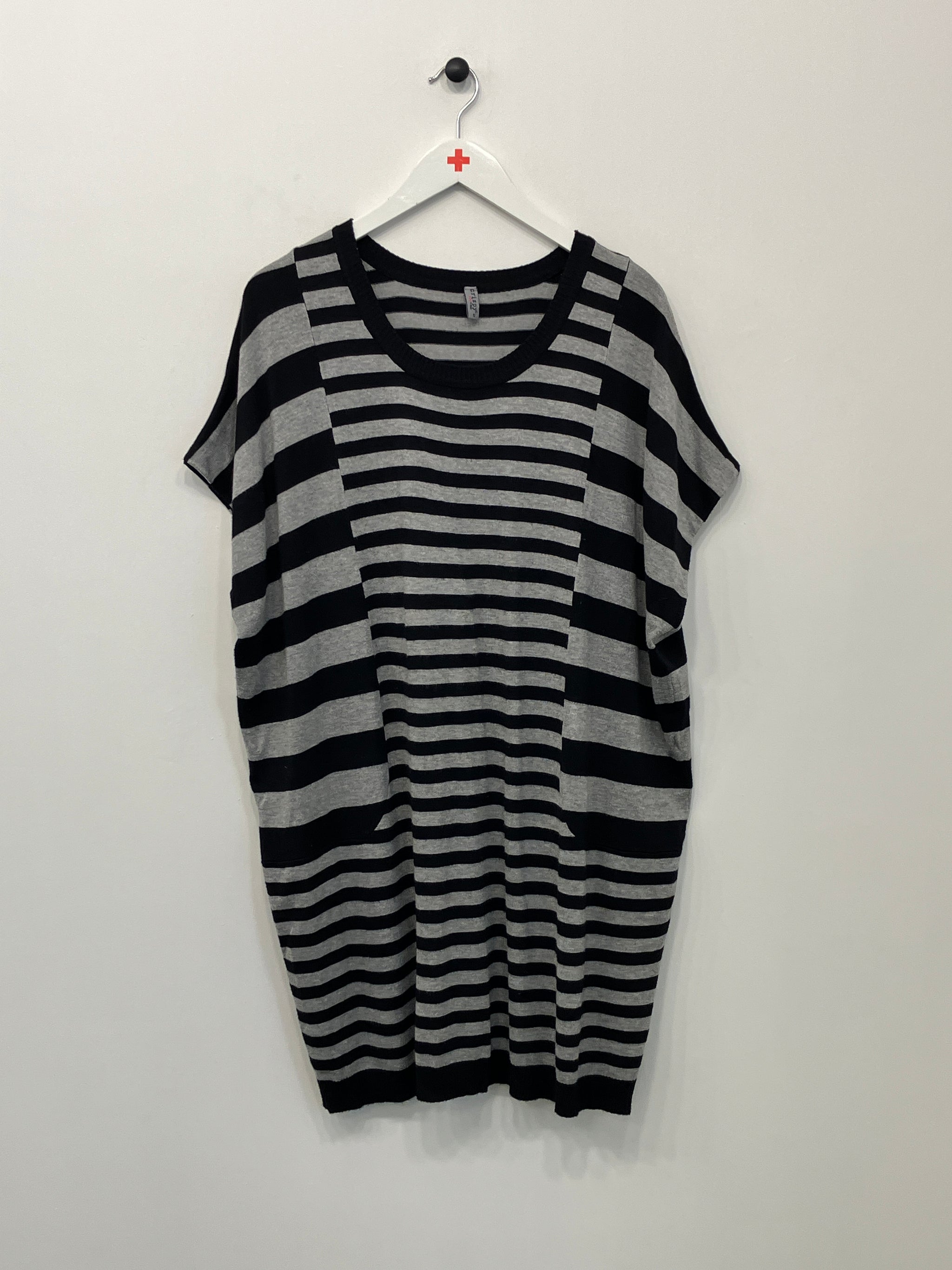 Strikkjole med rund hals og korte ærmer med vidde.