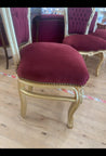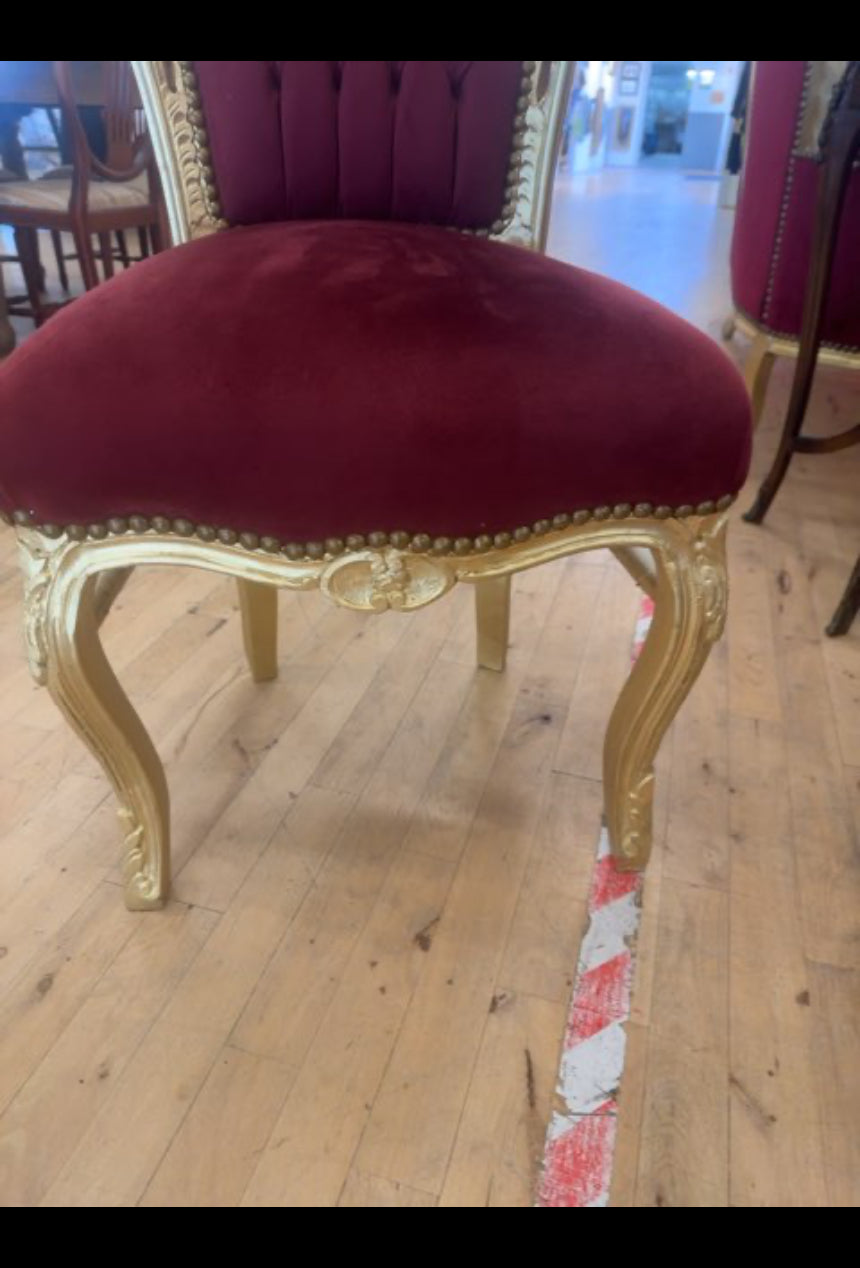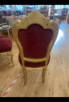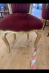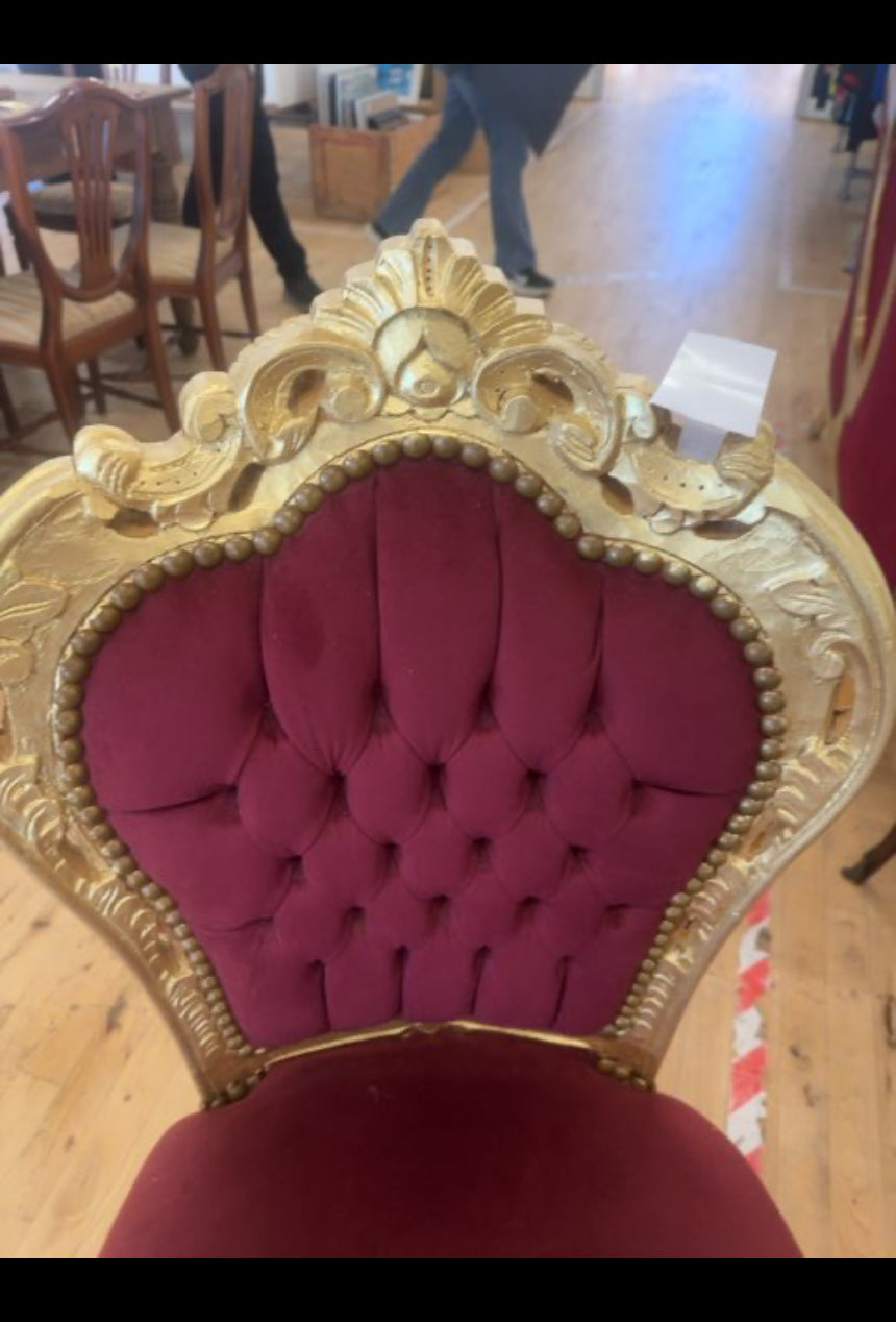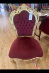 Stolen har en polstret, tuftet ryg og blød sædekomfort. Den er dekoreret med gyldne detaljer.
