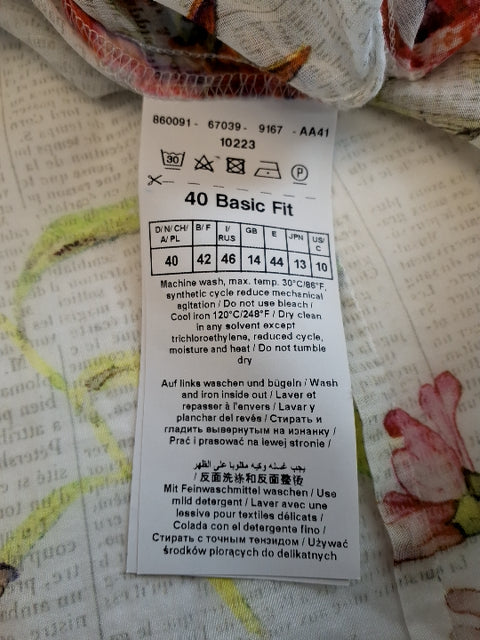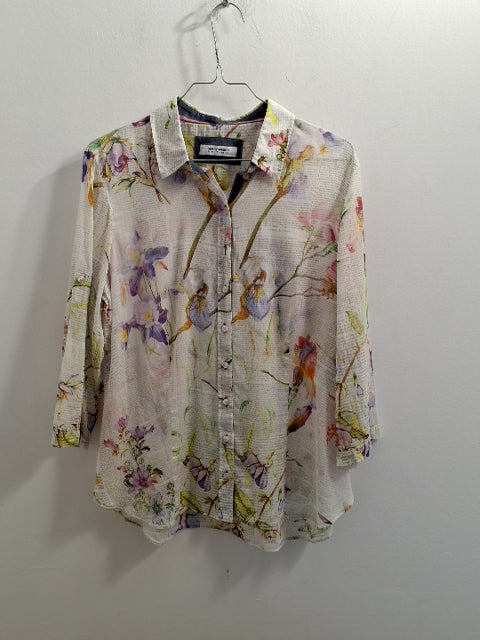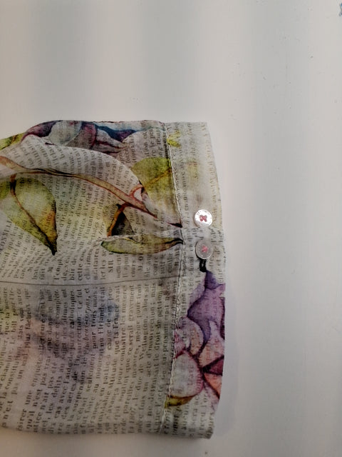 R892 Skjorten har et let og luftigt design med blomster- og fuglemotiv. Den har lange ærmer og knapper.