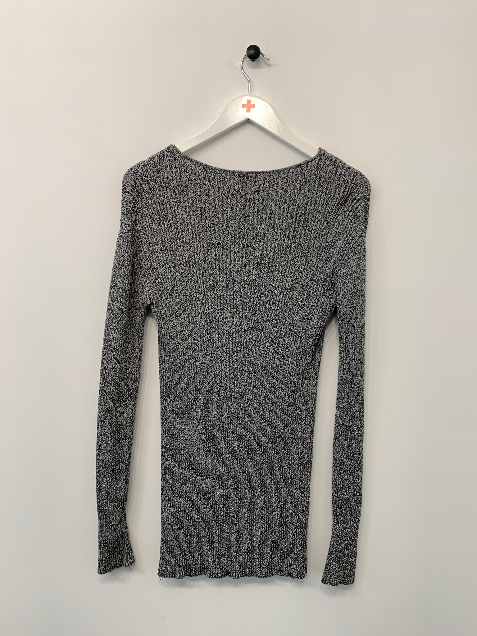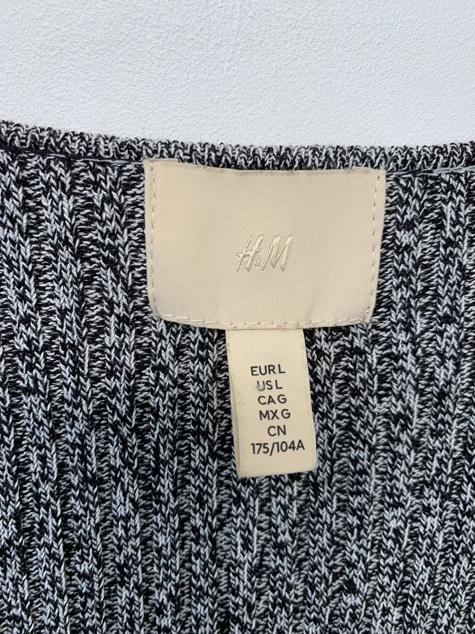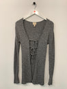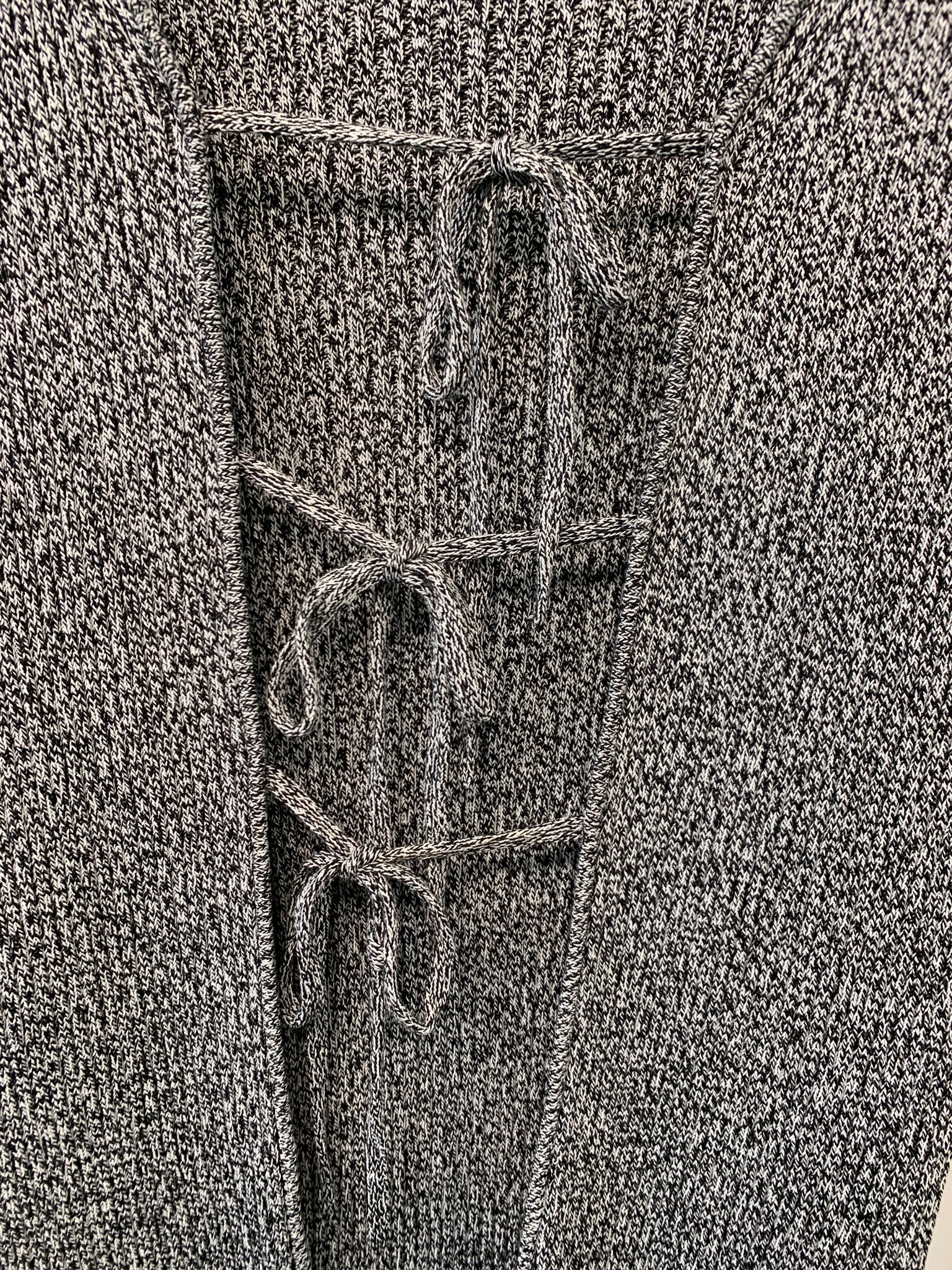 Grå strik cardigan med sløjfer til at binde op og lange ærmer.