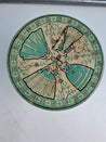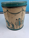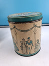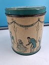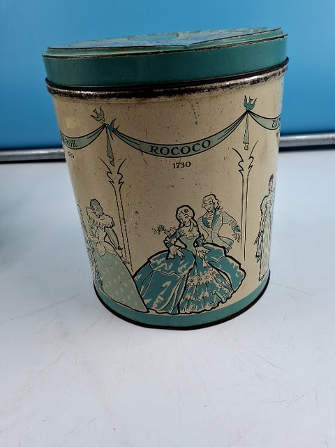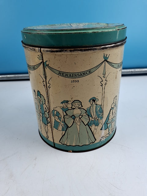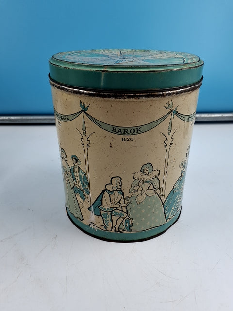 Der er tale om en rund metalæske med et dekorativt låg. Overfladen har en beige farve med illustrationer af moden fra 1550 til 1920, prydet med detaljer i blå og sorte nuancer. Æsken har et vintage udseende og har sandsynligvis været designet til opbevaring. Diameter 19 cm