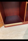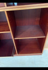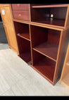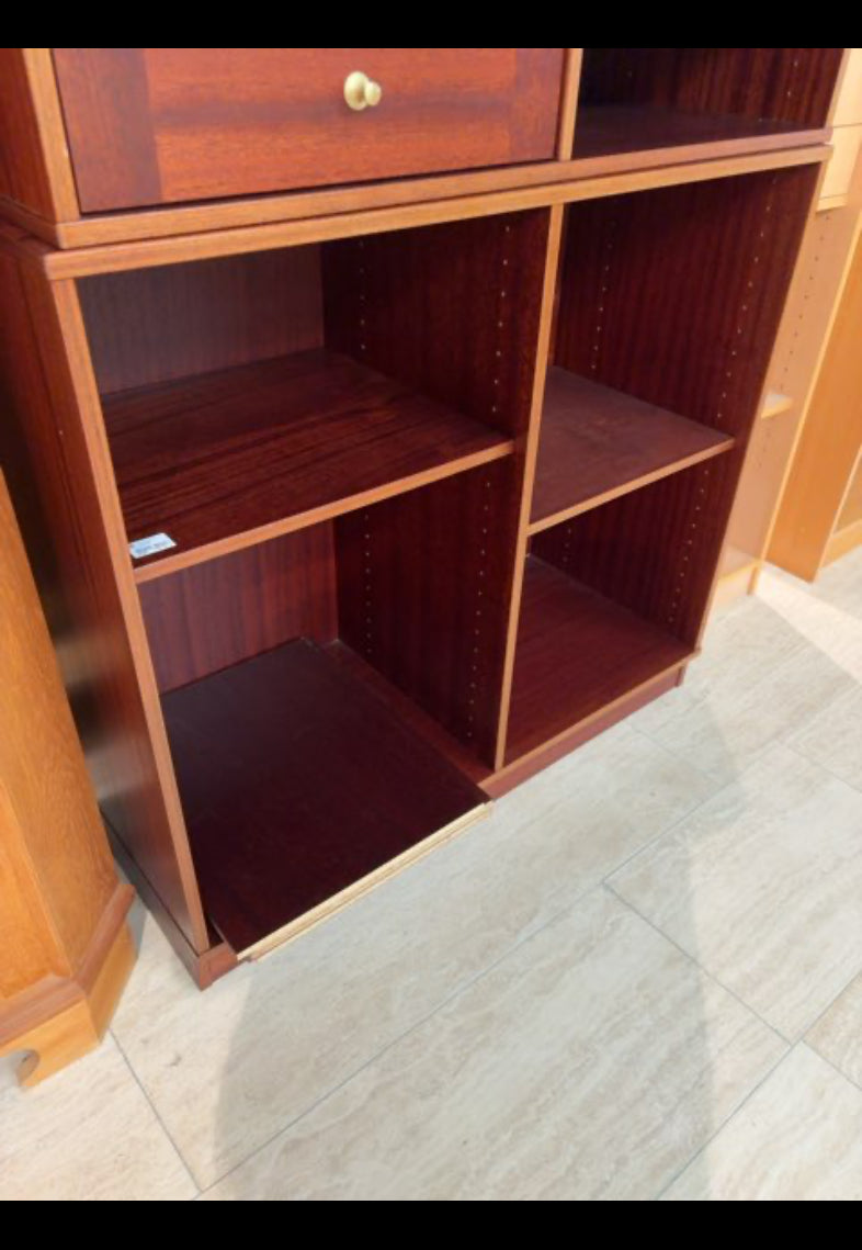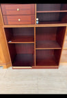 Møblet er en reol med flere åbne hylder og ekstra plader. Det er lavet af mørkt træ med en glat overflade.