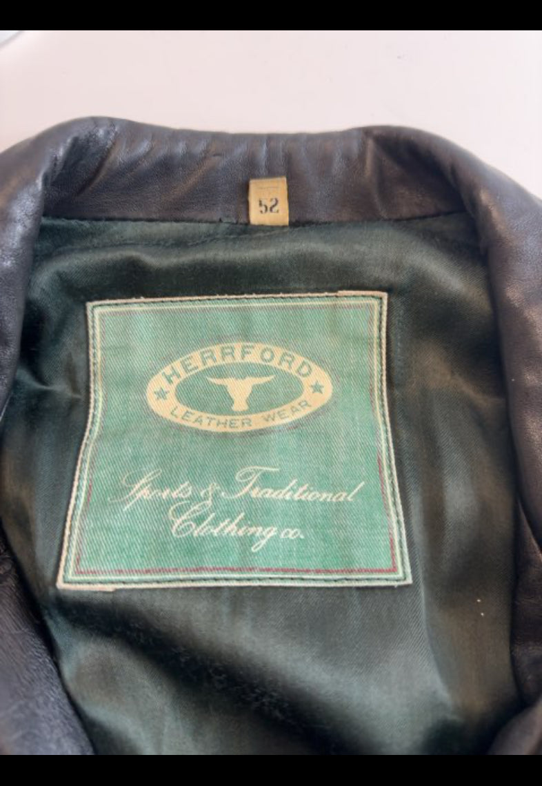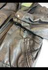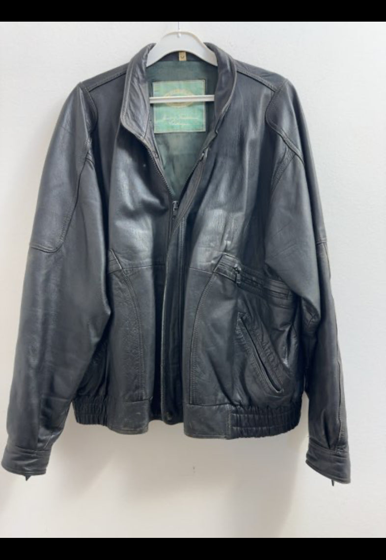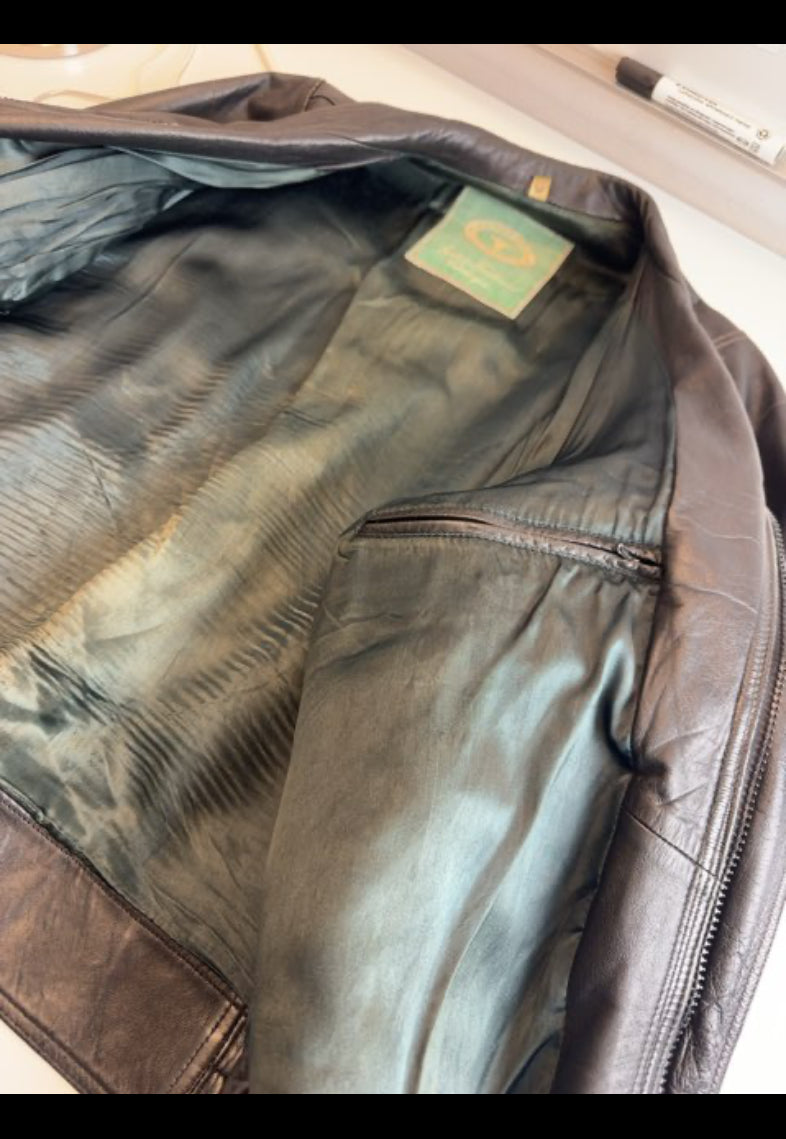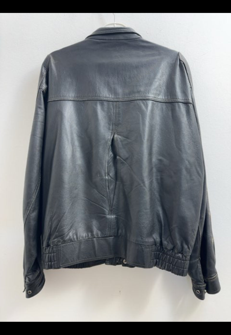 O631 Jakken er lavet af læder, har en høj krave og lynlås. Den har lommer og elastisk kant forneden. Lækker patina. Lynlås virker men er knækket. Pris derefter