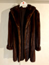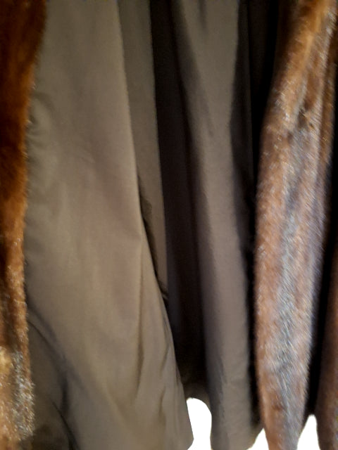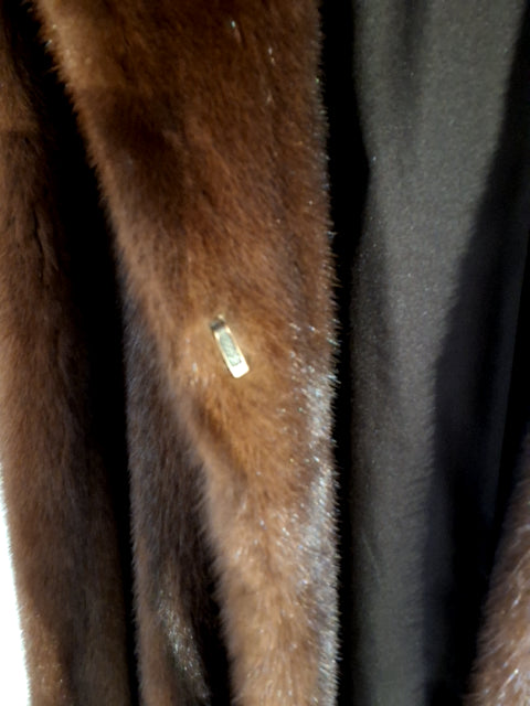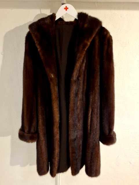 Frakken har en fyldig, blød pelsoverflade med en dybbrun farve og en stor krave.