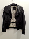 O471 Jakken har en stor krave og en åben front. Den er lavet af læder med en mønstret lining.