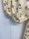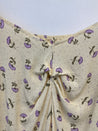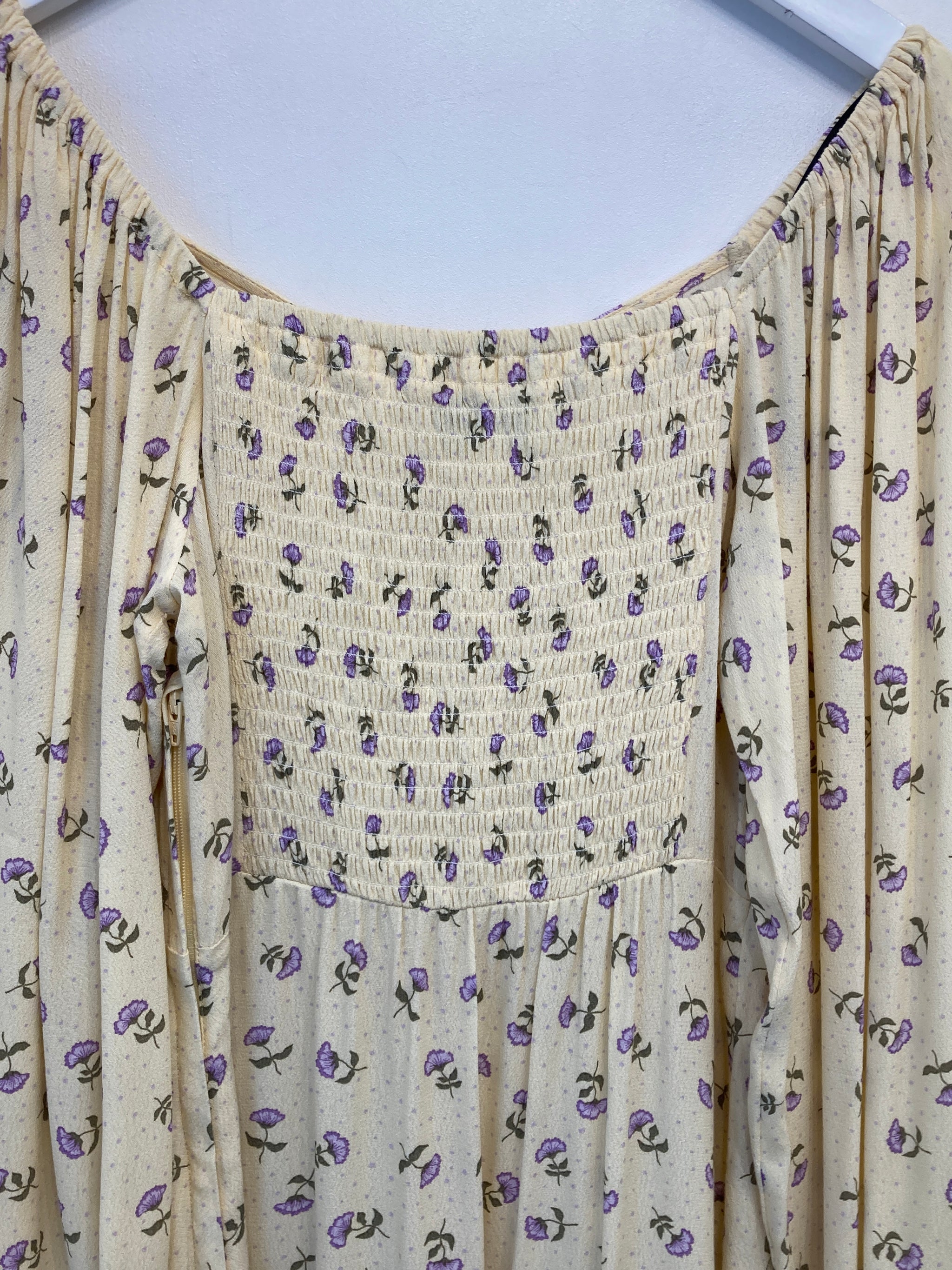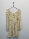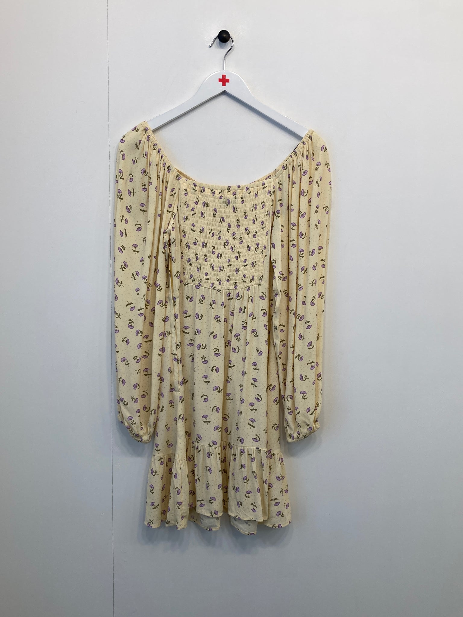 Kjole med flæse, V udskæring med elastik, elastikbånd i ryg, lange ærmer med elastikkant, lynlåslukning i side.