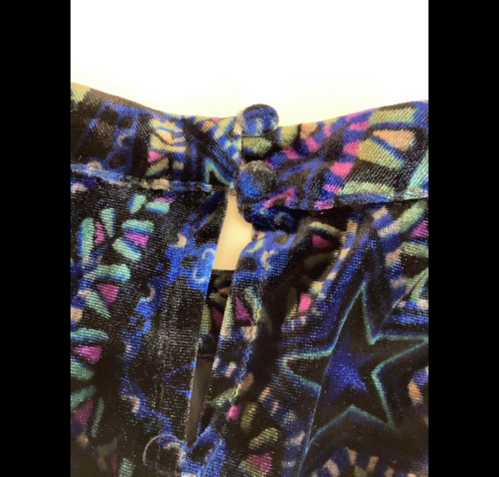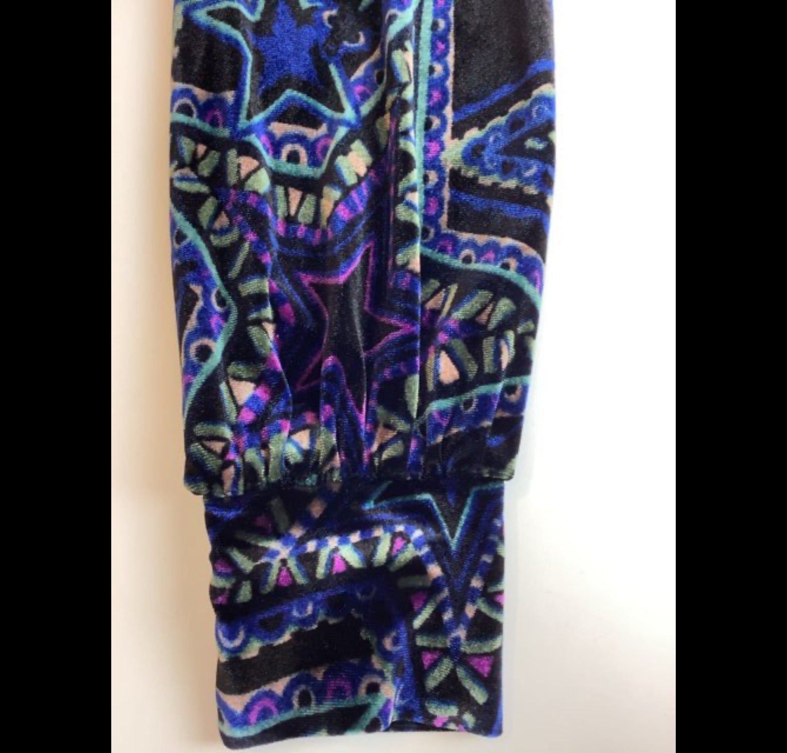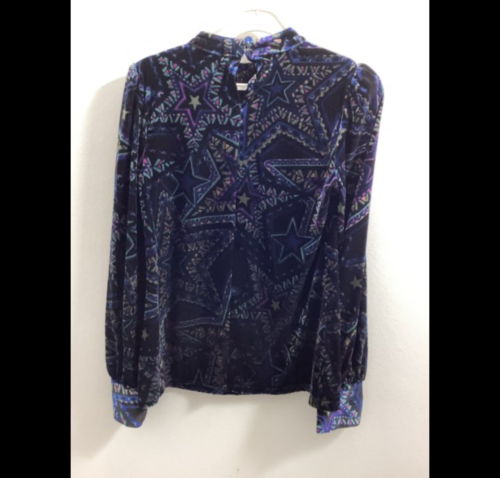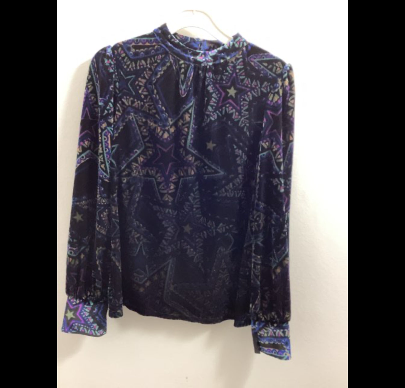 O530 Blusen har lange ærmer, høj hals og et mønster af farverige stjerner. Blødt velour.