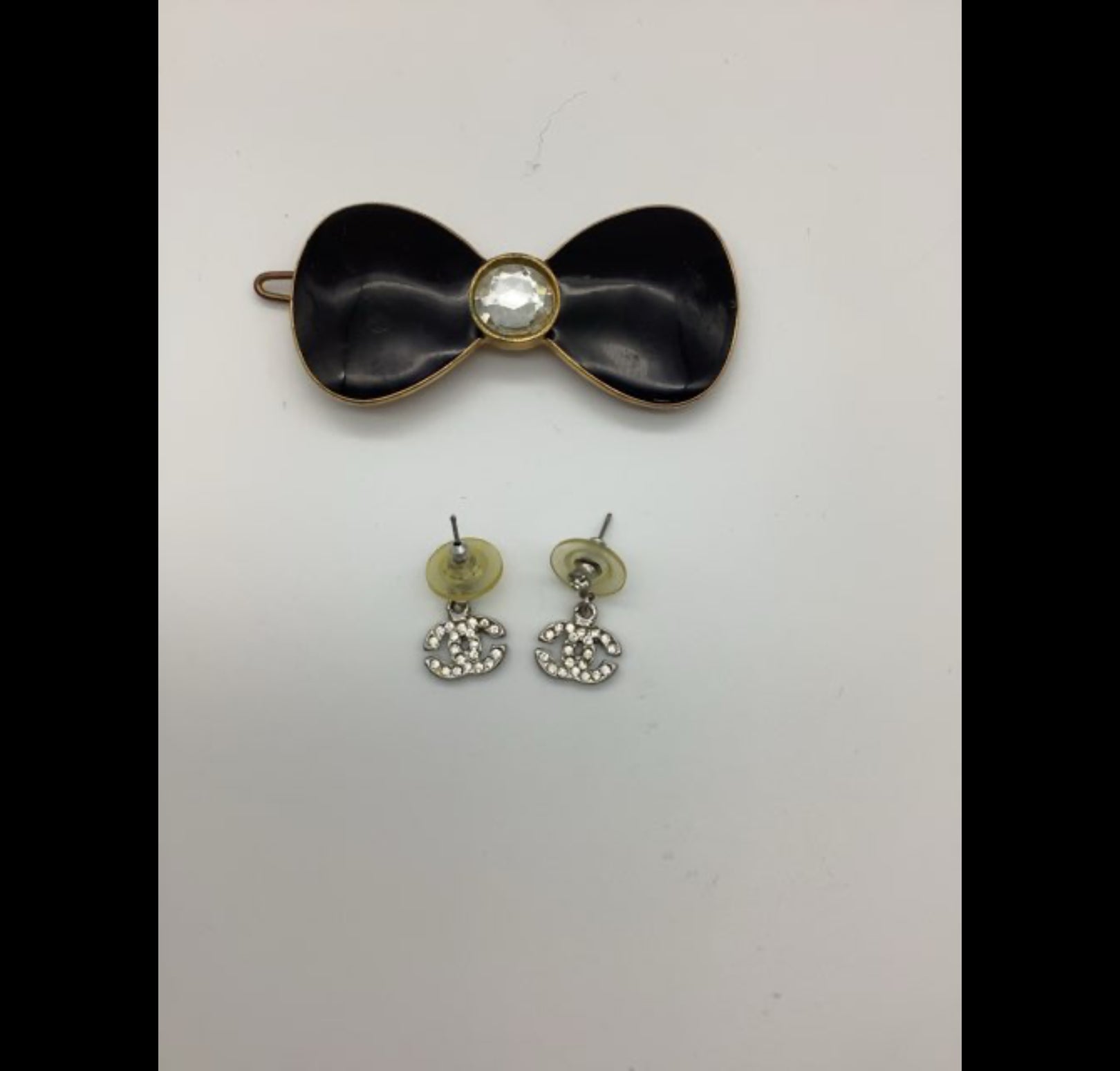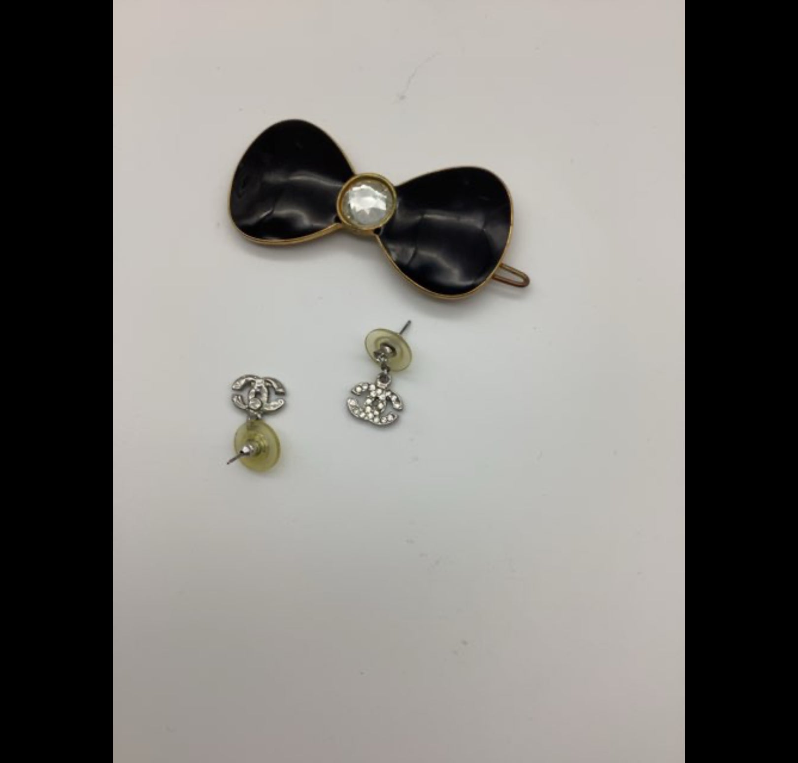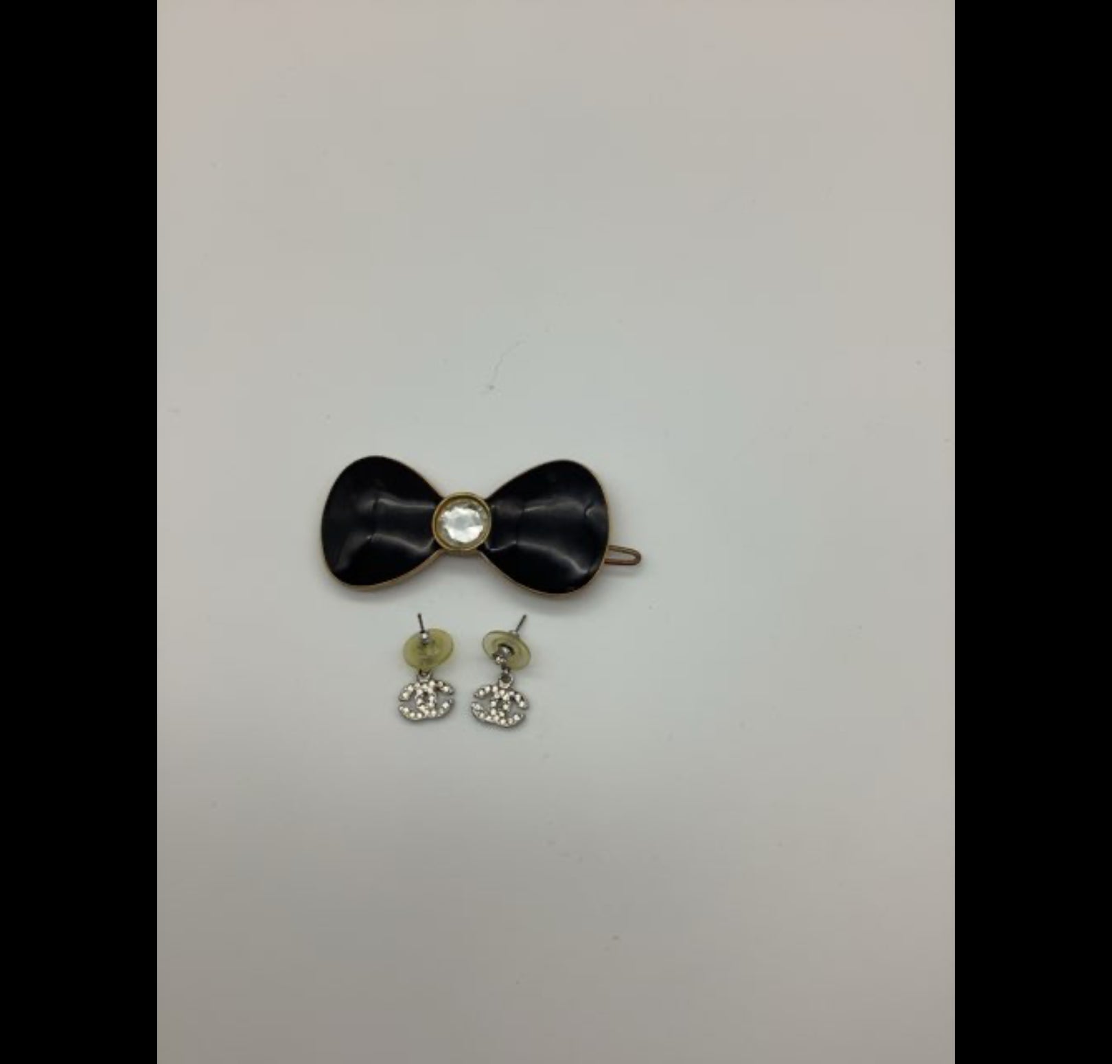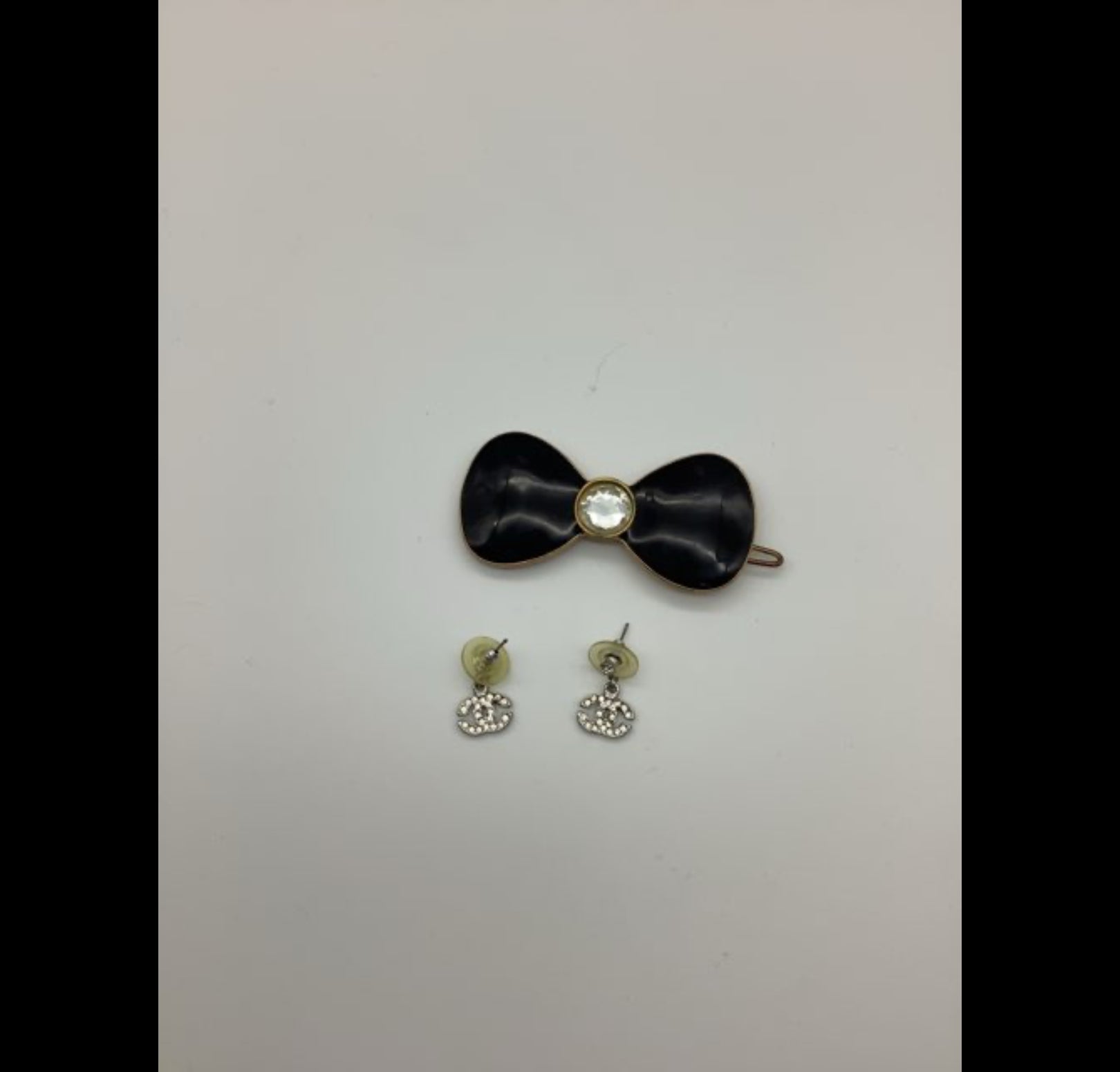 H366 Hårsløjfen er sort med en rhinestones detalje. Øreringene er sølvfarvede med perleform.