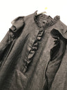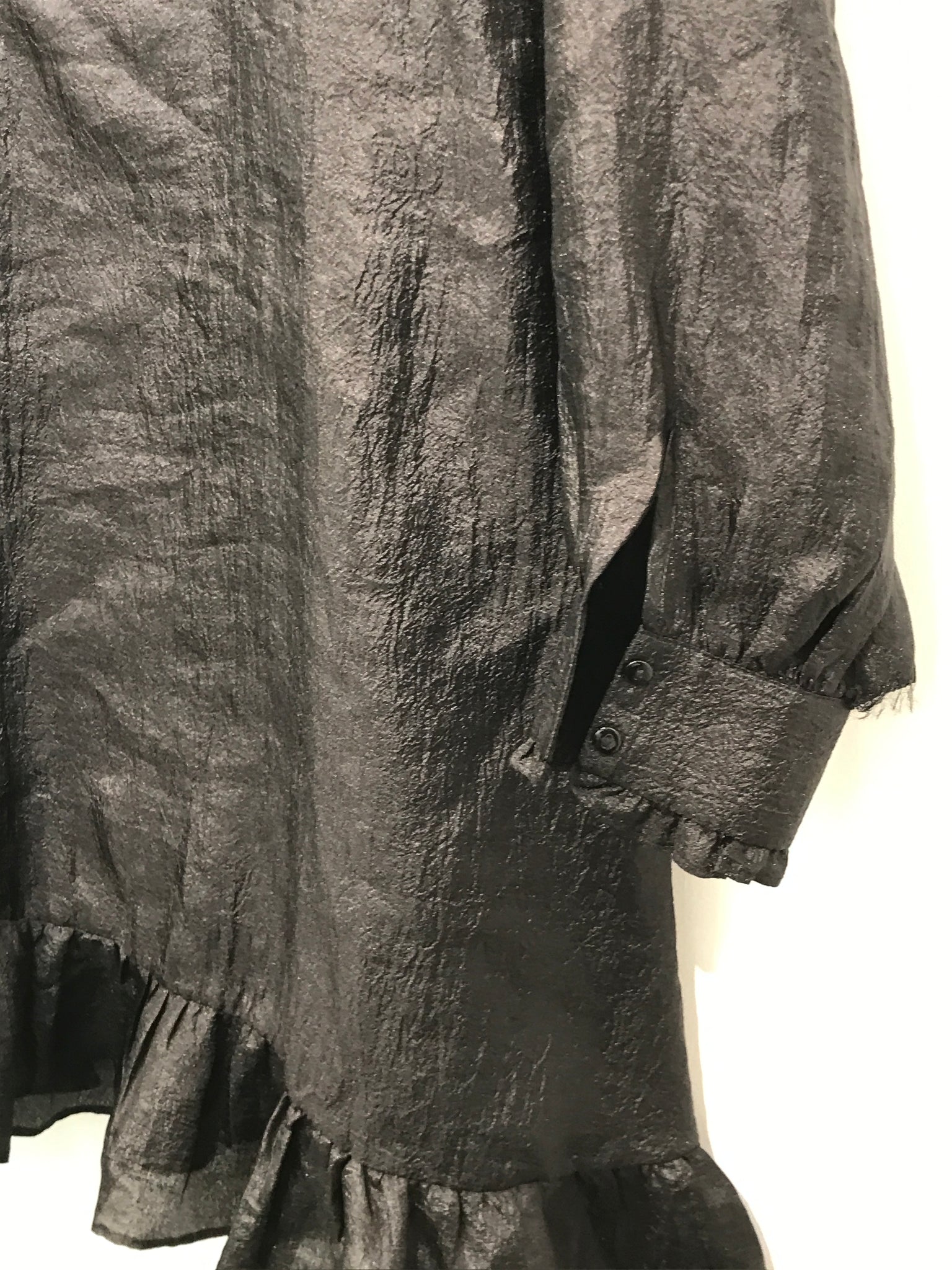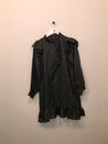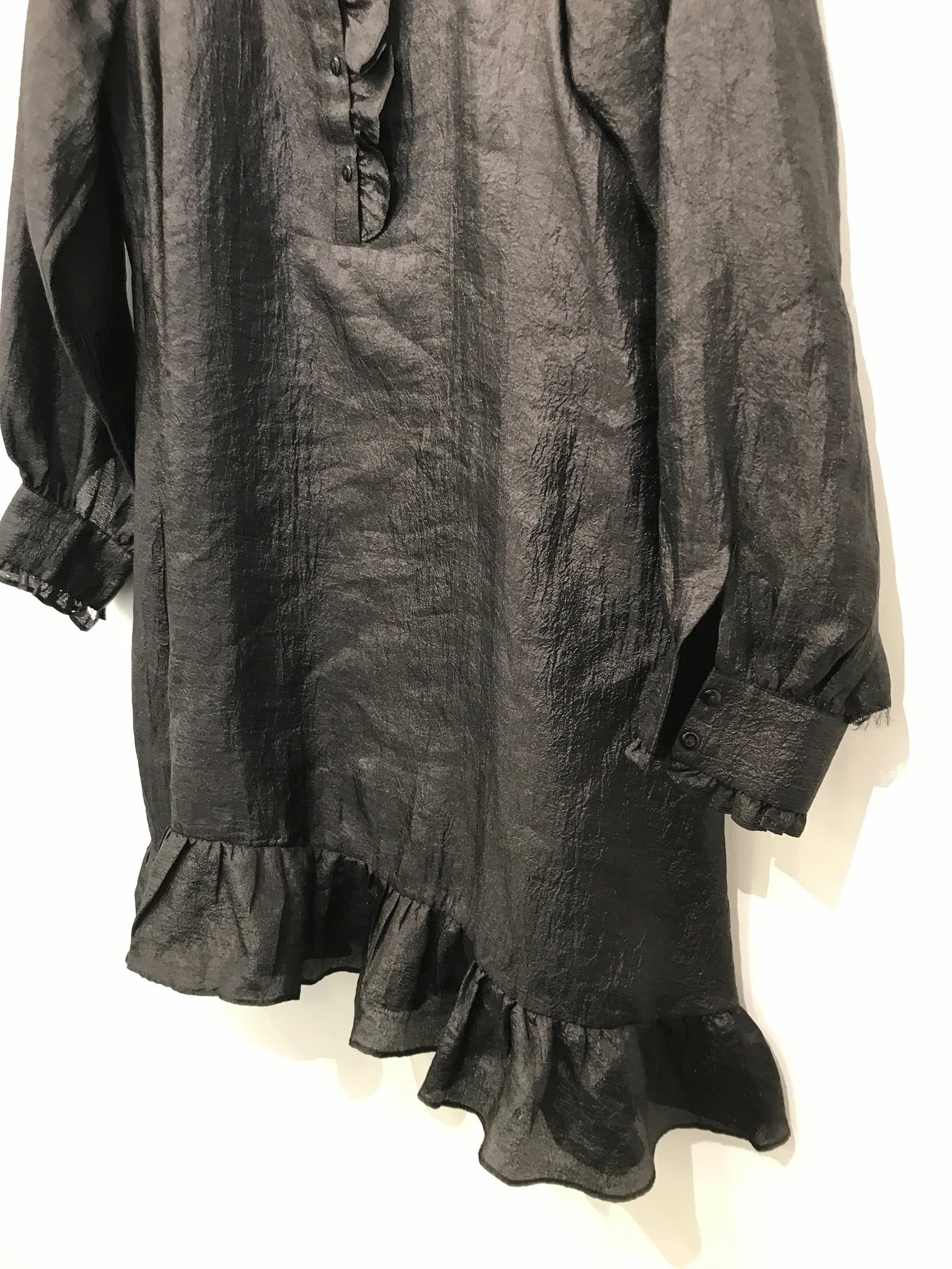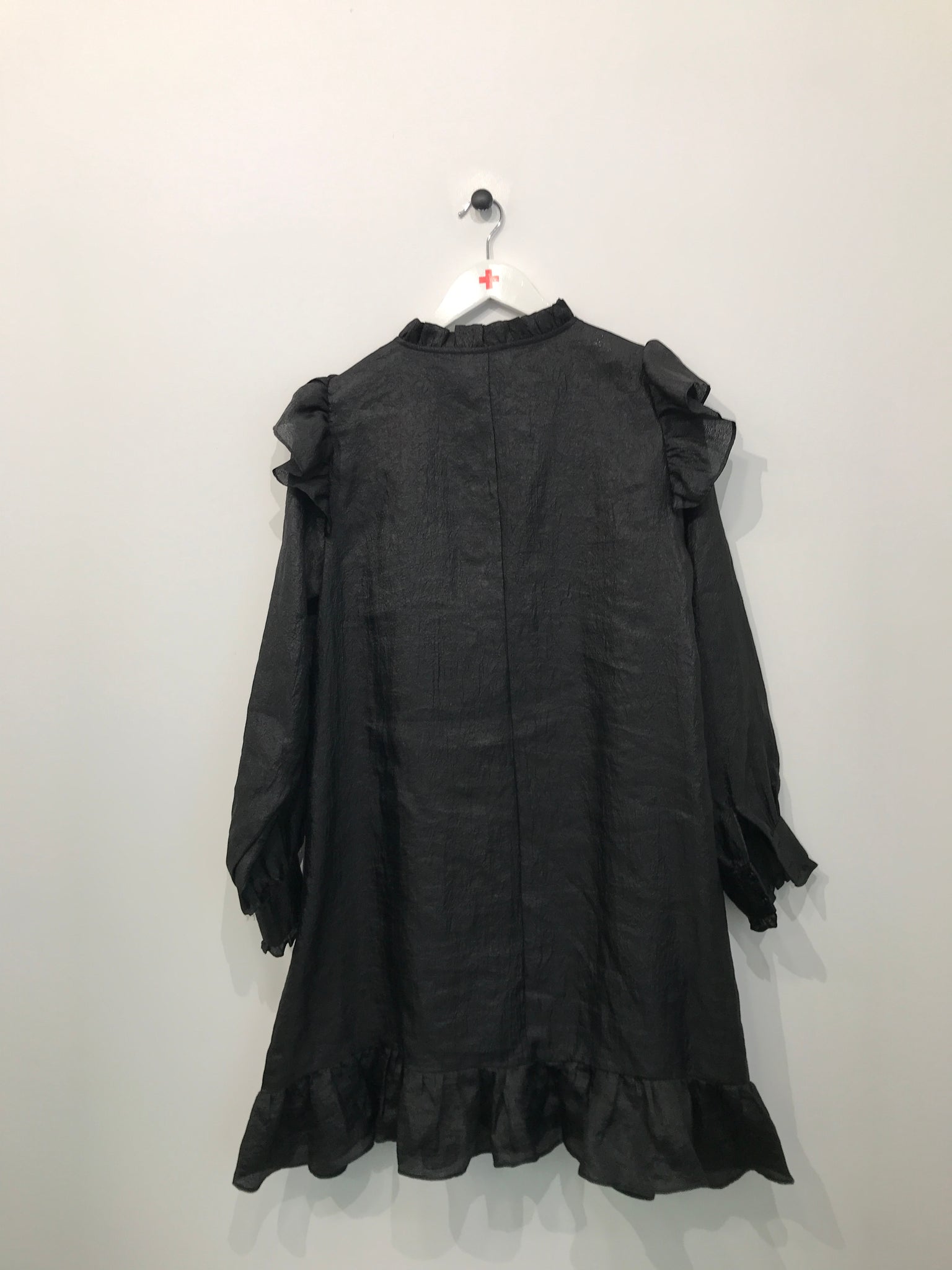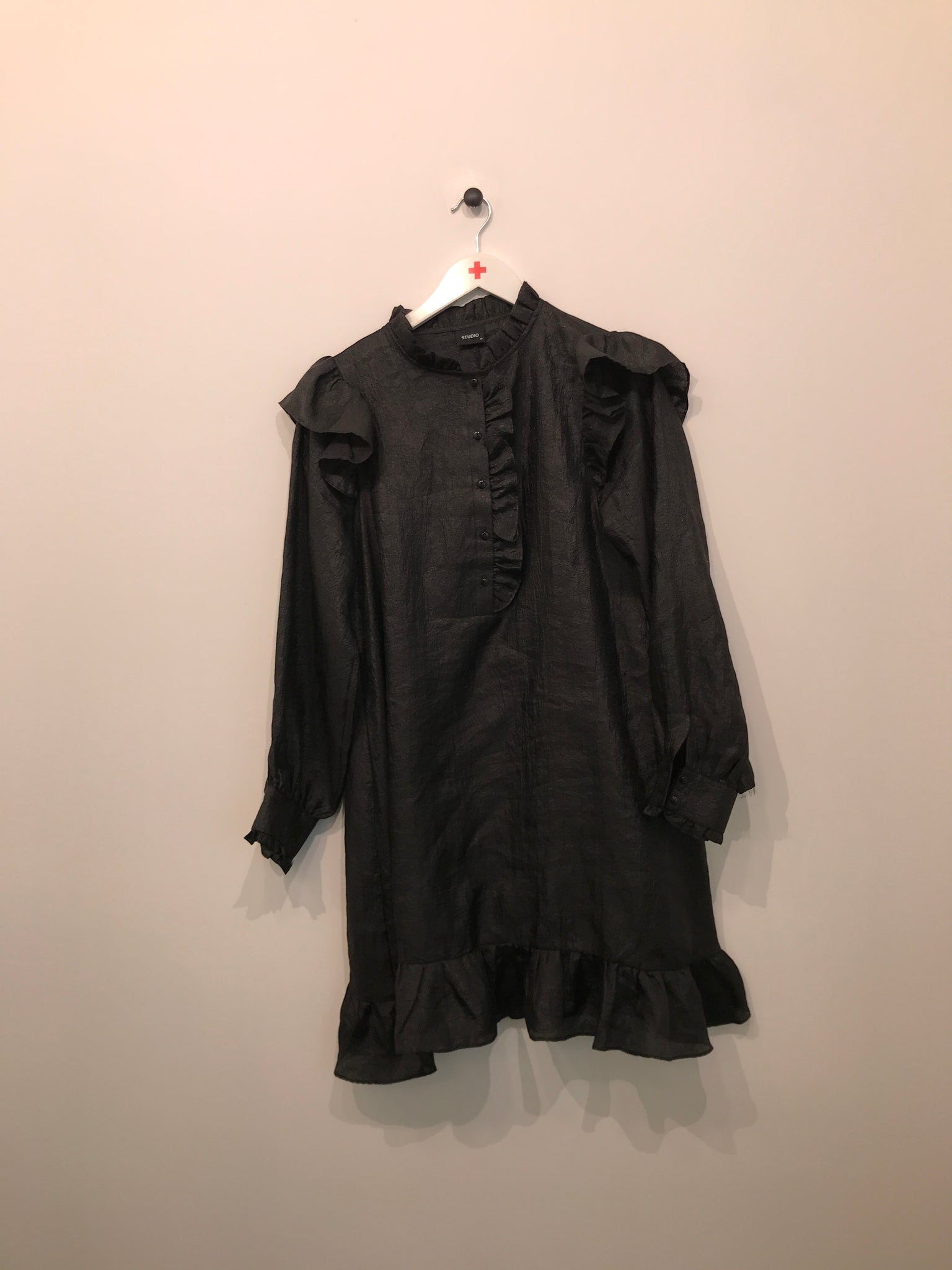 Elegant kjole med lange ærmer, flæsedetaljer og knaplukning foran.