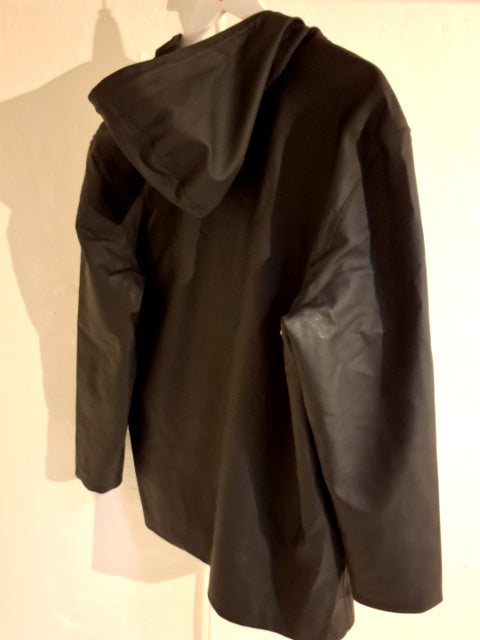 Jakken har en afslappet pasform og en hætte. Den er lavet af slidstærkt materiale med trykknapper. " The Stockholm Coat "